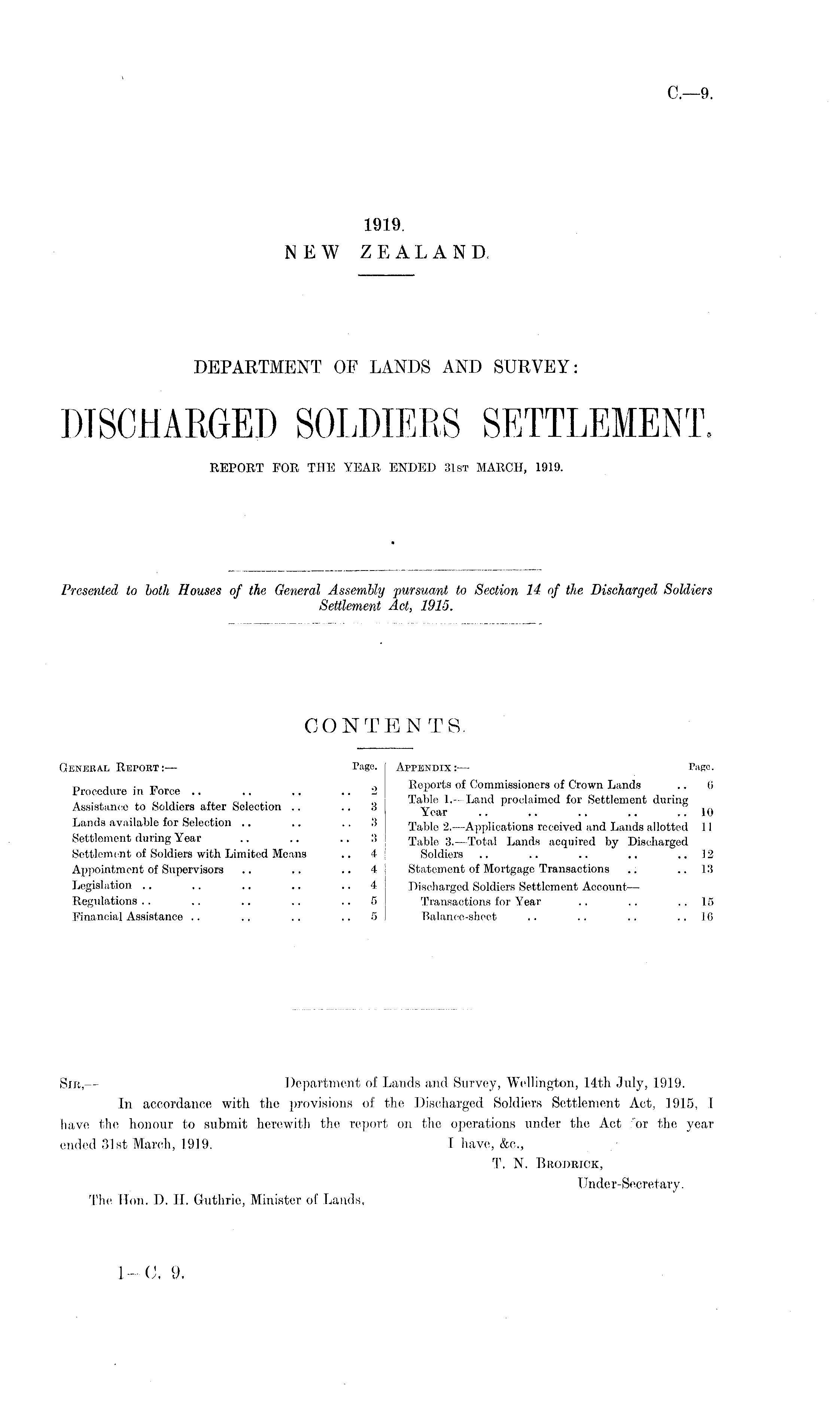 DEPARTMENT OF LANDS AND SURVEY: DISCHARGED SOLDIERS SETTLEMENT. REPORT FOR THE YEAR ENDED 31st MARCH, 1919.