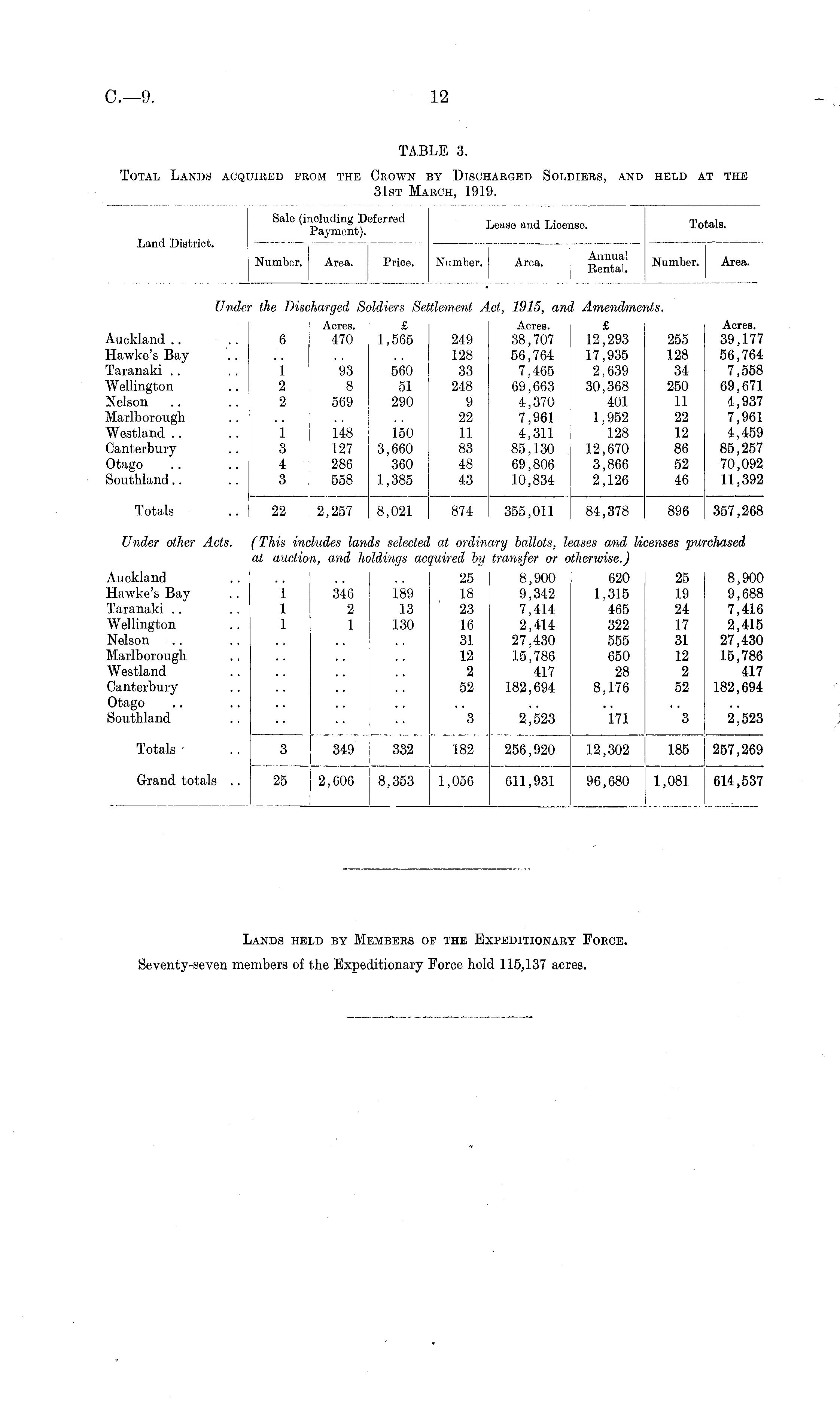 TABLE 3. Total Lands acquired from the Crown by Discharged Soldiers, and held at the 31st March, 1919.