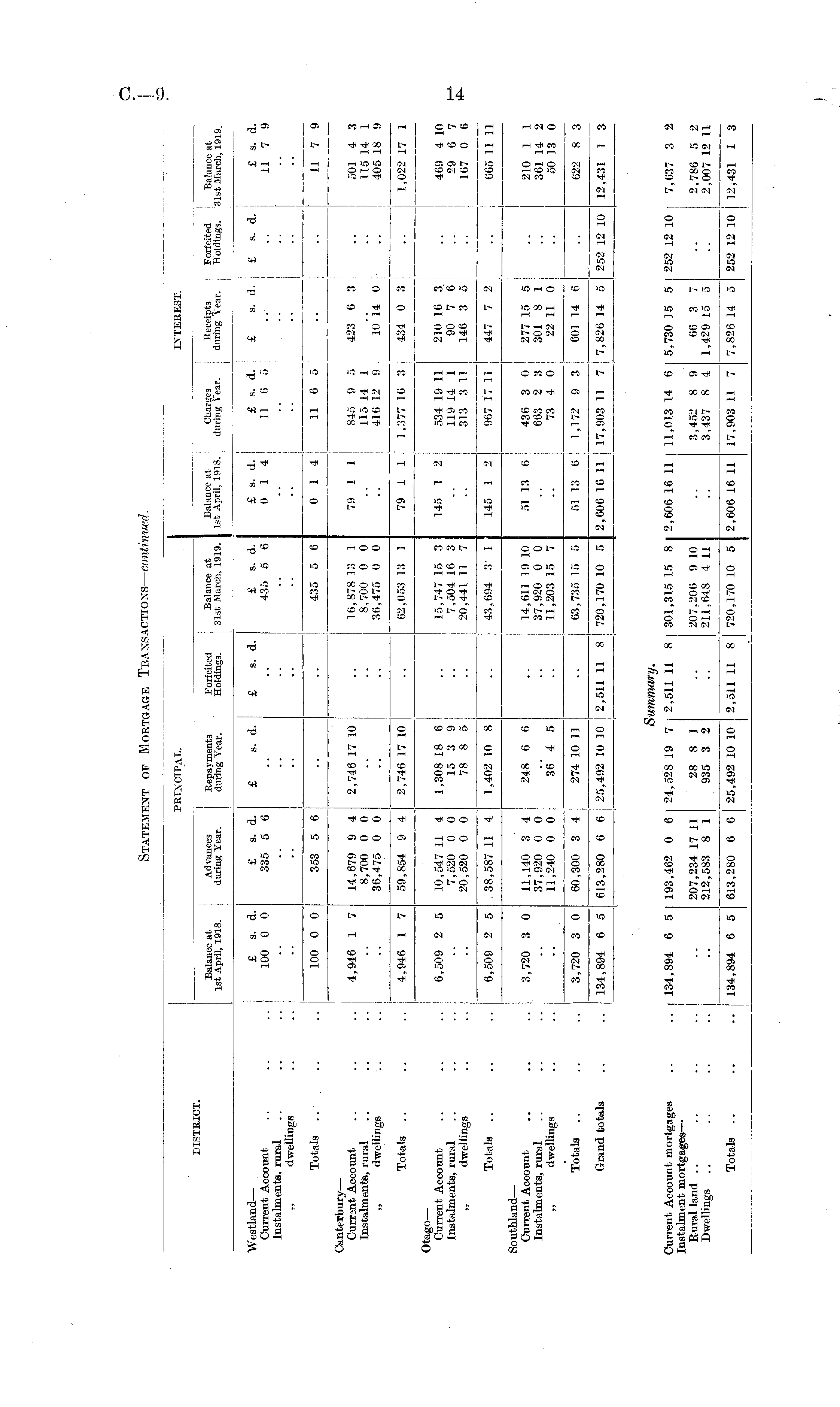 DISTRICT. Balance at 1st April, 1918. PRINCIPAL. Repayments during Y'ear. Forfeited Holdings. Balance at 31st March, 1919. I I .... I INTEREST. Advances during Year. Balance at 1st April, 1918. Charges during Year. Receipts Forfeited Balance at I during Y'ear. ; Holdings. 31st March, 1919. Westland — Current Account Instalments, rural ,, dweUings Totals .. Canterbury — Currant Account Instalments, rural „ dwellings £ s. d. 100 0 0 100 0 0 4,946 1 7 £ s. d. 335 5 6 £ s. d. £ s. d. £ s. d. 435 5 6 £ s. d. 0 1 4 £ s. d. 11 6 5 £ s. d. £ s. d. £ s. d. 11 7 9 •• 100 0 0 353 5 6 435 5 6 0 14 11 6 5 11 7 9 14,679 9 4 8,700 0 0 36,475 0 0 2,746 17 10 16,878 13 1 8,700 0 0 36.475 0 0 79 1 ij 845 9 5 115 14 1 416 12 9 423 6 3 10 14 0 501 4 3 115 14 1 405 18 9 i Totals .. 4,946 1 7 59,854 9 4 2,746 17 10 62,053 13 1 79 1 1 1,377 16 3 434 0 3 1,022 17 1 !- Otago — Current Account Instalments, rural ,, dwellings 6,509 2 5 10,547 11 4 7,520 0 0 20,520 0 0 1,308 18 6 15 3 9 78 8 5 15,747 15 3 7,504 16 3 20,441 11 7 145 1 2 ! 534 19 11 119 14 1 313 3 11 210 16 3 90 7 6 146 3 5 469 4 10 29 6 7 167 0 6 Totals .. 6,509 2 5 . 38,587 11 4 1,402 10 8 43,094 3' 1 145 1 2 ! 967 17 11 i 447 7 2 665 11 11 Southland — Current Account Instalments, rural „ dwellings Totals .. Grand totals 3,720 3 0 3,720 3 0 .. 134,894 6 5 11,140 3 4 37,920 0 0 11,240 0 0 248 6 6 36 4 5 14,611 19 10 37,920 0 0 11,203 15 7 51 13 6' 436 3 0 663 2 3 73 4 0 277 15 5 301 8 1 22 11 0 210 1 1 361 14 2 50 13 0 60,300 3 4 274 10 11 63,735 15 5 51 13 6 ! 1,172 9 3 I 601 14 0 622 8 3 613,280 6 6 25,492 10 10 2,511 11 8 720,170 10 5 2,600 16 11 ; 17,903 11 7 7,826 14 5 252 12 10 12,431 1 Current Account mortgages Instalment mortgages — Rural land .. DweUings Totals .. .. 134,894 6 5 .. 134,894 6 5 iummary. 193,462 0 6 24,528 19 7 2,511 11 8 301,315 15 8 2,606 16 11 11,013 14 6 5,730 15 5 252 12 10 7,637 3 2 207,234 17 11 212,583 8 1 28 8 1 935 3 2 207,206 9 10 211,648 4 11 3,452 8 9 3,437 8 4 66 3 7 1,429 15 5 2,786 5 2 2,007 12 11 613,280 6 6 25,492 10 10 2,511 11 8 720,170 10 5 2,606 16 11 17,903 11 7 7,826 14 5 252 12 10 12,431 I 3