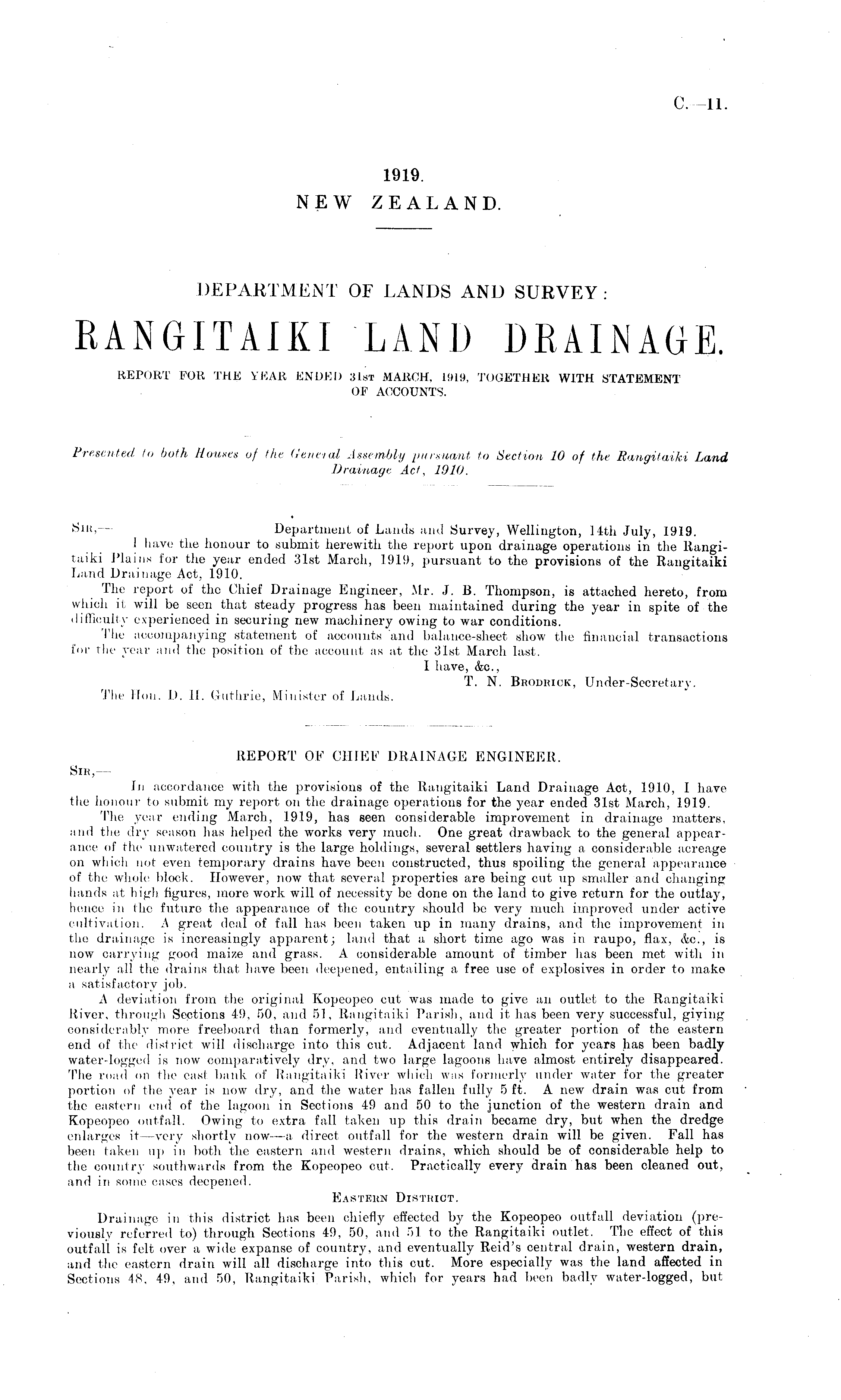 DEPARTMENT OF LANDS AND SURVEY: RANGITAIKI LAND DRAINAGE. REPORT FOR THE YEAR ENDED 31st MARCH, 1919, TOGETHER WITH STATEMENT OF ACCOUNTS.