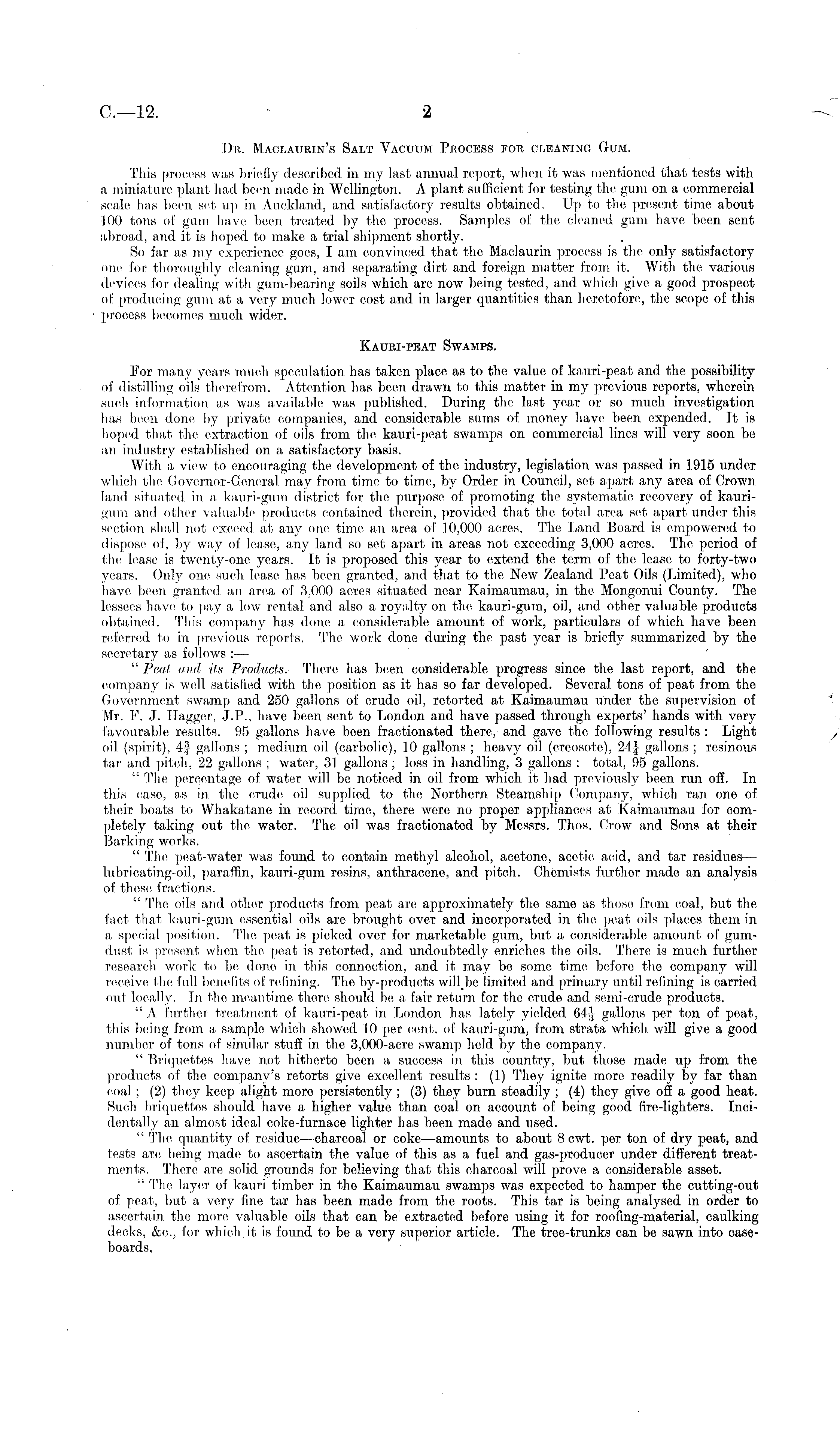 Dr. Maclaurin's Salt Vacuum Process for cleaning Gum. This process was briefly described in my last annual report, when it was mentioned that tests with a miniature plant had been made in Wellington. A plant sufficient for testing the gum on a commercial scale has been set up in Auckland, and satisfactory results obtained. Up to the present time about 100 tons of gum have been treated by the process. Samples of the cleaned gum have been sent abroad, and it is hoped to make a trial shipment shortly. So far as my experience goes, I am convinced that the Maclaurin process is the only satisfactory one for thoroughly cleaning gum, and separating dirt and foreign matter from it. With the various devices for dealing with gum-bearing soils which arc now being tested, and which give a good prospect ol producing gum at a very much lower cost and in larger quantities than heretofore, the scope of this process becomes much wider. Kauri-peat Swamps. For many years much speculation has taken place as to the value of kauri-peat and the possibility of distilling oils therefrom. Attention has been drawn to this matter in my previous reports, wherein such information as was available was published. During the last year or so much investigation has been done by private companies, and considerable sums of money have been expended. It is hoped that the extraction of oils from the kauri-peat swamps on commercial lines will very soon be an industry established on a satisfactory basis. With a view to encouraging the development of the industry, legislation was passed in 1915 under which the Governor-General may from time to time, by Order in Council, set, apart any area of Crown, land situated in a. kauri-gum district for the purpose of promoting the systematic recovery of kaurigum and other valuable products contained therein, provided that the total area set apart under this section shall not, exceed tit any one time an area of 10,000 acres. The Land Board is empowered to dispose of, by way of lease, any land so set apart in areas not exceeding 3,000 acres. The period of the lease is twenty-one years. It is proposed this year to extend the term of the lease to forty-two years. Only one such lease has been granted, and that to the New Zealand Peat Oils (Limited), who have been granted an area of 3,000 acres situated near Kaimaumau, in the Mongonui County. The lessees have to pay a low rental and also a royalty on the kauri-gum, oil, and other valuable products obtained. This company has done a considerable amount of work, particulars of which have been referred to in previous reports. The work done during the past year is briefly summarized by the secretary as follows : — " Peat and its Products. —There has been considerable progress since the last report, and the company is well satisfied with the position as it has so far developed. Several tons of peat from the Government swamp and 250 gallons of crude oil, retorted at Kaimaumau under the supervision of Mr. F. J. Hagger, J.P., have been sent to London and have passed through experts' hands with very favourable results. 95 gallons have been fractionated there, and gave the following results : Light oil (spirit), 4f gallons ; medium oil (carbolic), 10 gallons ; heavy oil (creosote), 21} gallons ; resinous tar and pitch, 22 gallons ; water, 31 gallons ; loss in handling, 3 gallons : total, 95 gallons. " The percentage of water will be noticed in oil from which it had previously been run off. In this case, as in the crude oil supplied to the Northern Steamship Company, which ran one of their boats to Whakatane in record, time, there were no proper appliances at Kaimaumau for completely taking out the water. The oil was fractionated by Messrs. Thos. Crow and Sons at their Barking works. " The peat-water was found to contain methyl alcohol, acetone, acetic, acid, and tar residues— lubricating-oil, paraffin, kauri-gum resins, anthracene, and pitch. Chemists further made an analysis of these fractions. " The oils and. other products from peat are approximately the same as those from coal, but the fact that kauri-gum essential oils are brought over and incorporated in the peat, oils places them in a special position. The peat is picked over for marketable gum, but a considerable amount of gumdust is present when the peat is retorted, and undoubtedly enriches the oils. There is much further research work to be done in this connection, and it may be some, time before the company will receive the full benefits of refining. The by-products will_be limited and primary until refining is carried out locally. In the meantime there should, be a fair return for the crude and semi-crude products. " A further treatment of kauri-peat in London has lately yielded 64| gallons per ton of peat, this being from a sample which showed 10 per cent, of kauri-gum, from strata which will give a good number of tons of similar stuff in the 3,000-acre swamp held by the company. " Briquettes have not hitherto been a success in this country, but those made up from the products of the company's retorts give excellent results : (1) They ignite more readily by far than coal; (2) they keep alight more persistently ; (3) they burn steadily ; (4) they give off a good heat. Such briquettes should have a higher value than coal on account of being good fire-lighters. Incidentally an almost ideal coke-furnace lighter has been made and used. " The quantity of residue—charcoal or coke —amounts to about 8 cwt. per ton of dry peat, and tests are being made to ascertain the value of this as a fuel and gas-producer under different treatments. There are solid grounds for believing that this charcoal will prove a considerable asset. " The layer of kauri timber in the Kaimaumau swamps was expected to hamper the cutting-out of peat, but a very fine tar has been made from the roots. This tar is being analysed in order to ascertain the more valuable oils that can be extracted before using it for roofing-ma
