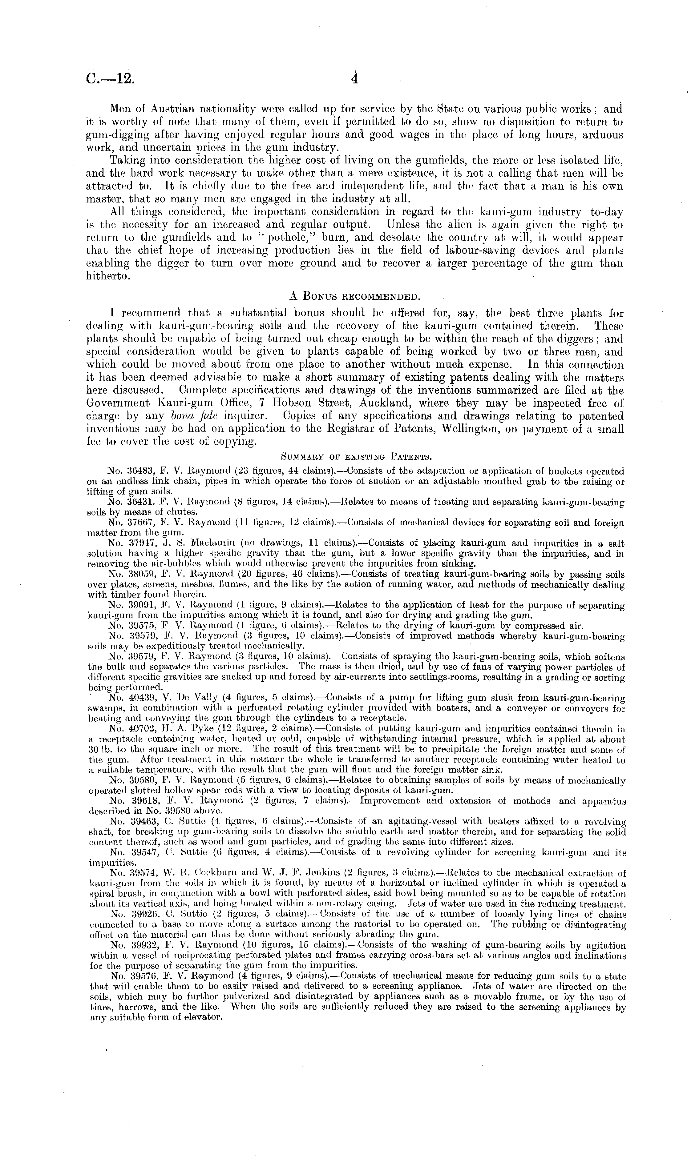 Men of Austrian nationality were called up for service by the State on various public works ; and it is worthy of note that many of them, even if permitted to do so, show no disposition, to return to gum-digging after having enjoyed regular hours and good wages in the place of long hours, arduous work, and uncertain prices in the gum industry. Taking into consideration the higher cost of living on the gumfields, the more; or less isolated life, and the hard work necessary to make other than a mere existence, it is not a calling that men will be attracted to. It is chiefly due to the free and independent life, and the fact that a man is his own master, that so many men are engaged in the industry at all. All things considered, the important consideration in regard to the kauri-gum industry to-day is the necessity for an increased and regular output. Unless the alien is again given the right to return to the gumfields and to " pothole," burn, and desolate the country at will, it would appear that the chief hope of increasing production lies in the field of labour-saving devices and plants enabling the digger to turn over more ground and to recover a larger percentage of the gum than hitherto. A Bonus recommended. • . I recommend that a substantial bonus should be offered for, say, the best three plants for dealing with, kauri-gum-bearing soils and the recovery of the kauri-gum contained therein. These plants should be capable of being turned out cheap enough to be within the reach of the diggers ; and special consideration would be given, to plants capable of being worked by two or three men, and which could be moved about from one place to another without much expense. In this connection it has been deemed advisable to make a short summary of existing patents dealing with the matters here discussed. Complete specifications and drawings of the inventions summarized are filed at the Government Kauri-gum Office, 7 Hobson Street, Auckland, where they may be inspected free of charge by any bona fide inquirer. Copies of any specifications and drawings relating to patented inventions may be had on application to the Registrar of Patents, Wellington, on payment of a small fee to cover the cost of copying. Summary oir existing Patents. No. 36483, F. V. Raymond (23 figures, 44 claims). —Consists of the adaptation or application of buckets operated on an endless link chain, pipes in which operate the force of suction or an adjustable mouthed grab to the raising or lifting of gum soils. No. 36431. F. V. Raymond (8 figures, 14 claims). —Relates to means of treating anel separating kauri-gum-bearing soils by moans of chutes. No. 37667, F. V. Raymond (11 figures, 12 claims). —Consists of meohanioal devices for soparating soil and foreign matter from tho gum. No. 37917, J. S. Maclaurin (no drawings, 11 claims). —Consists of placing kauri-gum and impurities in a salt solution having a higher specific gravity than tho gum, but a lower speeiiie gravity than the impurities, and in removing the air-bubbles which would otherwise prevent tho impurities from sinking. No. 38059, F. V. Raymond (20 figures, 40 claims). —Consists of treating kauri-gum-boaring soils by passing soils over plates, screens, meshes, flumes, and the like, by the action of running wator, and methods of mechanically dealing with timber found therein. No. 39091, F. V. Raymond (1 figure, 9 claims). —Relates to the application of heat for the purpose of separating kauri-gum from tho impurities among whie-h it is found, and also for drying and grading the gum. No. 39575, F V. Raymond. (1 figure, 6 claims). —Relates to the drying of kauri-gum by compressed air. Ne>. 39579, F. V. Raymond (3 figures, 10 claims).—Consists of improved methods whereby kauri-gum-bearing soils may be expeditiously treated mechanically. No. 39579, F. V. Raymond (3 figures, 10 claims). —Consists of spraying tho kauri-gum-boaring soils, which softens the bulk and separates the various particles. Tho mass is then dried, and by use of fans of varying power particles of different specific gravities are sucked up and forcod by air-currents into settlings-rooms, resulting in a grading or sorting being performed. No. 40439, V. Do Vally (4 figures, 5 claims). —Consists of a pump feir lifting gum slush from kauri-gum-boaring swamps, in combination with a perforated rotating cylinder provided with boaters, and a conveyer or conveyers for beating and convoying the gum through the cylinders to a receptacle. No. 40702, H. A. Pyke (12 figures, 2 claims). —Consists of putting kauri-gum and impurities contained therein in a receptacle containing water, heated or cold, capable of withstanding internal pressure, which, is applied at about 30 lb. to tho square inch or more. Tho result of this treatment will be to precipitate tho foreign matter and some of the gum. After treatment in this manner the wheile is transferred to another receptacle containing water heatod to a suitable temperature, with the result that the gum will float and the foreign matter sink. No. 39580, F. V. Raymond (5 figures, 0 claims). —Relates to obtaining samples of soils by means of mechanically operated slotted hollow spear rods with a view to locating deposits of kauri-gum. No. 39618, F. V. Raymond (2 figures, 7 claims). —Improvement and extension of methods and apparatus described in No. 39580 above. No. 39463, C. Suttio (4 figures, 0 claims). —Consists of an agitating-vessel with beaters affixed to a revolving shaft, for breaking up gum-bearing soils to dissolve tho soluble-, earth and matter therein, and for separating the solid content thereof, such as wood and gum particles, and of grading the same into different sizes. No. 39547, C. Suttie (0 figures, 4 claims). —Consists of a revolving cylinder for screening kauri-gum and its impurities. No. 39574, W. R. Cookburn and W. J. F. Jenkins (2 figures, 3 claims). — Relates to the mechanical extraction of kauri-gum from the soils i