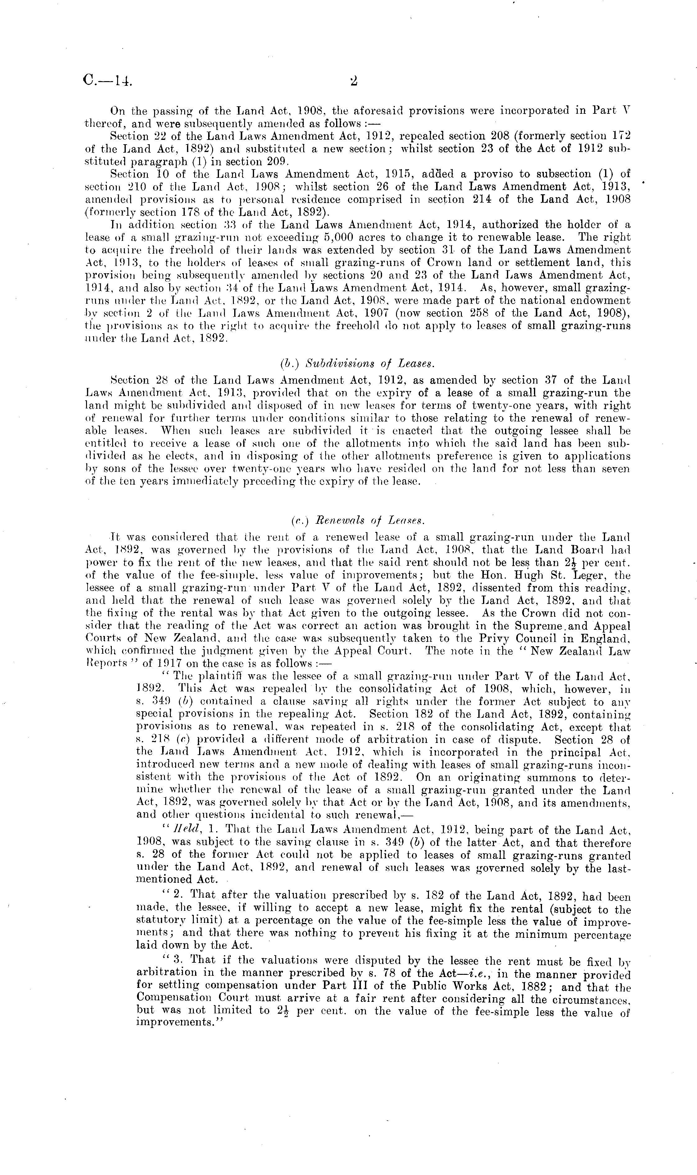 On the passing of the Land Act, 1908, the aforesaid provisions were incorporated in Part V thereof, and were subsequently amended as follows :-— Section 22 of the Land Laws Amendment Act, 1912, repealed section 208 (formerly section 172 of the Land Act, 1892) and substituted a new section; whilst section 23 of the Act of 1912 substituted paragraph (1) in section 209. Section 10 of the Land Laws Amendment Act, 1915, adfled a proviso to subsection (1) of section 210 of the Land Act, 1908; whilst section 26 of the Land Laws Amendment Act, 1913, amended provisions as to personal residence comprised in section 214 of the Land Act, 1908 (formerly section 178 of the Land Act, 1892). In addition section 33 of the Land Laws Amendment Act, 1914, authorized the holder of a lease of a small grazing-run not exceeding 5,000 acres to change it to renewable lease. The right to acquire the freehold of their lands was extended by section 31 of the Land Laws Amendment Act, 1913, to the holders of leases of small grazing-runs of Crown land or settlement land, this provision being subsequently amended by sections 20 and 23 of the Land Laws Amendment Act, 1914, and also by section 34 of the Land Laws Amendment Act, 1914. As, however, small grazingruns under the Land Act, 1892, or the Land Act, 1908, were made part of the national endowment by section 2 of the Land Laws Amendment Act, 1907 (now section 258 of the Land Act, 1908), the provisions as to the right to acquire the freehold do not apply to leases of small grazing-runs under the Land Act, 1892. (b.) Subdivisions of Leases. Section 28 of the Land Laws Amendment Act, 1912, as amended by section 37 of the Land Laws Amendment Aot, 1913, provided that on the expiry of a lease of a small grazing-run the land might be subdivided and disposed of in new leases for terms of twent}'-one years, with right of renewal for further terms under conditions similar to those relating to the renewal of renewable leases. When such leases are subdivided it is enacted that the outgoing lessee shall be entitled to receive a lease of such one of the allotments into which the said land has been subdivided as he elects, and in disposing of the other allotments preference is given to applications by sons of the lessee over twenty-one years who have resided on the land for not less than seven of the ten years immediately preceding the expirj' of the lease. (c.) Renewals of Leases. It was considered that the rent of a renewed lease of a small grazing-run under the Land Act, 1892, was governed by the provisions of the Land Act, 1908, that the Land Board had power to fix the rent of the new leases, and that the said rent should not be less than 2J per cent. of the value of the fee-simple, less value of improvements; but the Hon, Hugh St. Leger, the lessee of a small grazing-run under Part V of the Land Act, 1892, dissented from this reading. and held that the renewal of such lease was governed solely by the Land Act, 1892, and that the fixing of the rental was by that Act given to the outgoing lessee. As the Crown did not consider that the reading of the Act was correct an action was brought in the Supreme.and Appeal Courts of New Zealand, and the case was subsequently taken to the Privy Council in England, which confirmed the judgment given by the Appeal Court. The note in the " New Zealand Law Reports " of 1917 on the case is as follows :— ' The plaintiff was the lessee of a small grazing-run under Part V of the Land Act, 1892. This Act was repealed by the consolidating Act of 1908, which, however, in s. 349 (b) contained a clause saving all rights under the former Act subject to any special provisions in the repealing Act. Section 182 of the Land Act, 1892, containing provisions as to renewal, was repeated in s. 218 of the consolidating Act, except that s. 218 (c) provided a different mode of arbitration in case of dispute. Section 28 of the Land Laws Amendment Act, 1912. which is incorporated in the principal FAct, introduced new terms and a new mode of dealing with, leases of small grazing-runs inconsistent with the provisions of the Act of 1892. On an originating summons to determine whether the renewal of the lease of a small grazing-run granted under the Land Act, 1892, was governed solely by that Act or by the Land Act, 1908, and its amendments, and other questions incidental to such renewal, — " Held, 1. That the Land Laws Amendment Act, 1912, being part of the Land Act, 1908, was subject to the saving clause in s. 349 (b) of the latter Act, and that therefore s. 28 of the former Act could not be applied to leases of small grazing-runs granted under the Land Act, 1892, and renewal of such leases was governed solely by the lastmentioned Act. " 2. That after the valuation prescribed by s. 182 of the Land Act, 1892, had been made, the lessee, if willing to accept a new lease, might fix the rental (subject to the statutory limit) at a percentage on the value of the fee-simple less the value of improvements; and that there was nothing to prevent his fixing it at the minimum percentage laid down by the Act. " 3. That if the valuations were disputed by the lessee the rent must be fixed by arbitration in the manner prescribed by s. 78 of the Act— i.e., in the manner provided for settling compensation under Part 111 of the Public Works Act, 1882; and that the Compensation Court must arrive at a fair rent after considering all the oircumstances, but was not limited to 2| per cent, on the value of the fee-simple less the value of improvements."