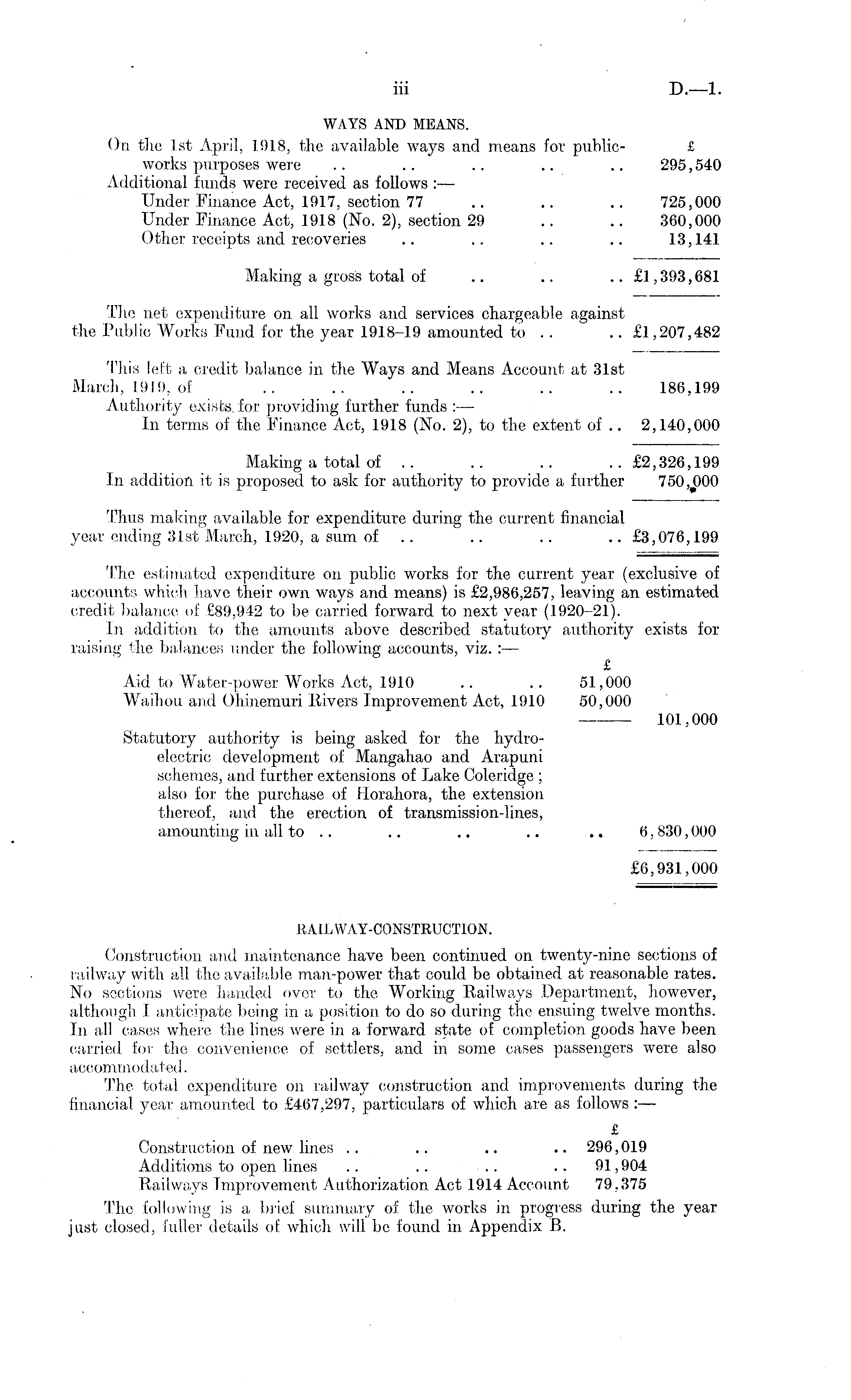 WAYS AND MEANS. On the Ist April, 1918, the available ways and means for public- £ works purposes were .. .. . . .. .. 295,540 Additional funds were received as follows : — Under Finance Act, 1917, section 77 .. .. .. 725,000 Under Finance Act, 1918 (No. 2), section 29 .. .. 360,000 Other receipts and recoveries .. .. .. .. 13,14.1 Making a gross total of .. .. .. £1,393,681 The net expenditure on all works and services chargeable against the Public Works Fund for the year 1918-19 amounted to .. .. £l ,207,482 This left a credit balance in the Ways and Means Account at 31st March, 1919, of .. .. .. .. .. .. 186,199 Authority exists, for providing further funds : — In terms of the Finance Act, 1918 (No. 2), to the extent of .. 2,140,000 Making a total of . . .. .. .. £2,326,199 In addition it is proposed to ask for authority to provide a further 750,000 Thus making available for expenditure during the current financial year ending 31st March, 1920, a sum of .. .. .. .. £3,076,199 The estimated expenditure on public works for the current year (exclusive of accounts which have their own ways and means) is £2,986,257, leaving an estimated credit balance of £89,942 to be carried forward to next year (1920-21). In addition to the amounts above described statutory authority exists for raising the balances under the following accounts, viz. : — £ Aid to Water-power Works Act, 1910 .. .. 51,000 Waihou and Ohinemuri Ilivers Improvement Act, 1910 50,000 101,000 Statutory authority is being asked for the hydroelectric development of Mangahao and Arapuni schemes, and further extensions of Lake Coleridge ; also for the purchase of Horahora, the extension thereof, and the erection of transmission-lines, amounting in all to .. .. .. .. .. 6,830,000 £6,931,000 RAILWAY-CONSTRUCTION. Construction and maintenance have been continued on twenty-nine sections of railway with all the available man-power that could be obtained at reasonable rates. No sections were handed over to the Working Railways Department, however, although I anticipate being in a position to do so during the ensuing twelve months. In all cases where the lines were in a forward state of completion goods have been carried for: the convenience of settlers, and in some cases passengers were also accommodated. The total expenditure on railway construction and improvements during the financial year amounted to £467,297, particulars of which are as follows : — £ Construction of new lines .. .. .. .. 296,019 Additions to open lines .. .. .. 91,904 Railways Improvement Authorization Act 1914 Account 79,375 The following is a brief summary of the works in progress during the year just closed, fuller details of which will be found in Appendix B.