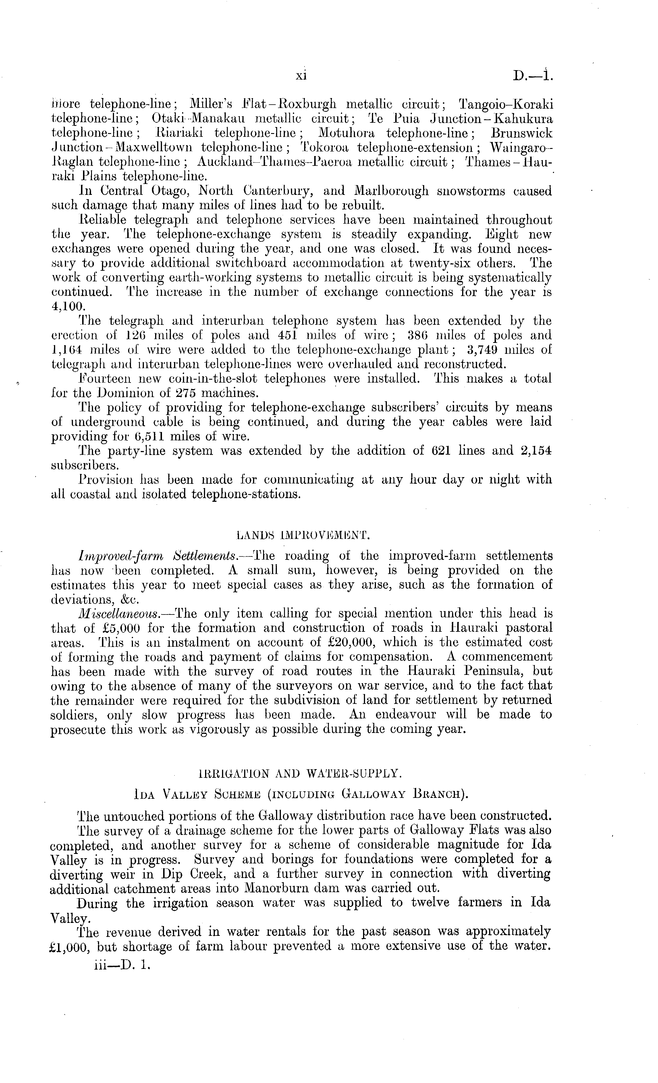 more telephone-line; Miller's Flat-Roxburgh metallic circuit; Tangoio-Koraki telephone-line; Otaki Manakau metallic circuit; Te Puia Junction - Kahukura telephone-line; Riariaki telephone-line; Motuhora telephone-line; Brunswick J unction-Maxwelltown telephone-line; Tokoroa telephone-extension; WaingaroRaglan telephone-line ; Auckland-Thames-Paeroa metallic circuit; Thames - llauraki Plains telephone-line. In Central Otago, North Canterbury, and Marlborough snowstorms caused such damage that many miles of lines had to be rebuilt. Reliable telegraph and telephone services have been maintained throughout the year. The telephone-exchange system is steadily expanding. Eight new exchanges were opened during the year, and one was closed. It was found necessary to provide additional switchboard accommodation at twenty-six others. The work of converting earth-working systems to metallic circuit is being systematically continued. The increase in the number of exchange connections for the year is 4,100. The telegraph and interurban telephone system has been extended by the erection of 126 miles of poles and 451 miles of wire ; 386 miles of poles and 1,164 miles of wire were added to the telephone-exchange plant; 3,749 miles of telegraph and interurban telephone-lines were overhauled and reconstructed. Fourteen new coin-in-the-slot telephones were installed. This makes a total for the Dominion of 275 machines. The policy of providing for telephone-exchange subscribers' circuits by means of underground cable is being continued, and during the year cables were laid providing for 6,511 miles of wire. The party-line system was extended by the addition of 621 lines and 2,154 subscribers. Provision has been made for communicating at any hour day or night with all coastal and isolated telephone-stations. LANDS IMPROVEMENT. Improved-farm Settlements. —The reading of the improved-farm settlements has now been completed. A small sum, however, is being provided on the estimates this year to meet special cases as they arise, such as the formation of deviations, &c. Miscellaneous. —The only item calling for special mention under this head is that of £5,000 for the formation and construction of roads in Hauraki pastoral areas. This is an instalment on account of £20,000, which is the estimated cost of forming the roads and payment of claims for compensation. A commencement has been made with the survey of road routes in the Hauraki Peninsula, but owing to the absence of many of the surveyors on war service, and to the fact that the remainder were required for the subdivision of land for settlement by returned soldiers, only slow progress has been made. An endeavour will be made to prosecute this work as.vigorously as possible during the coming year. IRRIGATION AND WATER-SUPPLY. Ida Valley Scheme (including Galloway Branch). The untouched portions of the Galloway distribution race have been constructed. The survey of a drainage scheme for the lower parts of Galloway Fiats was also completed, and another survey for a scheme of considerable magnitude for Ida Valley is in progress. Survey and borings for foundations were completed for a diverting weir in Dip Creek, and a further survey in connection with diverting additional catchment areas into Manorburn dam was carried out. During the irrigation season water was supplied to twelve farmers in Ida Valley. The revenue derived in water rentals for the past season was approximately £1,000, but shortage of farm labour prevented a more extensive use of the water.