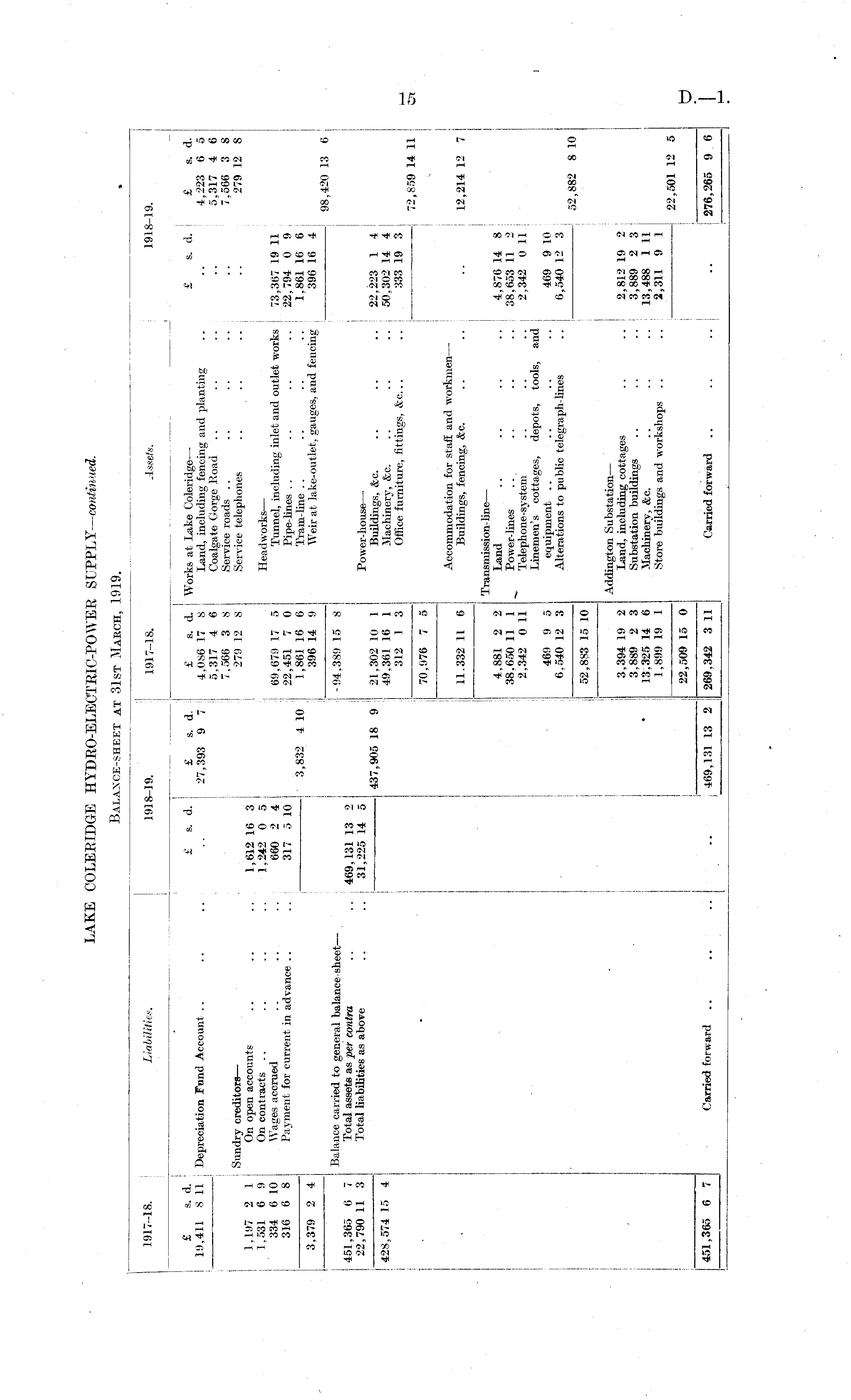 1917-18. Liabilities. 1918-19. I 1917-18. Assets. 1918-19. Assets. £ s. d. : 19,411 8 11 : Depreciation Fund Account .. ; Sundry creditors — 1,197 2 1 On open accounts 1,531 6 9 On contracts .. 334 6 10 Wages accrued 316 6 8 Payment for current in advance .. 3.379 2 4 Balance carried to general balance sheet — 451, 36.5 6 7 Total assets as per contra 22,790 11 3 Total liabilities as above 428,574 15 4 I ■ i j £ s. d. £ s. d. £ s. d. 27,393 9 7 4,086 17 8 5,317 4 6 7,566 3 8 279 12 S 1,612 16 3 1.242 0 5 660 2 4 69,679 17 5 .. 317 5 10 22,451 7 0 j 3,832 4 10 1,861 16 6 396 14 9 -94.389 15 8 .. 469,131 13 2 .. i 31,225 14 5 — — —— 437,905 18 9 : 21.302 10 1 49,361 16 1 -il9 1 5 1 Works at Lake Coleridge — £ s. d. £ s. d. Land, including fencing and planting .. .. 4,223 6 5 Coalgate Gorge Road .. .. .. i .. 5,317 4 6 Service roads ,. .. .. .. .. 7,566 3 8 Service telephones .. .. .. | .. 279 12 8 Headworks — Tunnel, including inlet and outlet works ! 73,367 19 11 Pipe-lines.. .. .. .. 22,794 0 9 Tram-line .. .. .. .. 1,861 16 6 Weir at lake-outlet, gauges, and fencing 396 16 4 1 98,420 13 6 -94.389 15 8 i Power- house — Buildings. &c. .. .. .. i 22.223 1 4 Machinery, &c. .. .. .. j 50,302 14 4 I Office furniture, fittings. &c... .. j 333 19 3 | : 72,859 14 11 Accommodation for staff and workmen — Buildings, fencing, &c. .. .. .. 12,214 12 7 21.302 10 1 1 49.361 16 1 i 312 1 3 I i AVZ 1 3 i i 70,976 7 5 11.332 11 6 4,881 2 2 70,976 7 5 j 11.332 11 6 I 38.650 11 1 2,342 0 11 i 4.881 2 2 38.650 11 1 2.342 0 11 Transmission- line — Land .. .. .. .. j 4,876 14 8 Power-lines .. .. .. .. i 38,653 11 2 Telephone-system .. .. .. j 2,342 0 11 I Linemen's cottages, depots, tools, and j equipment .. .. .. .. 469 9 10 Alterations to public telegraph-lines .. I 6,540 12 3. i ! 1 52,882 8 10 -* 469 9 5 6.540 12 3 469 9 5 ! 6,540 12 3 I 0.040 iz A iW SSQQ ire 111 j ! 52,883 15 10 ! 52,883 15 10 ii i O QClA i a o 3,394 19 2 3,889 2 3 13.325 14 6 1,899 19 1 22,509 15 0 3,394 19 2 3,889 2 3 13.325 14 6 1,899 19 1 j Addington Substation — Land, including cottages .. .. 2,812 19 2 j Substation buildings .. .. .. 3,889 2 3 Machinery, &c. .. .. .. 13,488 1 11 I Store buildings and workshops .. .. I 2, 311 9 1 : 22,501 12 5 22,509 15 0 I i - _J 451, 365 6 7 Carried forward 451,365 6 7 469.131 13 2 269.342 3 11 269,342 3 11 Carried forward .. .. .. j .. 276,265 9 6 i 276,265 9 6