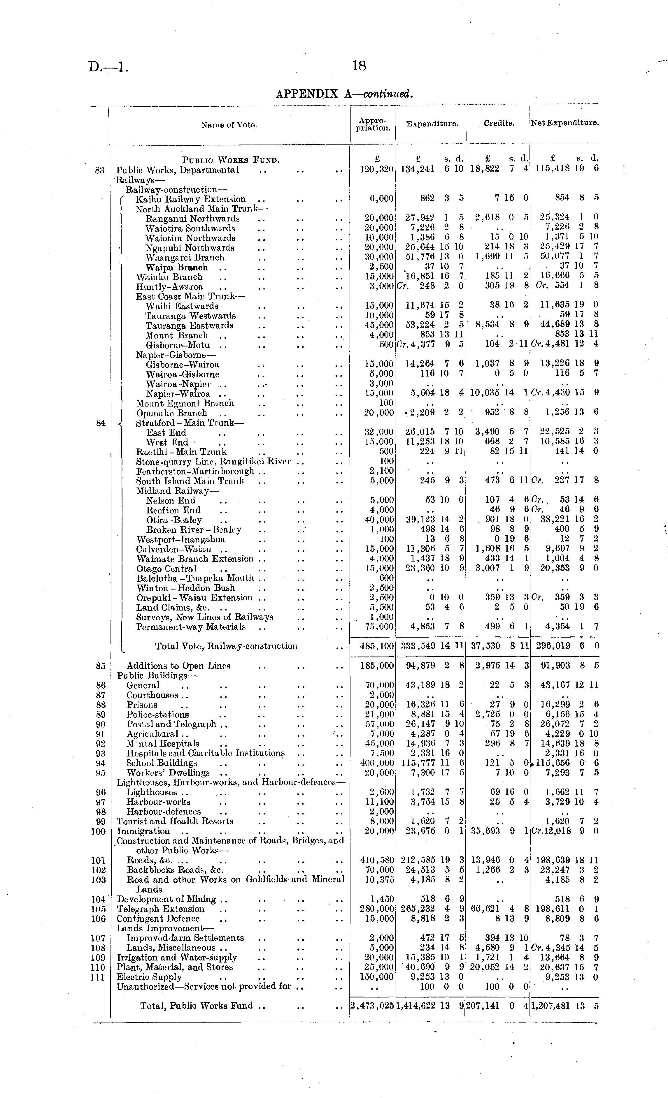Name of Vote. Appropriation. Expenditure. I Credits. Net Expenditure. I S3 Public Wobks Fund. Public Works, Departmental Railways— Railway-construction — Kaihu Railway Extension North Auckland Main Trunk — Ranganui Northwards Waiotira Sorrthwards Waiotira Northwards Ngapuhi Northwards Whangarei Branch Waipu Branch Waiuku Branch .. .. Huntly-Awaroa East Coast Main Trunk — Waihi Eastwards Tauranga Westwards Tauranga Eastwards Mount Branch Gisborne-Motu Na pier-Gisborne — Gisborne-Wairoa Wairoa-Gisborne Wairoa-Napiei- .. Napior-Wairoa Mount Egmont Branch .. Opunake Branch <{ Stratford - Main Tr-unk — East End West End ■ Raetihi - Mairr Trunk Stone-quarry Line, Rangitikei River .. Featherston-Martinborough .. South Island Main Trunk Midland Railway— Nelson End Reefton End Otira-Bealey Broken River -Bealey Wostport-Inangahrra Culverden-Waiau Waimate Branch Extension Otago Central Balclutha -Tuapeka Mouth Winton - Heddon Bush Orepuki-Waiau Extension .. Land Claims, &c. Surveys, New Lines of Railways Permanent-way Materials £ 120,320 £ s. d. 134,241 6 10 £ s. d. 18,822 7 4 £ S.- d. 115,418 19 6 6,000 862 3 5 7 15 0 854 8 5 20,000 20,000 10,000 20,000 30,000 2,500 15,00.0 3,000 27,942 1 5 7,226 2 8 1,386 6 8 25,644 15 10 51,776 13 0 37 10 7 '16,851 16 7 Cr. 248 2 0 2,618 0 5 15 0 10 214 18 3 1,699 II 5 25,324 I 0 7,226 2 8 1,371 5 10 25,429 17 7 50,077 1 7 37 10 7 16,666 5 5 Cr. 554 1 8 185 11 2 305 J 9 8 15,000 10,000 45,000 4,000 500 11,674 15 2 59 17 8 53,224 2 5 853 13 11 Cj-. 4,377 9 5 38 16 2 8,534 8 9 11,635 19 0 59 17 8 44,689 13 8 853 13 11 Cr. 4,481 12 4 104 2 II 15,000 5,000 3,000 1.5,000 100 20,000 14,264 7 6 116 10 7 5,604 18 4 1,037 8 9 0 5 0 10,035 14 1 13,226 18 9 116 5 7 Cr. 4,430 15 9 • 2,209 2 2 952 8 8 1,256 13 6 8-1 26,015 7 10 11,253 18 10 224 9 11 3,490 5 7 668 2 7 82 15 11 22,525 2 3 10,585 16 3 141 14 0 32,000 .15,000 500 100 2,100 5,000 245 9 3 473 6 11 Cr. 227 17 8 5,000 4,000 40,000 1,000 100 15,000 4,000 15,000 600 2,500 2,500 5,500 1,000 75,000 53 10 0 39,123 14 2 498 14 6 13 6 8 11,306 5 7 1,437 18 9 23,360 10 9 107 4 6 46 9 6 . 901 18 0 98 8 9 0 19 6 I ,608 16 5 433 14 1 3,007 1 9 Cr. 53 14 6 Cr. 46 9 6 38,221 16 2 400 5 9 12 7 2 9,697 9 2 1,004 4 8 20,353 9 0 0 10 0 53 4 6 359 13 3 2 5 0 Cr. 359 3 3 50 19 6 4,853 7 8 499 6 1 4,354 1 7 I Total Vote, Railway-construction 485,100 333,549 14 11 37,530 8 11 296,019 6 0 85 86 87 SS 89 90 91 92 93 94 95 96 97 98 99 00 Additions to Open Lines Public Buildings— General Courthouses Prisons Police-stations Postal and Telegraph .. Agricultural.. .. .. .. '.. M ntal Hospitals Hospitals and Charitable, Institutions School Buildings Workers' Dwellings Lighthouses, Harbour-works, and Harbour-defences— Lighthouses Harbour-works Harbour-defences Tourist and Health Resorts Immigration Construction and Maintenance of Roads, Bridges, and other Public Works — Roads, &c. .. .. .. .. Backblocks Roads, &c. Road and other Works on Goldfields and Mineral Lands Development of Mining .. Telegraph Extension Contingent Defence Lands Improvement— Improved-farm Settlements Lands, Miscellaneous Irrigation and Water-supply Plant, Material, and Stores Electric Supply Unauthorized—Services not provided for .. 185,000 70,000 2,000 20,000 21,000 57,000 7,000 45,000 7,500 400,000 20,000 2,600 11,100 2,000 8,000 20,000 94,879 2 8 43,189 18 2 16,326 11 6 8,881 15 4 26,1.47 9 10 4,287 0 4 14,936 7 3 2,331 16 0 115,777 J J (i 7,300 17 5 1,732 7 7 3,754 15 8 1,620 7 2 23,675 0 1 2,975 14 3 22 5 3 27 9 0 2,725 0 0 75 2 8 57 19 6 296 8 7 121 5 0 7 10 0 69 16 0 25 5 4 35,693 9 1 91,903 8 5 43,167 12 11 16,299 2 6 6,150 15 4 26,072 7 2 4,229 0 .10 14,639 18 8 2,331 16 0 .115,656 6 6 7,293 7 5 1,662 11 7 3,729 10 4 1,620 7 2 GY.12,018 9 0 ,01 .02 03 410,580 70,000 10,375 212,585 19 3 24,513 5 5 4,185 8 2 13,946 0 4 1 ,266 2 3 198,639 18 11 23,247 3 2 4,185 8 2 .04 .05 06 1,450 280,000 15,000 518 0 9 265,232 4 9 8,818 2 3 66,621' 4 8 8 13 9 518 6 9 198,611 0 1 8,809 8 0 .07 08 09 .10 11 2,000 5,000 20,000 25,000 150,000 472 17 5 234 14 8 15,385 10 1 40,090 9 9 9,253 13 0 100 0 0 394 13 10 4,580 9 1 1,721 1 4 20,052 14 2 78 3 7 Cj-. 4,345 14 5 13,664 8 9 20,637 15 7 9,253 13 0 100 0 0 Total, Public Works Fund 2,473,025 1,414,622 13 9 207,141 0 4 1,207,481 13 5
