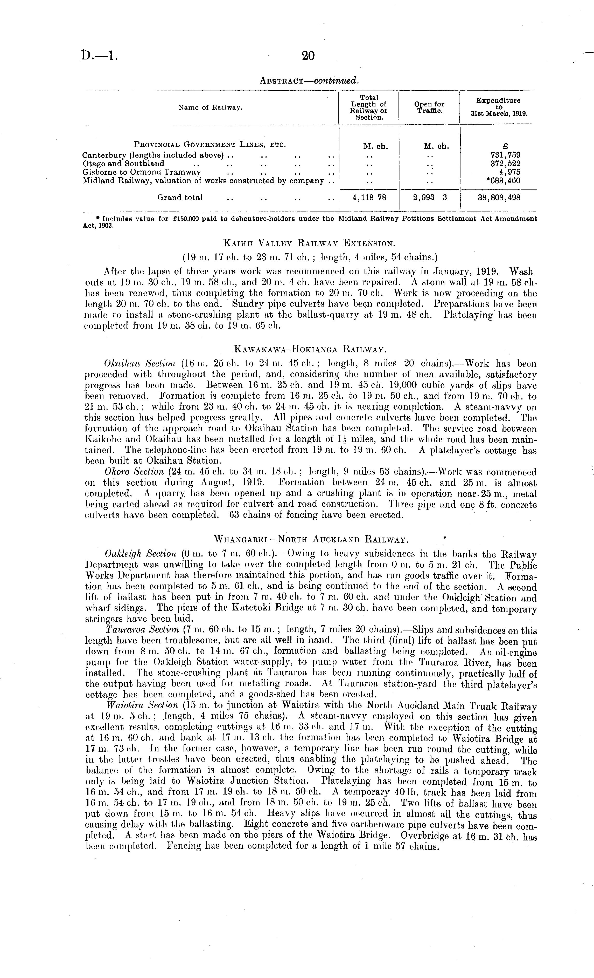 Kaihu Valley Railway Extension. (19 m. 17 oh. to 23 m. 71 eh. ; length, 4 miles, 54 chains.) After the lapse of three years work was recommenced on this railway in January, 1919. Wash outs at 19 m. 30 eh., 19 in. 58 eh., and 20 in. 4 eh. have been repaired. A. stone wall at 19 m. 58 oh. has been renewed, thus completing the formation to 20 m. 70 oh. Work is now proceeding on the length 20 in. 70 eh. to the end. Sundry pipe culverts have been completed. Preparations have been made to install a stone-crushing plant at the ballast-quarry at 19 m. 48 eh. Platelaying has been completed from 19 m. 38 eh. to 19 m. 05 eh. Kawakawa-Hokianga Railway. Okaihau Section (16 m. 25 eh. to 24 m. 45 eh. ; length, 8 miles 20 chains). —Work has been proceeded with throughout the period, and, considering the number of men available, satisfactory progress lias been made. Between 16 m. 25 eh. and 19 m. 45 eh. 19,000 cubic yards of slips have been removed. Formation is complete from 16 m. 25 eh. to 19 m. 50 eh., and from 19 m. 70 eh. to 21 m. 53 eh. ; while from 23 m. 40 eh. to 24 in. 45 eh. it is Hearing completion. A. steam-navvy on this section has helped progress greatly. All pipes and concrete culverts have been completed. The formation of the approach road to Okaihau Station has been completed. The service road, between Kaikohe and Okaihau has been metalled for a length of I J miles, and the whole road has been maintained. The telephone-line has been erected from 19 m. to 19 m. 60 eh. A platelayer's cottage has been built at Okaihau Station. Olcoro Section (24 m. 4-5 eh. to 34 in. 18 oh., ; length, 9 miles 53 chains). —Work was commenced on this section during August, 1919. Formation between 24 m. 45 eh. and 25 m. is almost completed. A quarry has been opened up and a, crushing plant is in operation near.2s m., metal being carted ahead as required for culvert and road construction. Three pipe and. one 8 ft. concrete culverts have been completed. 63 chains of fencing have been erected. Whangarei - North Auckland Railway. Oakleigh Section (0 m. to 7 in. 60 eh.). —Owing to heavy subsidences in the banks the Railway Department was unwilling to take over the completed length from om.to 5 m. 21 eh. The Public Works Department has therefore maintained this portion, and has run goods traffic over it. Formation has been completed to sm. 61 eh., and is being continued to the end of the section. A second lift of ballast has been put in from 7 m. 40 eh. to 7 m. 60 eh. and under the Oakleigh Station and wharf sidings. The piers of the Katetoki Bridge at 7m. 30 eh. have been completed, and temporary stringers have been laid. Tauraroa Section (7 m. 60 eh. to 15 m. ; length, 7 miles 20 chains), —Slips and subsidences on this length have been troublesome, but are all well in hand. The third (final) lift of ballast has been put down from Bm. 50 eh. to 14 m. 67 eh., formation and ballasting being completed. An oil-engine pump for the Oakleigh Station water-supply, to pump water from the Tauraroa River, has been installed. The stone-crushing plant at Tauraroa has been running continuously, practically half of the output having been used for metalling roads. At Tauraroa station-yard the third platelayer's cottage has been completed, and a goods-shed has been erected. Waiotira Section (15 m. to junction at Waiotira with the North Auckland Main Trunk Railway at 19 m. 5 eh. ; .length, 4 miles 75 chains). —A steam-navvy employed on this section has given excellent results, completing cuttings at 16 m. 33 eh. and 17 in. With the exception of the cutting at 16 m, 60 eh. and bank at 17 m. 13 eh. the formation has been completed to Waiotira Bridge at 17 m. 73 oil. In the former case, however, a temporary line has been run round the cutting while in the latter trestles have been erected, thus enabling the platelaying to be pushed ahead. The balance of the formation is almost complete. Owing to the shortage of rails a temporary track only is being laid to Waiotira Junction Station. Platelaying has been completed from 15 m. to 16 in. 54 eh., and from 17 m. 19 eh. to 18 m. 50 eh. A temporary 40 lb. track has been laid from 16 m. 54 eh. to 17 m. 19 eh., and from 18 m. 50 eh. to 19 m. 25 eh, Two lifts of ballast have been put down from 15 m. to 16 m. 54 eh. Heavy slips have occurred in almost all the cuttings, thus causing delay with the ballasting. Eight concrete and five earthenware pipe culverts have been completed. A start has been made on the piers of the Waiotira Bridge. Overbridge at 16 m. 31 eh. has been completed. Fencing has been completed for a length of 1 mile 57 chains.