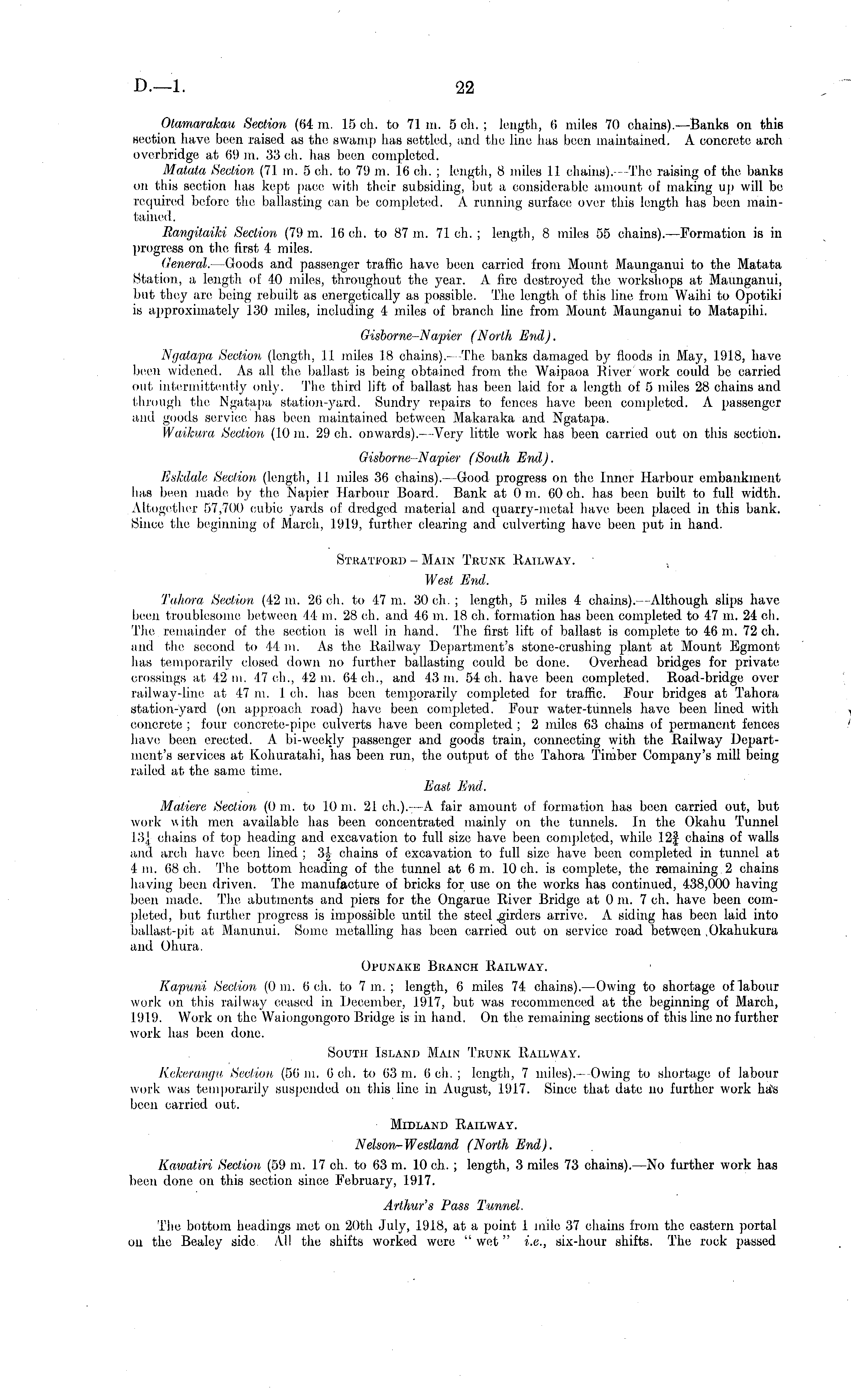 Otamarakau Section (64 m. 1.5 eh. to 71m. 5 eh. ; length, 6 miles 70 chains). —Banks on this section have been raised as the swamp has settled, and the line has been maintained. A concrete arch ovorbridge at 69 m. 33 eh. has been completed. Matata Section (71 m. 5 eh. to 79 m. 16 eh. ; length, 8 miles 11 chains). The raising of the banks on this section has kept pace with their subsiding, but a considerable amount of making up will be required before the ballasting can be completed. A running surface over this length has been maintained. Rangitaiki Section (79 m. 16 eh. to 87 m. 71 eh. ; length, 8 miles 55 chains). — is in progress on the first 4 miles. General. —Goods and passenger traffic have been carried from Mount Maunganui to the Matata Station, a length of 40 miles, throughout the year. A fire destroyed the workshops at Maunganui, but they are being rebuilt as energetically as possible. The length of this line from Waihi to Opotiki is approximately 130 miles, including 4 miles of branch line from Mount Maunganui to Matapihi. Gisborne-N apier (North End). Ngatapa Section (length, 11 miles 18 chains).--The banks damaged by floods in May, 1918, have been widened. As all the ballast is being obtained from the Waipaoa Biver work could bo carried out intermittently only. The third lift of ballast has been laid for a length of 5 miles 28 chains and through the Ngatapa station-yard. Sundry repairs to fences have been completed. A passenger and goods service has been maintained between Makaraka and Ngatapa. Waikura Section (10 m. 29 eh. onwards). —Very little work has been carried out on this section. Gisborne-N apier (South End). Es/cdale Section (length, I 1 miles 36 chains). —Good progress on the Inner Harbour embankment has been made by the Napier Harbour Board. Bank at om. 60 eh. has been built to full width. Altogether 57,700 cubic yards of dredged material and quarry-metal have been placed in this bank. Since the beginning of March., 1919, further clearing and culverting have been put in hand. Stratford - Main Trunk Railway. West End. Tahora Section (42 m. 26 eh. to 47 m. 30 eh. ; length, 5 miles 4 chains).--Although slips have been troublesome between 44 m. 28 eh. and 46 m. 18 eh. formation has been completed to 47 m. 24 eh. The remainder of the section is well, in hand. The first lift of ballast is complete to 46 m. 72 eh. and the second to 44 m. As the Railway Department's stone-crushing plant at Mount Egmont has temporarily closed down no further ballasting could be done. Overhead bridges for private crossings at 42 m. 47 eh., 42 m. 64 eh., and 43 m. 54 eh. have been completed. Road-bridge over railway-line at 47 m. 1 eh. has been temporarily completed for traffic. Four bridges at Tahora station-yard (on approach, road) have been completed. Four water-tunnels have been lined with concrete ; four concrete-pipe culverts have been completed ; 2 miles 63 chains of permanent fences have been erected. A bi-weekly passenger and goods train, connecting with the Railway Department's services at Kohuratahi, has been run, the output of the Tahora Timber Company's mill being railed at the same time. East End. Matiere Section (0 m. to 10 m. 21 0h.).-—A fair amount of formation has been carried out, but work with men available has been concentrated mainly on the tunnels. In the Okahu Tunnel 13] chains of top heading and excavation to full size have been completed, while 12| chains of walls and arch have been lined ; 3£ chains of excavation to full size have been completed in tunnel at 4m. 68 eh. The bottom heading of the tunnel at 6m. 10 eh. is complete, the remaining 2 chains having been driven. The manufacture of bricks for use on the works has continued, 438,000 having been made. The abutments and piers for the Ongarue River Bridge at om. 7 eh. have been completed, but further progress is impossible until the steel .girders arrive. A siding has been laid into ballast-pit at Manunui. Some metalling has been carried out on service road between .Okahukura and Ohura. Opunake Branch Railway. Kapuni Section (0 in. 6 eh. to 7 m.; length, 6 miles 74 chains). —Owing to shortage of labour work on this railway ceased in December, 1917, but was recommenced at the beginning of March, 1919. Work on the Waiongongoro Bridge is in hand. On the remaining sections of this line no further work has been done. South Island Main Trunk Railway. Kckerangu Section (56 m. (i eh. to 63 m. (ich.; length, 7 miles).-Owing to shortage of labour work was temporarily suspended on this line in August, 1917. Since that date no further work ha's been carried out. Midland Railway. Nelsorir-Wesiland (North End). Kawatiri Section (59 m. 17 eh. to 63 m. 10 eh. ; length, 3 miles 73 chains). —No further work has been done on this section since February, 1917. Arthur's Pass Tunnel. The bottom headings met on 20th July, 1918, at a point 1 mile 37 chains from the eastern portal on the Bealey side. All the shifts worked were " wet " i.e., six-hour shifts. The rock passed