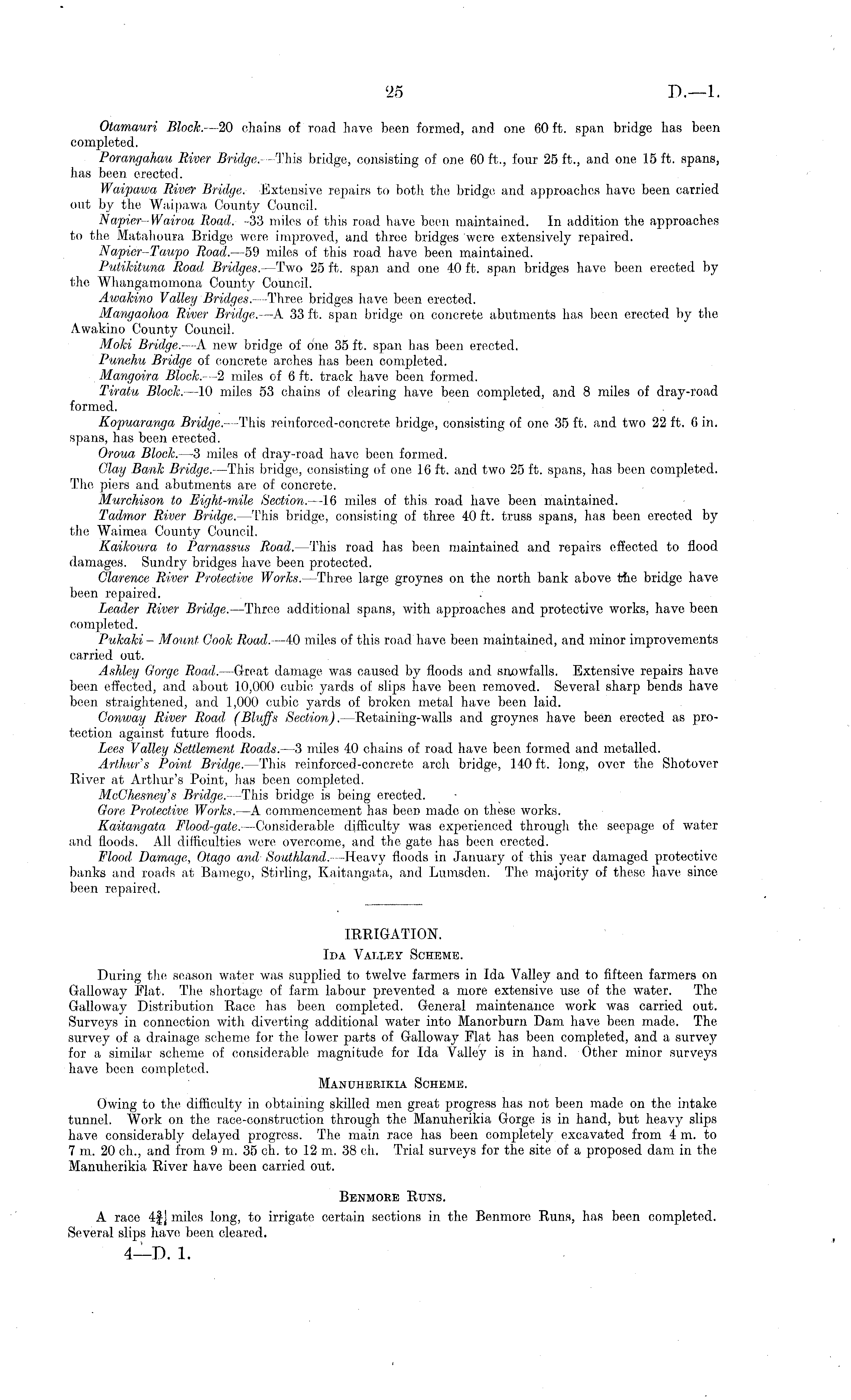 Otamauri Block.—2o chains of road have been formed, and one 60 ft. span bridge has been completed. Porangahau River Bridge. This bridge, consisting of one 60 ft., four 25 ft., and one 1.5 ft. spans, has been, erected. Waipawa River Bridge. Extensive repairs to both the bridge and approaches have been carried out by the Waipawa County Council. Napier-Wairoa Road.- -33 miles of this road have been maintained. In addition the approaches to the Matahoura Bridge wen; improved, and three bridges 'were extensively repaired. Napicr-Taupo Road. —s9 miles of this road have been maintained. Putikituna Road Bridges. —Two 25 ft. span and one 40 ft. span bridges have been erected by the Whangamomona County Council. Awakino Valley Bridges-Three bridges have been erected. Mangaohoa River Bridge. —A 33 ft. span bridge on concrete abutments has been erected by the Awakino County Council. Mold Bridge. -A new bridge of one 35 ft. span has been erected. Punehu Bridge of concrete arches has been completed. Mangoira Block. —2 miles of 6 ft. track have been formed. Tiralu Block. —10 miles 53 chains of clearing have been completed, and 8 miles of dray-road formed. Kopuaranga Bridge. —This reinforced-concrete bridge, consisting of one 35 ft. and two 22 ft. 6 in. spans, has been erected. Oroua Block. —3 miles of dray-road have been formed. Clay Bank Bridge. —This bridge, consisting of one 16 ft. and two 25 ft. spans, has been completed. The piers and abutments are of concrete. Murchison to Eight-mile Section— -16 miles of this road have been maintained. Tadrnor River Bridge. —This bridge, consisting of three 40 ft. truss spans, has been erected by the Waimca County Council. Kaikoura to Parnassus Road. —This road has been maintained and repairs effected to flood damages. Sundry bridges have been protected. Clarence River Protective Works. —Throe large groynes on the north bank above the bridge have been repaired. Leader River Bridge. —Three additional spans, with approaches and protective works, have been completed. Pukaki - Mount, Cook Road. —40 miles of this road have been maintained, and minor improvements carried out. Ashley Gorge Road. —Great damage was caused by floods and snowfalls. Extensive repairs have been effected, and about 10,000 cubic yards of slips have been removed. Several sharp bends have been straightened, and 1,000 cubic yards of broken metal have been laid. Conway River Road (Bluffs Section). —Retaining-walls and groynes have been erected as protection against future floods. Lees Valley Settlement Roads. —3 miles 40 chains of road have been formed and metalled. Arthur's Point Bridge. —This reinforced-concrete arch bridge, 140 ft. long, over the Shotover River at Arthur's Point, has been completed. MeChesney's Bridge. -This bridge is being erected. Gore Protective Works. —A commencement has been made on these works. Kaitangata Flood-gale. —Considerable difficulty was experienced through the seepage of water and floods. All difficulties were overcome, and the gate has been erected. Flood Damage, Otago and Southland. —Heavy floods in January of this year damaged protective banks and roads at Bamego, Stirling, Kaitangata, and Lumsden. The majority of these have since been repaired. IRRIGATION. Ida Valley Scheme. During the season water was supplied to twelve farmers in Ida Valley and to fifteen farmers on Galloway Flat. The shortage of farm labour prevented a more extensive use of the water. The Galloway Distribution Race has been completed. General maintenance work was carried out. Surveys in connection with diverting additional water into Manorburn Dam have been made. The survey of a drainage scheme for the lower parts of Galloway Flat has been completed, and a survey for a similar scheme of considerable magnitude for Ida Valley is in hand. Other minor surveys have been completed. Manuherikia Scheme. Owing to the difficulty in obtaining skilled men great progress has not been made on the intake tunnel. Work on the race-construction through the Manuherikia Gorge is in hand, but heavy slips have considerably delayed progress. The main race has been completely excavated from 4m. to 7m. 20 eh., and from 9m. 35 eh. to 12 m. 38 eh. Trial surveys for the site of a proposed dam in the Manuherikia River have been carried out. Benmore Runs. A race 4f J miles long, to irrigate certain sections in the Benmore Runs, has been completed. Several slips have been cleared.