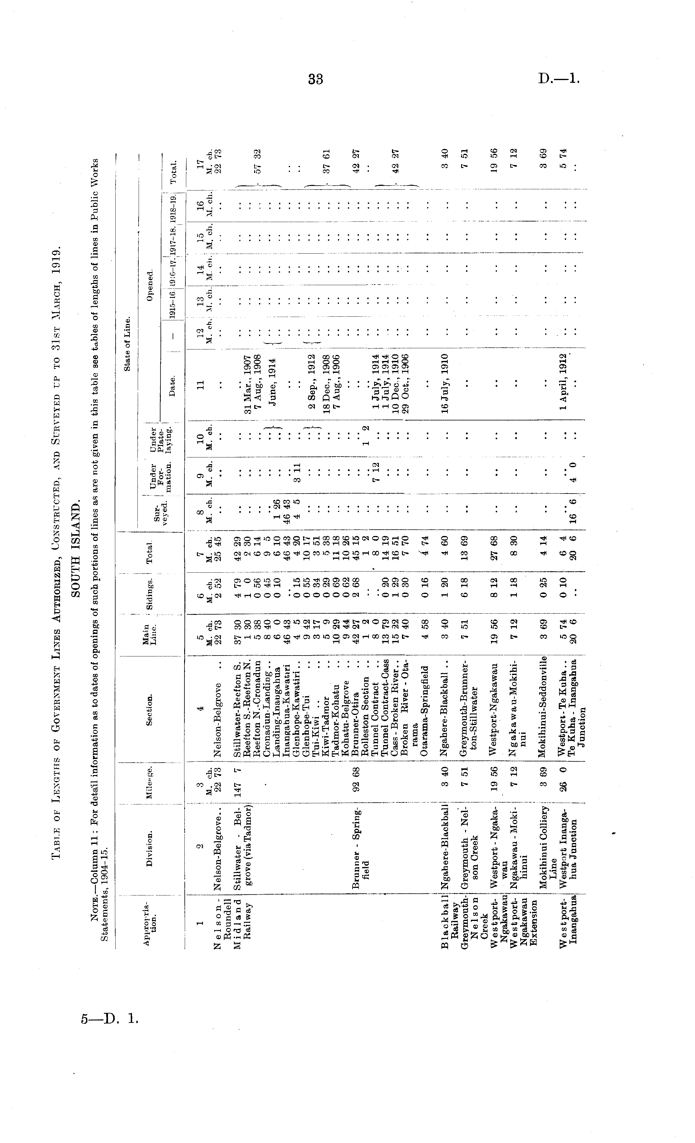 Note. —Column 11: For detail information as to dates of openings of such portions of lines as are not given in this table see tables of lengths of lines in Public Works Statements, 1904-15. Appro priation. Division. Mileage. Section. S Sidi^ s - I Total ■ Under Under I vev"ed For - Plate " ; ' mation. laying. State of Line. Opened. Dace. 1915-16. 1916-17. 1917-18. 191S-19.J Total. __L J I ' I I i I 1 2 3 4 M. ch. Nelson-Belgrove.. 22 73 Nelson-Belgrove Stillwater - Bel- 147 7 Stillwater-Reefton S. grove (viaTadmor) Reefton S.-ReeftonN. Reefton N.-Cronadun Cronadun-Landing .. Land ing- In an gahua Inangabua-Kawatiri Glenhope-Kawatiri.. Glenhope-Tui Tui-Kiwi Kiwi-Tadmor Tadmor-Kohatu Kohatu-Belgrove Brunner - Spring- 92 68 Brunner-Otira field Rolleston Section .. Tunnel Contract Tunnel Contraet-Cass Cass - Broken River.. Broken River - Otarama 0 tarama-Springfield 5 M. ch. 22 73 6 M. eh. 2 52 7 M. ch. 25 45 8 M. ch. 9 M. ch. 10 M. ch. 11 12 13 M. ch.; M. ch. 14 15 M. ch. M. ch. ' 16 I 17 M. eh. M. ch. 22 73 NelsonRoundell Midland Railway 37 30 1 30 5 38 8 40 6 0 46 43 4 5 9 42 3 17 5 9 10 29 9 44 42 27 1 2 8 0 13 79 15 22 7 40 4 79 1 0 0 56 0 45 0 10 6 15 0 55 0 34 0 29 0 69 0 62 2 68 6 20 1 29 0 30 42 29 2 30 6 14 9 5 6 10 46 43 4 20 10 17 3 51 5 38 11 18 10 26 45 15 1 2 8 0 14 19 16 51 7 70 J I !.:: :: ( .. .. .'. [ 57 32 :: I " .. [ 37 61 :: I 42 27 !- 42 27 .. .. - 31 Mar'., 1907 7 Aug., 1908 1 26 46 43 4 5 ::} June, 1914 3 11 :;. .. ■- 2 Sep., 1912 18 Dec, 1908 7 Aug., 1906 | I Brunner - Spring- 92 68 field 7 12 1 "2 .. 1 July, 1914 1 July, 1914 10 Dec, 1910 I 29 Oct., 1906 -• i - I Blackball Ngahere-Blackball 3 40 Railway Greymouth- Greymouth - Nel- 7 51 Nelson son Creek Creek Westport- Westport - Ngaka- 19 56 Ngakawau: wau Westport- Ngakawau -Moki- 7 12 Ngakawau hinui Extension ] Mokihinui Colliery 3 69 Line Westport- Westport Inanga- ! 26 0 Inangahua] hua Junction 4 58 0 16 i 74 .. Ngahere-Blackball! 3 40 j Ngahere-Blackball .. 3 40 1 20 j 4 60 16 July, 1910 3 40 Greymouth - Nel- 7 51 Greymouth-Brunner-son Creek ton-Stillwater 7 51 6 18 13 69 •■ 7 51 Westport - Ngaka- i 19 56 Westport-Ngakawau 19 56 8 12 27 68 19 56 wau Ngakawau -Moki- I 7 12 Ngakawau-Mokihi-hinui nui Mokihinui Colliery . 3 69 Mokihinui-Seddonvilie 7 12 3 69 1 18 0 25 8 30 4 14 i 7 12 3 69 5 74 Line Westport Inanga- 26 0 Westport - Te Kuha .. hua Junction Te Kuha - Inangahua i Junction 5 74 20 6 0 10 j 6 4 20 6 16 6 4 0 1 April, 1912 ■• I