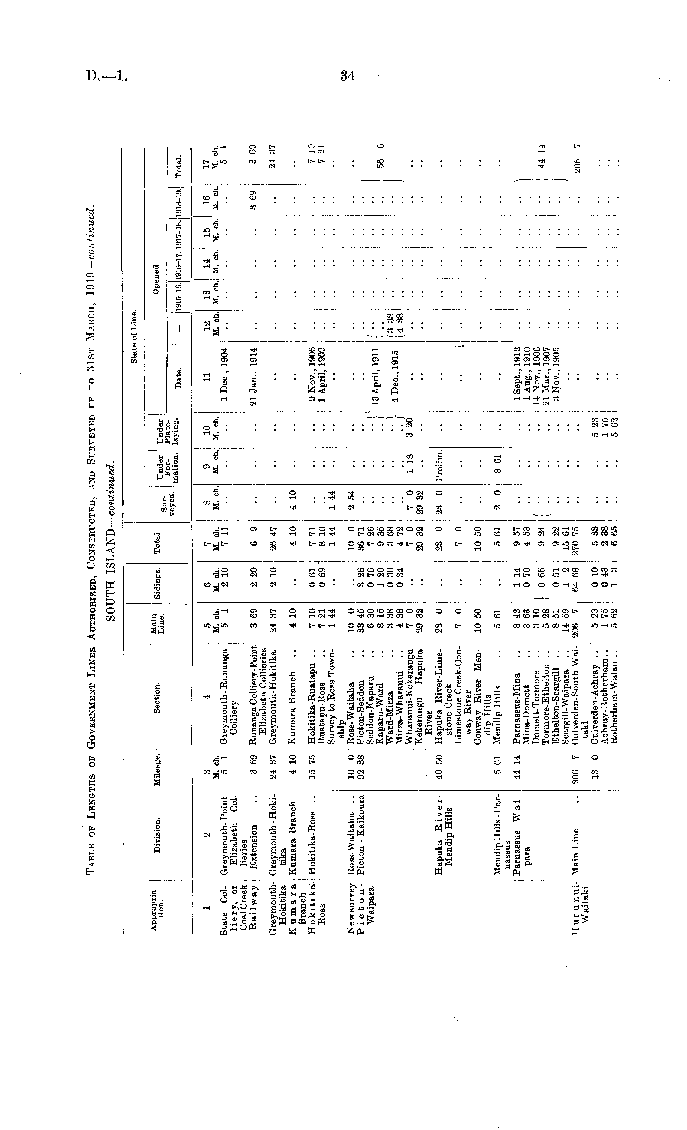 Table of Lengths of Government Lines Authorized, Constructed, and Surveyed up to 31st March, 1919— continued. SOUTH ISLAND— continued.