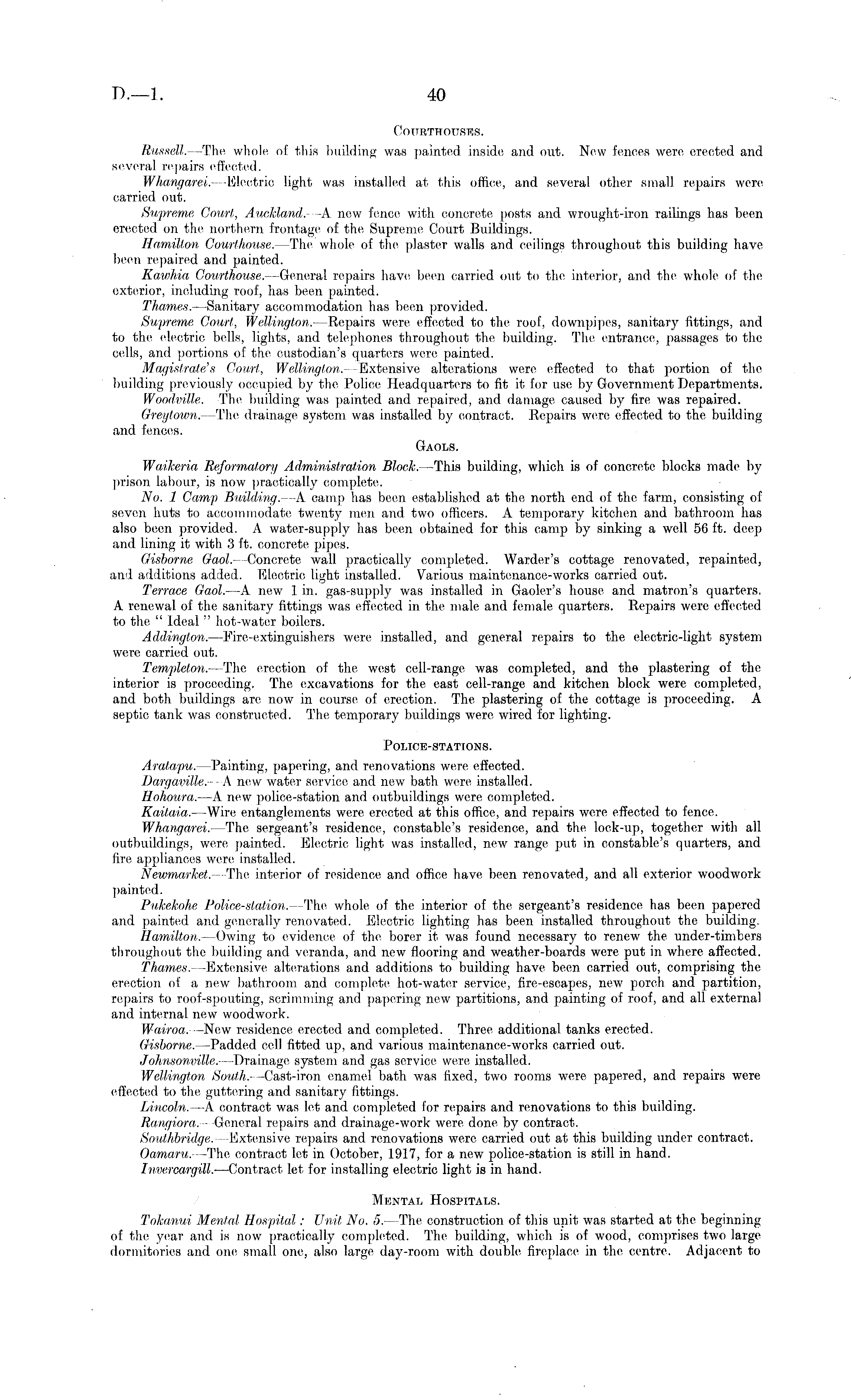 Courthouses. Russell. —The whole of this building was painted inside and out. New fences were, erected and several repairs effected. Whangarei. —Electric light was installed at this office, and several other small repairs were carried out. Supreme Court, Auckland—-A new fence with concrete posts and wrought-iron railings has been erected on the, northern frontage of the, Supreme Court Buildings. Hamilton Courthouse. —The whole of the plaster walls and ceilings throughout this building have been repaired and painted. Kawhia Courthouse. —General repairs have, been carried out to the interior, and the whole of the exterior, including roof, has been painted. Thames. —Sanitary accommodation has been provided. Supreme Court, Wellington. —Repairs were effected to the, roof, downpipes, sanitary fittings, and to the electric bells, lights, and telephones throughout the building. The entrance, passages to the cells, and portions of the custodian's quarters were painted. Magistrate's Court, Wellington. —Extensive alterations were effected to that portion of the building previously occupied by the Police Headquarters to fit it for use by Government Departments. Woodville.— -The building was painted and repaired, and damage, caused by fire was repaired. Greytown. —The drainage system was installed by contract. Repairs were effected to the building and fences. Gaols. Waikeria Reformatory Administration Block. —This building, which is of concrete blocks made by prison labour, is now practically complete. No. 1 Camp Building. —A. camp has been established at the north end of the farm, consisting of seven huts to accommodate twenty men and two officers. A temporary kitchen and bathroom has also been provided. A water-supply has been obtained for this camp by sinking a well 56 ft. deep and lining it with 3 ft. concrete pipes. Gisborne Gaol.- -Concrete wall practically completed. Warder's cottage, renovated, repainted, and additions added. Electric light installed. Various maintenance-works carried out. Terrace Gaol. —A new 1 in. gas-supply was installed in Gaoler's house and matron's quarters. A renewal of the sanitary fittings was effected in the, male and female quarters. Repairs were effected to the " Ideal " hot-water boilers. Addinglon. —Fire-extinguishers were installed, and general repairs to the electric-light system were carried out. Templeton. —The erection of the west cell-range was completed, and the plastering of the interior is proceeding. The excavations for the east cell-range and kitchen block were completed, and both buildings are, now in course, of erection. The plastering of the cottage is proceeding. A septic tank was constructed. The temporary buildings were, wired for lighting. PoLICE-STAT'ONS. Aratapu. —Painting, papering, and renovations were, effected. Dargaville. —A new water service and new bath were installed. Hohoura. —A new police-station and outbuildings were completed. Kaitaia. —Wire entanglements were erected at this office, and repairs were effected to fence. Whangarei. —The sergeant's residence, constable's residence, and the lock-up, together with all outbuildings, were painted. Electric, light was installed, new range put in constable's quarters, and fire appliances were, installed. Newmarket. —The interior of residence and office have, been renovated, and all exterior woodwork painted. Pukekohe Police-station. —The whole of the interior of the sergeant's residence has been papered and painted and generally renovated. Electric lighting has been installed throughout the building. Hamilton. —Owing to evidence of the borer it was found necessary to renew the under-timbers throughout the building and veranda, and new flooring and weather-boards were put in where affected. Thames. —Extensive, alterations and additions to building have been carried out, comprising the erection of a new bathroom and complete hot-water service, fire-escapes, new porch and partition, repairs to roof-spouting, scrimming and papering new partitions, and painting of roof, and all external and internal new woodwork. Wairoa. —New residence erected and completed. Three, additional tanks erected. Gisborne. —Padded cell fitted up, and various maintenance-works carried out. Johnsonville.- —Drainage system and gas service were installed. Wellington South. —Cast-iron enamel bath was fixed, two rooms were papered, and repairs were effected to the guttering and sanitary fittings. Lincoln. —A contract was let and completed for repairs and renovations to this building. Rarufiora. - -General repairs and drainage-work were done, by contract. Southbridge. —Extensive repairs and renovations were carried out at this building under contract. Oamaru. —The contract let in October, 1917, for a new police-station is still in hand. Invercargill.- —Contract let for installing electric light is in hand. Mental Hospitals. Tokanui Mental Hospital: Unit No. s. —The construction of this unit was started at the beginning of the year and is now practically completed. The building, which is of wood, comprises two large dormitories and one small one, also large day-room with double fireplace in the, centre. Adjacent to
