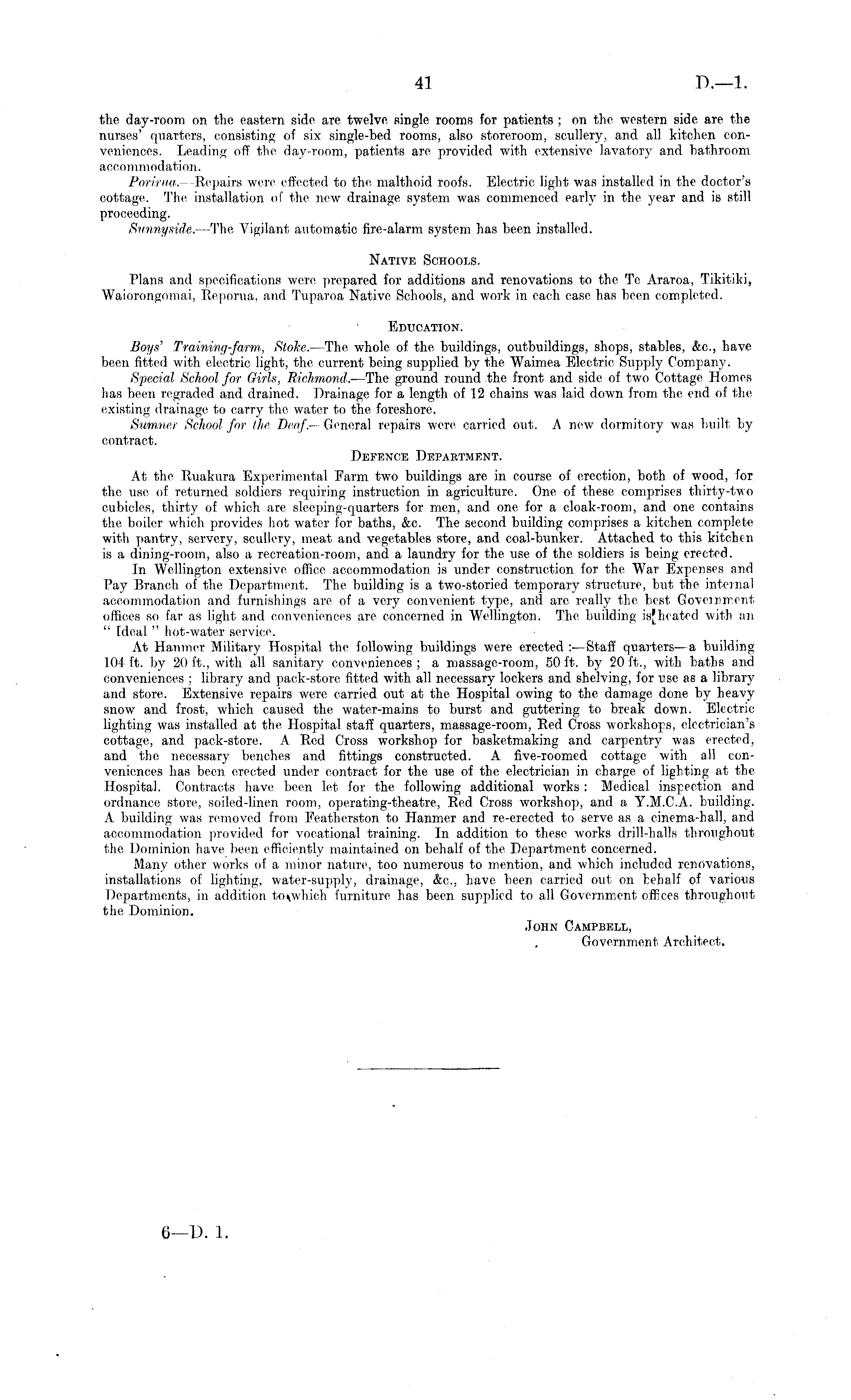 the day-room on the eastern side are twelve single rooms for patients ; on the western side are the nurses' quarters, consisting of six single-bed rooms, also storeroom, scullery, and all kitchen conveniences. Leading off the day-room, patients are provided with extensive lavatory and bathroom accommodation. Porirua. —Repairs were effected to the malthoid roofs. Electric light was installed in the doctor's cottage. The installation of the new drainage system was commenced early in the year and is still proceeding. Sunnyside. —The Vigilant automatic fire-alarm system has been installed. Native Schools. Plans and specifications were prepared for additions and renovations to the Te Araroa, Tikitiki, Waiorongomai, Reporua, and Tuparoa Native Schools, and work in each case has been completed. Education. Boys' Training-farm, Stoke. —The, whole of the buildings, outbuildings, shops, stables, &c, have been fitted with electric light, the, current being supplied by the Waimea Electric Supply Company. Special School for Girls, Richmond.—The ground round the front and side of two Cottage, Homes has been regraded and drained. Drainage for a length of 12 chains was laid down from the end of the existing drainage to carry the water to the foreshore. Sumner School for the Deaf.- General repairs were carried out. A new dormitory was built by contract. Defence Department. At the Ruakura Experimental Farm two buildings are in course of erection, both of wood, for the use, of returned soldiers requiring instruction in agriculture. One of these comprises thirty-two cubicles, thirty of which are sleeping-quarters for men, and one for a cloak-room, and one contains the boiler which provides hot water for baths, &c. The second building comprises a kitchen complete with pantry, servery, scullery, meat and vegetables store, and coal-bunker. Attached to this kitchen is a dining-room, also a recreation-room, and a laundry for the use of the soldiers is being erected. In Wellington extensive office accommodation is under construction for the War Expenses and Pay Branch of the Department. The building is a two-storied temporary structure, but the internal accommodation and furnishings are of a very convenient type, and are really the best Government offices so far as light and conveniences are concerned in Wellington. The building isjheated with an " [deal " hot-water service. At Hanmer Military Hospital the following buildings were erected :— Staff quarters—a building 104 ft. by 20 ft., with all sanitary conveniences; a massage-room, 50 ft. by 20 ft., with baths and conveniences ; library and pack-store fitted with all necessary lockers and shelving, for -use, as a library and store. Extensive repairs were carried out at the, Hospital owing to the damage done by heavy snow and frost, which caused the, water-mains to burst and guttering to break down. Electric lighting was installed at the Hospital staff quarters, massage-room, Red Cross workshops, electrician's cottage, and pack-store. A Red Cross workshop for basketmaking and carpentry was erected, and the necessary benches and fittings constructed. A five-roomed cottage with all conveniences has been erected under contract for the use of the electrician in charge of lighting at the Hospital. Contracts have been let for the, following additional works : Medical inspection and ordnance store, soiled-linen room, operating-theatre, Red Cross workshop, and a V.M.C.A. building. A. building was removed from Featherston to Hanmer and re-erected to serve as a cinema-hall, and accommodation provided for vocational training. In addition to these works drill-halls throughout the Dominion have been efficiently maintained on behalf of the, Department concerned. Many other works of a minor nature, too numerous to mention, and which included renovations, installations of lighting, water-supply, drainage, &c, have been carried out on behalf of various Departments, in addition tovwliich furniture has been supplied to all Government offices throughout the, Dominion. John Campbell, Government Architect.
