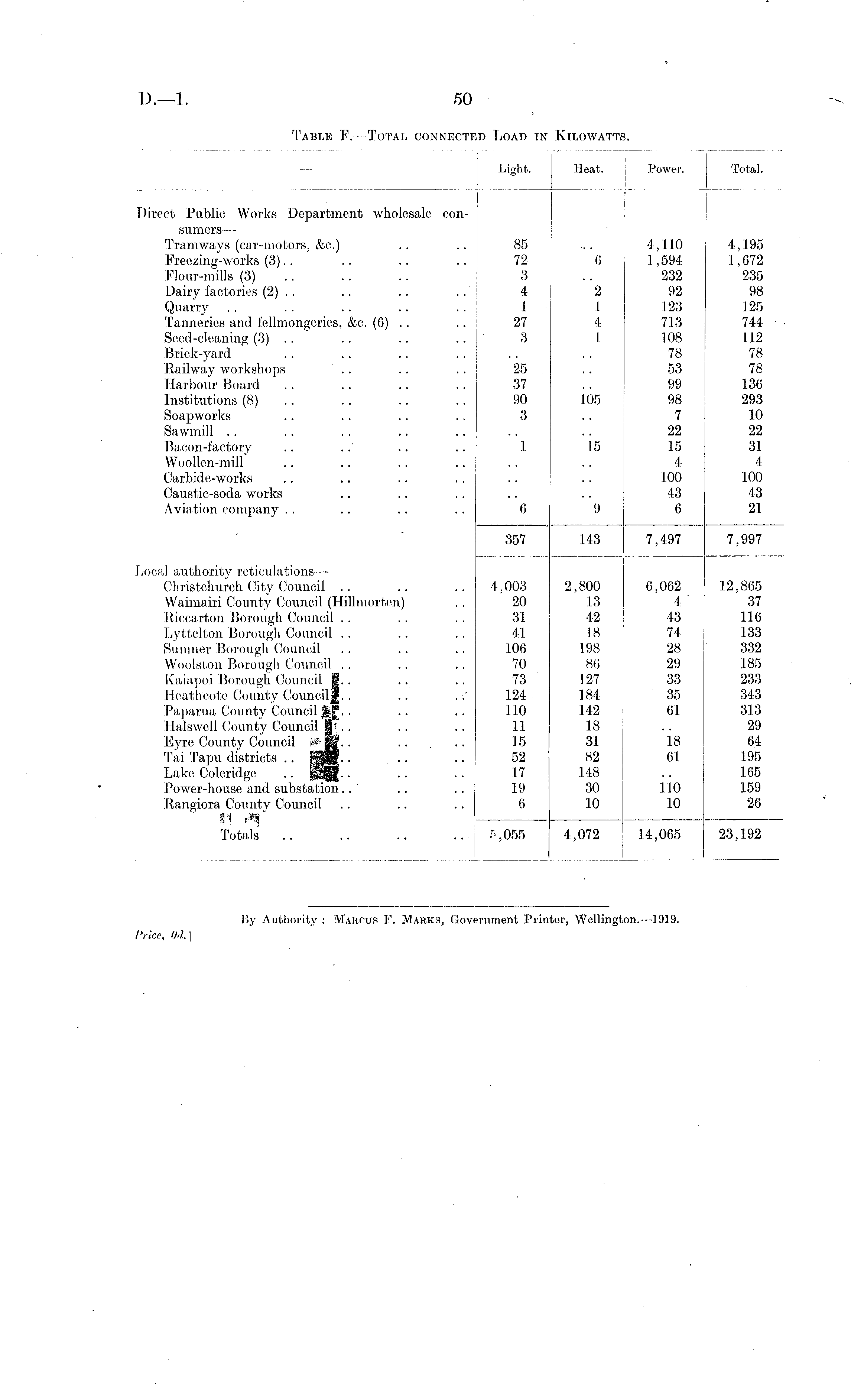 Light. Heat. Power, Total. Direct Public Works Department wholesale sumersTramways (car-motors, &c.) Freezing-works (3).. Flour-mills (3) Dairy factories (2) . . Quarry Tanneries and fellmongeries, &c. (6) .. Seed-cleaning (3) . . Brick-yard Railway workshops Harbour Board Institutions (8) .. Soapworks Sawmill Bacon-factory Woollen-mill Carbide-works Caustic-soda works Aviation company 85 72 3 4 1 27 3 6 4,110 1,594 232 92 123 713 108 78 53 99 98 7 22 15 4 too 43 6 4,195 1,672 235 98 125 744 112 78 78 136 293 10 22 31 4 100 43 21 2 I 4 1 25 37 90 3 105 1 15 6 9 357 143 7,497 7,997 Local authority reticulations — Christchiirch City Council Waimairi County Council (Hillmorten) Riccarton Borough Council .. .. Lyttelton Borougli Council Sunnier Borough Council Woolston Borough Council. Kaiapoi Borough Council fi.. Ileathcote County Councili.. .. . < Paparua County Council M; Halswell County Council W ■ ■ Eyre County Council 'f___- ■ Tai Tapu districts .. SSI- • Lake Coleridge . . pUf - • Power-house and substation Rangiora County Council Totals .. 4,003 20 31 41 106 70 73 124 110 11 15 52 17 19 6 ... 2,800 13 42 18 198 86 127 184 142 18 31 82 148 30 10 6,062 4 " 43 74 28 29 33 35 61 12,865 37 116 133 332 185 233 343 313 29 64 195 165 159 26 18 61 lio 10 5,055 4,072 14,065 23,192