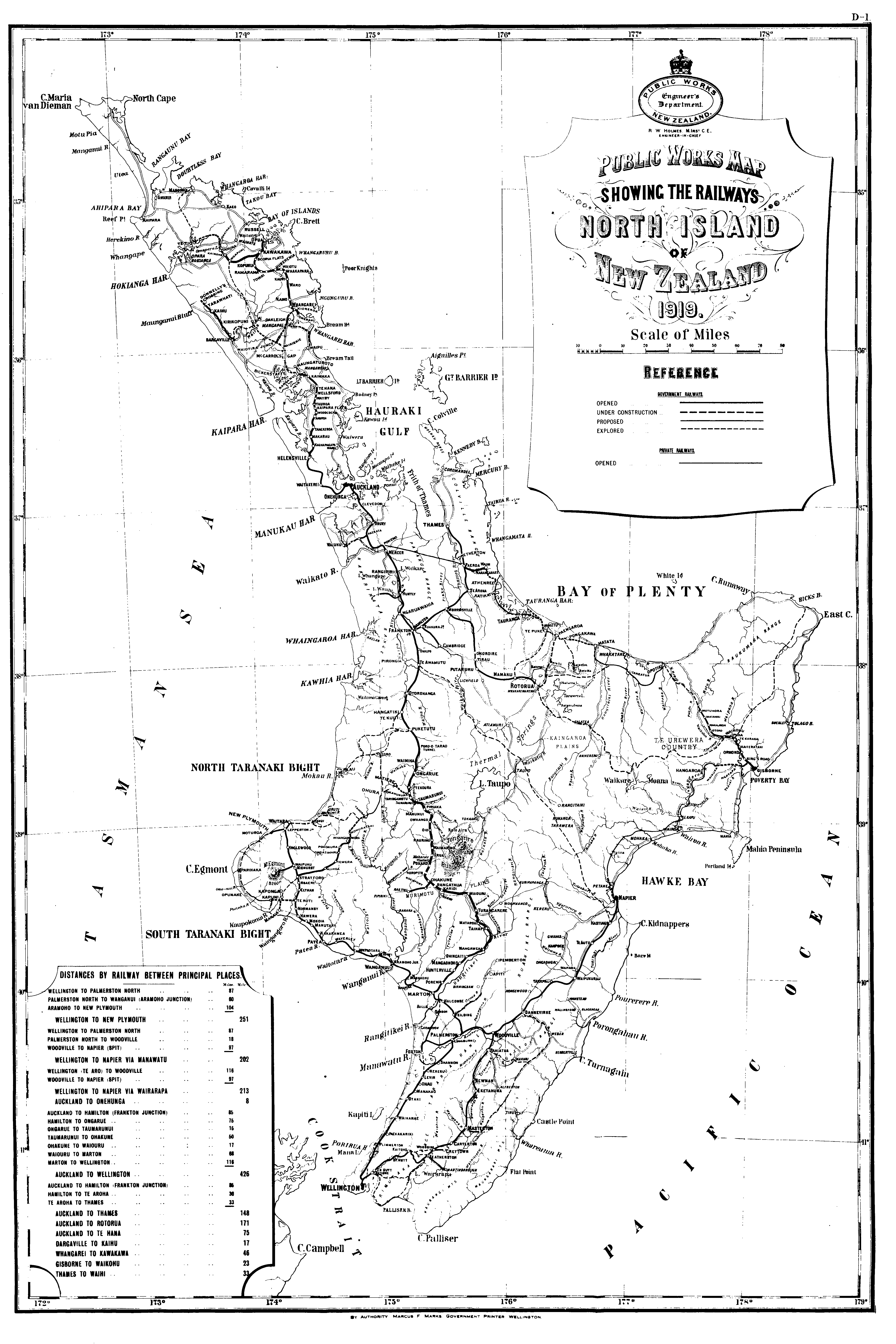 Public Works Map SHOWING THE RAILWAYS NORTH ISLAND OF New Zealand 1919.