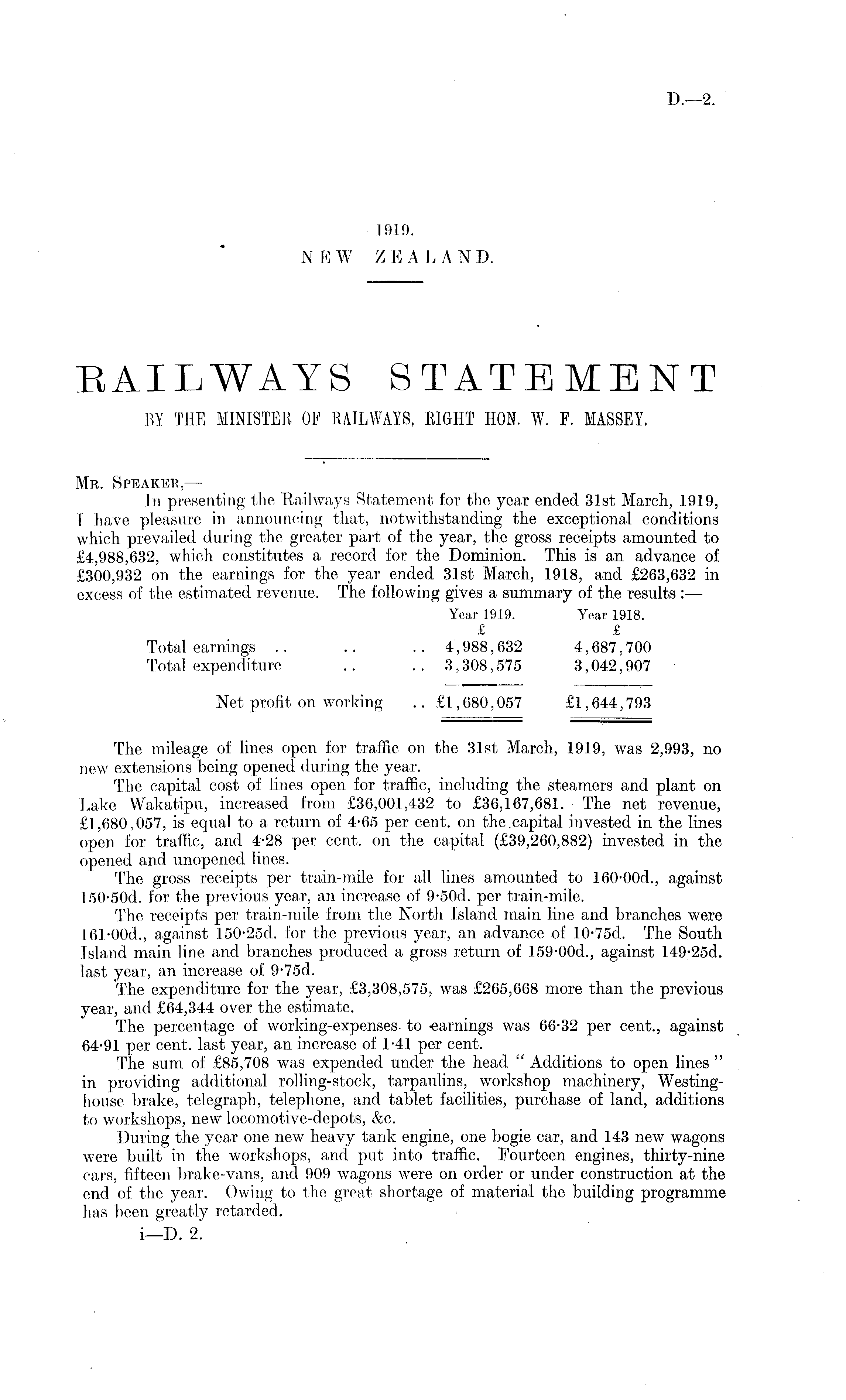 Mr. Speaker,— In presenting the Railways Statement for the year ended 31st March, 1919, I have pleasure in announcing that, notwithstanding the exceptional conditions which prevailed during the greater part of the year, the gross receipts amounted to £4,988,632, which constitutes a record for the Dominion. This is an advance of £300,932 on the earnings for the year ended 31st March, 1918, and £263,632 in excess of the estimated revenue. The following gives a summary of the results :— Year 1919. Year 1918. £ £ Total earnings .. .. .. 4,988,632 4,687,700 Total expenditure .. .. 3,308,575 3,042,907 Net profit on working .. £l, 680,057 £l, 644,793 The mileage of lines open for traffic on the 31st March, 1919, was 2,993, no new extensions being opened during the year. The capital cost of lines open for traffic, including the steamers and plant on Lake Wakatipu, increased from £36,001,432 to £36,167,681. The net revenue, £1,680,057, is equal to a return of 4-65 per cent, on the.capital invested in the lines open for traffic, and 4-28 per cent, on the capital (£39,260,882) invested in the opened and unopened lines. The gross receipts per train-mile for all lines amounted to 160-OOd., against 150-50 d. for the previous year, an increase of 9-50 d. per train-mile. The receipts per train-mile from the North Island main line and branches were 161-OOd., against 150-25 d. for the previous year, an advance of 10-75 d. The South Island main line and branches produced a gross return of 159-00 d., against 149-25 d. last year, an increase of 9-75 d. The expenditure for the year, £3,308,575, was £265,668 more than the previous year, and £64,344 over the estimate. The percentage of working-expenses to -earnings was 66-32 per cent., against 64-91 per cent, last year, an increase of 1-41 per cent. The sum of £85,708 was expended under the head " Additions to open lines " in providing additional rolling-stock, tarpaulins, workshop machinery, Westinghouse brake, telegraph, telephone, and tablet facilities, purchase of land, additions to workshops, new locomotive-depots, &c. During the year one new heavy tank engine, one bogie car, and 143 new wagons were built in the workshops, and put into traffic. Fourteen engines, thirty-nine cars, fifteen brake-vans, and 909 wagons were on order or under construction at the end of the year. Owing to the great shortage of material the building programme has been greatly retarded.