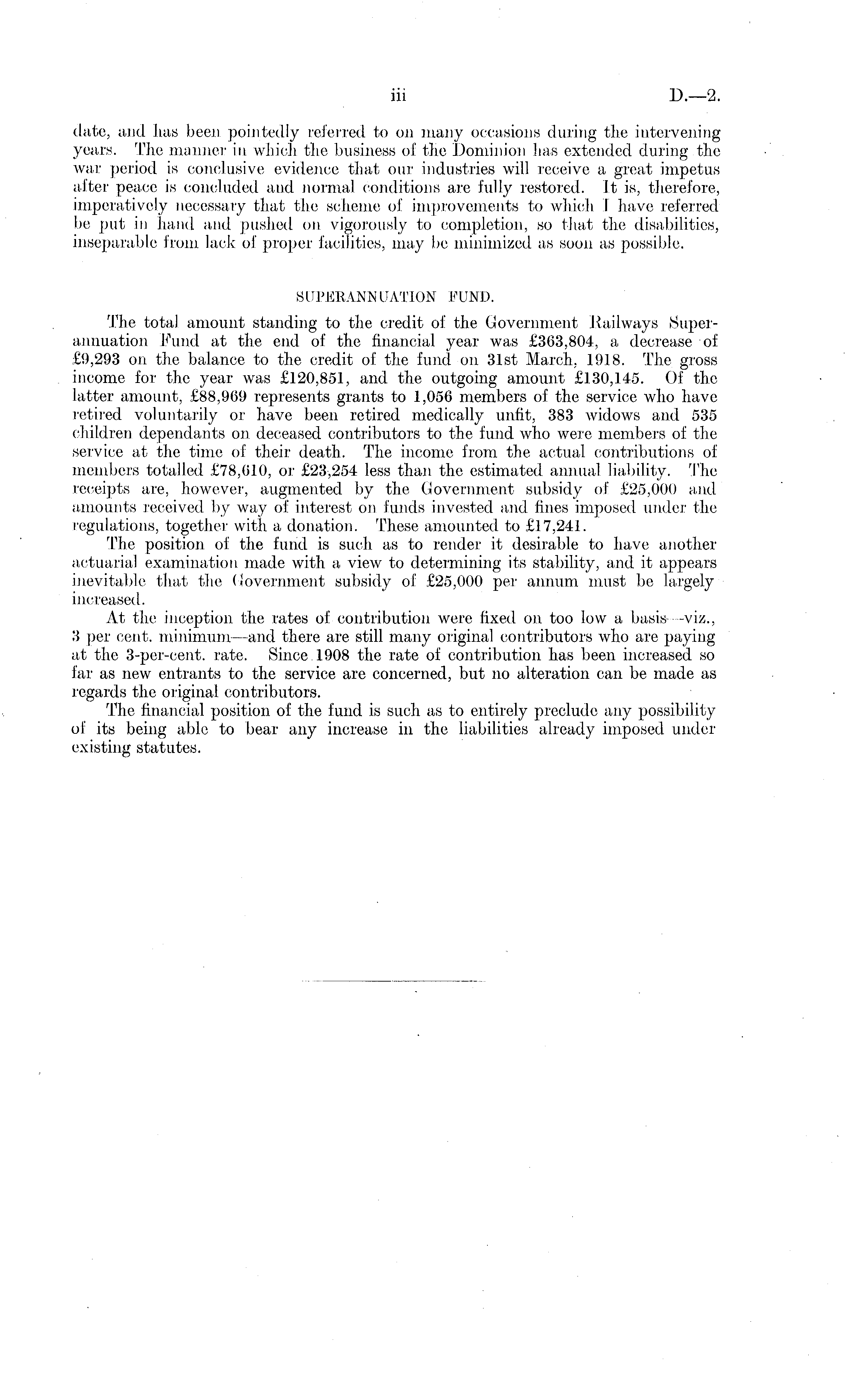 date, and has been pointedly referred to on many occasions during the intervening years. The manner in which the business of the Dominion has extended during the war period is conclusive evidence that our industries will receive a great impetus after peace is concluded and normal conditions are fully restored. It is, therefore, imperatively necessary that the scheme of improvements to which I have referred be put in hand and pushed on vigorously to completion, so that the disabilities, inseparable from lack of proper facilities, may be minimized as soon as possible. SUPERANN UATION FUND. The total amount standing to the credit of the Government Railways Superannuation Fund at the end of the financial year was £363,804, a decrease of £9,293 on the balance to the credit of the fund on 31st March, 1918. The gross income for the year was £120,851, and the outgoing amount £130,145. Of the latter amount, £88,969 represents grants to 1,056 members of the service who have retired voluntarily or have been retired medically unfit, 383 widows and 535 children dependants on deceased contributors to the fund who were members of the service at the time of their death. The income from the actual contributions of members totalled £78,610, or £23,254 less than the estimated annual liability. The receipts are, however, augmented by the Government subsidy of £25,000 and amounts received by way of interest on funds invested and fines imposed under the regulations, together with a donation. These amounted to £17,241. The position of the fund is such as to render it desirable to have another actuarial examination made with a view to determining its stability, and it appears inevitable that the Government subsidy of £25,000 per annum must be largely increased. At the inception the rates of contribution were fixed on too low a basis viz., 3 per cent, minimum—and there are still many original contributors who are paying at the 3-per-cent. rate. Since 1908 the rate of contribution has been increased so far as new entrants to the service are concerned, but no alteration can be made as regards the original contributors. The financial position of the fund is such as to entirely preclude any possibility of its being able to bear any increase in the liabilities already imposed under existing statutes.