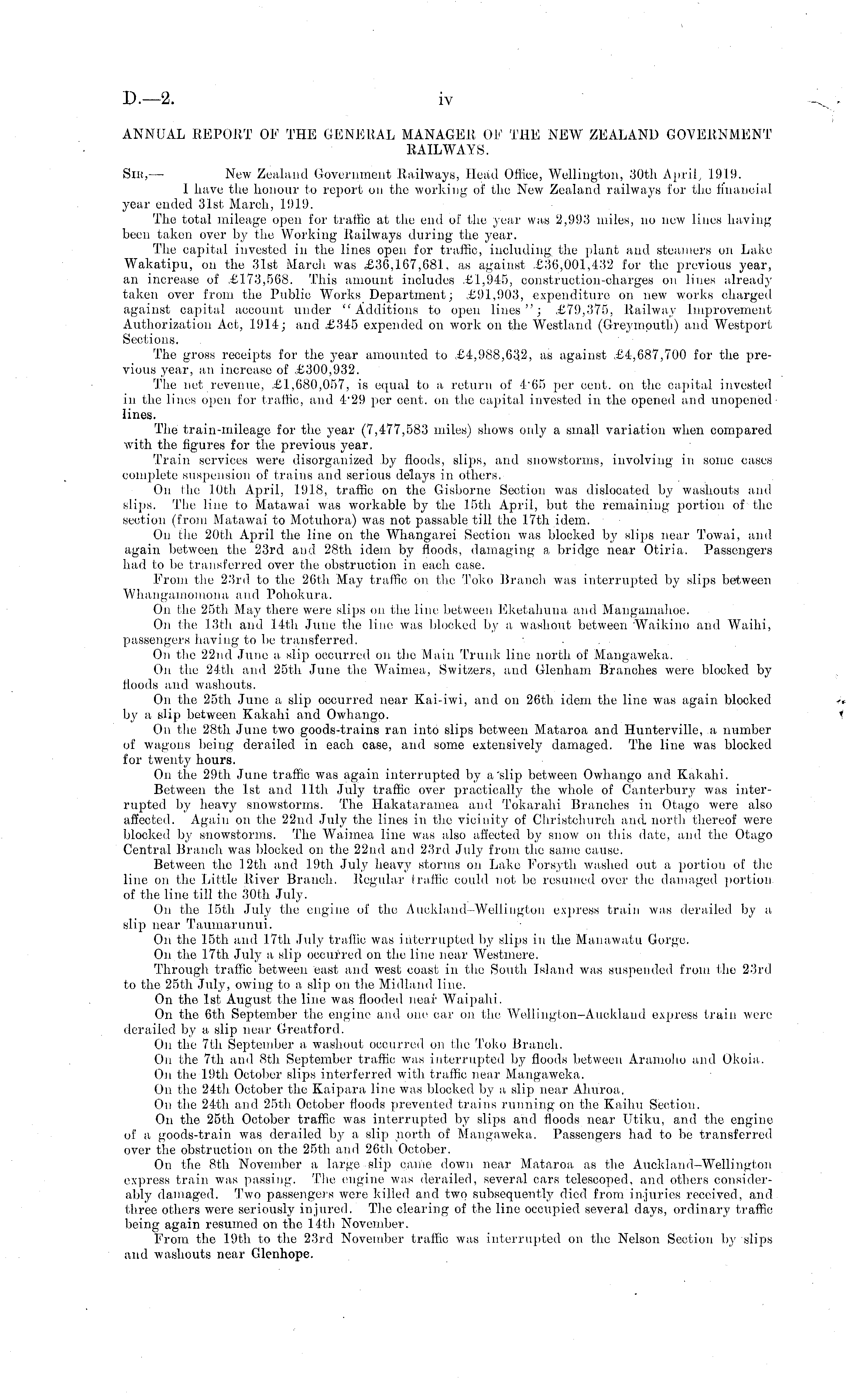 ANNUAL REPORT OP THE GENERAL MANAGE!!, OF THE NEW ZEALAND GOVERNMENT RAILWAYS. Sir, — New Zealand Government Railways, Head Office, Wellington, 30th April, 1919. I have the honour to report on the working of the New Zealand railways for the financial year ended 31st March, 191!). The total mileage open for traffic at the end of the year was 2,993 miles, no new lines having been taken over by the Working Railways during the year. The capital invested in the lines open for traffic, including the plant and steamers on Lake Wakatipu, on the 31st March was £36,167,681, as against £36,001,432 for the previous year, an increase of ,£173,568. This amount includes £1,945, construction-charges on lines already taken over from the Public Works Department; £91,903, expenditure on new works charged against capital account under "Additions to open lines"; £79,375, Railway Improvement Authorization Act, 1914; and £345 expended on work on the Westland (Greymouth) and Westport Sections. The gross receipts for the year amounted to £4,988,632, as against £4,687,700 for the previous year, an increase of £300,932. The net revenue, £1,680,057, is equal to a, return of 465 per cent, on the capital invested in the lines open for traffic, and 4"29 per cent, on the capital invested in the opened and unopened lines. The train-mileage for the year (7,477,583 miles) shows only a small variation when compared with the figures for the previous year. Train services were disorganized by floods, slips, and snowstorms, involving in some oases complete suspension of trains and serious delays in others. On Ihe 10th April, 1918, traffic on the Gisbonie Section was dislocated by washouts and slips. Tin: line to Matawai was workable by the 15th April, but the remaining portion of the section (from Matawai to Motuhora) was not passable till the 17th idem. On the 20th April the line on the Whangarei Section was blocked by slips near Towai, and again between the 23rd and 28th idem by floods, damaging a bridge near Otiria. Passengers had to be transferred over the obstruction in each case. From the 23rd to the 26th May traffic on the Toko Branch was interrupted by slips between Whangainoinona and Pohokura. On the 25th May there were slips en the line between Eketahuna, and Mangamahoc. On the 13th and 14th June the line was blocked by a, washout between Waikino and Waihi, passengers having to be transferred. On the 22nd June a, slip occurred on the Main Trunk line north of Mangaweka. On the 24th and 25th June the Waimea,, Switzers, and Glenham Branches were blocked by floods and washouts. On tho 25th June a slip occurred near Kai-iwi, and on 26th idem the line was again blocked by a slip between Kakahi and Owhango. On the 28th June two goods-trains ran into slips between Mataroa and Hunterville, a number of wagons being derailed in each case, and some extensively damaged. The line was blocked for twentjr hours. On the 29th June traffic was again interrupted by a'slip between Owhango and Kakahi. Between the Ist and 11th July traffic over practically the whole of Canterbury was interrupted by heavy snowstorms. The Hakataramea and Tokarahi Branches in Otago were also affected. Again on the 22nd July the lines in the vicinity of Christchurch and. north thereof were blocked by snowstorms. The Waimea line was also affected by snow on this date, and the Otago Central Branch was blocked on the 22nd and 23rd July from the same cause. Between the 12th and 19th July heavy storms on Lake Forsyth washed out a, portion of the line on the Little River Branch. Regular traffic could not be resumed over the damaged portion of the line till the 30th July. On the 15th July the engine of the Auckland-Wellington express train was derailed by a, slip near Taumarunui. On the 15th and 17th July traffic was interrupted by slips in the Manawatu Gorge. On the 17th July a slip occurred on the line near Westmere. Through traffic between east and west coast in the South Island was suspended from the 23rd to the 25th July, owing to a slip on the Midland line. On the Ist August the line was flooded near Waipahi. On the 6th September the engine and one car on the Wellington-Auckland express train were derailed by a slip near Greatford. On the 7th September a washout occurred on the Toko Branch. On the 7th and Bth September traffic was interrupted by floods between Aramoho and Okoia. On the 19th October slips interferred with traffic near Mangaweka. On the 24th October the Kaipara line was blocked by a slip near Ahuroa. On the 24th and 25th October Hoods prevented trains running on the Kaihu Section. On the 25th October traffic was interrupted by slips and floods near Utiku, and the engine of a, goods-train was derailed by a slip north of Mangaweka. Passengers had to be transferred over the obstruction on the 25th and 26th October. On the Bth November a large slip came down near Mataroa as the Auckland-Wellington express train was passing. The engine was derailed, several cars telescoped, and others considerably damaged. Two passengers were killed and two subsequently died from injuries received, and three others were seriously injured. The clearing of the line occupied several days, ordinary trafficbeing again resumed on the 14th November. From the 19th to the 23rd November traffic was interrupted on the Nelson Section by slips and washouts near Glenhope.