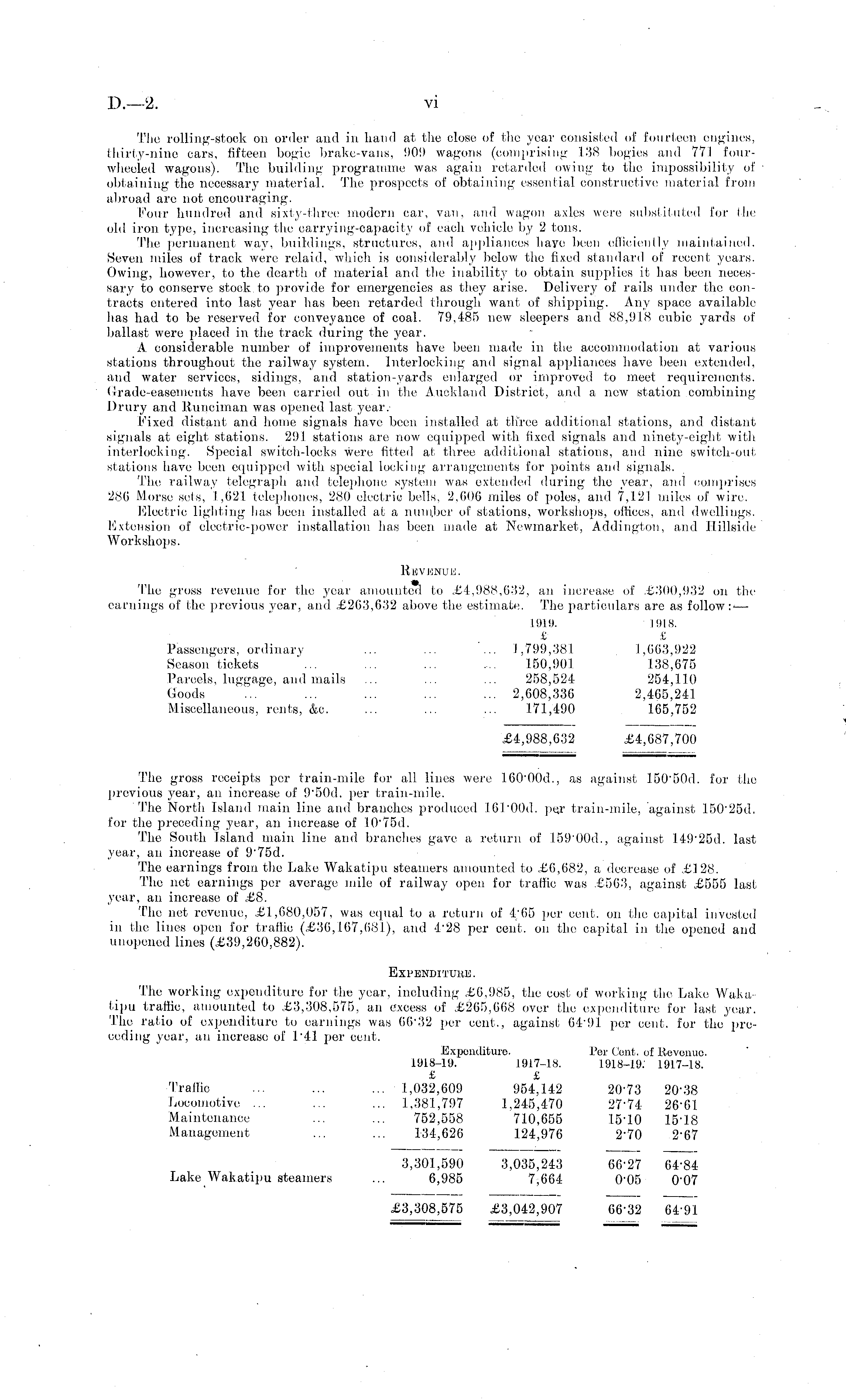 The rolling-stock on order and in hand at the close of the year consisted of fourteen engines, thirty-nine cars, fifteen bogie brake-vans, 909 wagons (comprising 138 bogies and 771 fourwheeled wagons). The building programme was again retarded owing to the impossibility of obtaining the necessary material. The prospects of obtaining essential constructive material from abroad are not encouraging. Four hundred and sixty-three modern car, van, and wagon axles were substituted for the old iron type, increasing the carrying-capacity of each vehicle by 2 tons. The permanent way, buildings, structures, and appliances have been efficiently maintained. Seven miles of track were relaid, which is considerably below the fixed standard of recent years. Owing, however, to the dearth of material and the inability to obtain supplies it has been necessary to conserve stock,to provide for emergencies as they arise. Delivery of rails under the contracts entered into last year has been retarded through want of shipping. Any space available has had to be reserved for conveyance of coal. 79,485 new sleepers and 88,918 cubic yards of ballast were placed in the track during the year. A considerable number of improvements have been made in the accommodation at various stations throughout the railway system. Interlocking and signal applianoes have been extended, and water services, sidings, and enlarged or improved to meet requirements. Grade-easements have been carried, out in the Auckland District, and a new station combining Drury and Runciman was opened last year. Fixed distant and home signals have been installed at three additional stations, and distant signals at eight, stations. 291 stations are now equipped with fixed signals and ninety-eight with interlocking. Special switch-locks were fitted at three additional stations, and nine switch-out; stations have been equipped with special locking arrangements for points and signals. The railway telegraph and telephone system was extended during the year, and comprises 286 Morse sets, 1,621 telephones, 280 electric bells, 2,606 miles of poles, and 7,121 miles of wire. Electric lighting has been installed at a number of stations, workshops, offices, and dwellings. Extension of electric-power installation has been made at Newmarket, Addington, and Hillside Workshops. Revenue. The gross revenue for the year amounted to £4,988,632, an increase, of ,£300,932 on the earnings of the previous year, and £263,632 above the estimate. The particulars are as follow :< — 1919. 19 I,S. ' £ £ Passengers, ordinary ... ... ... 1,799,381 1,663,922 Season tickets ... ... ... ... 150,901 138,675 Parcels, luggage, and mails ... ... ... 258,524 254,110 Goods ... ... ... ... ... 2,608,336 2,465,241 Miscellaneous, rents, &c. ... ... ... 171,490 165,752 £4,988,632 £4,687,700 The gross receipts per train-mile for all lines were 160'00d., as against 150'50d. for the previous year, an increase of 9'sod. per train-mile. The North Island main line and branches produced 161'00d. per train-mile, against 150'25d. for the preceding year, an increase of 10'75d. The South Island main line and branches gave, a return of 159'00d., against 149'25d. last year, an increase of 9'75d. The earnings from the Lake Wakatipu steamers amounted to £6,682, a decrease of £128. The net earnings per average mile of railway open for traffic was £563, against £555 last year, an increase of £8. The net revenue, £1,680,057, was equal to a return of 465 per cent, on the capital invested in the lines open for traffic (£36,167,681), and 428 per cent, on the capital in the opened and unopened lines (£39,260,882). Expenditure. The working expenditure for the year, including £6,985, the cost of working the Lake Wakatipu traffic, amounted to £3,308,575, an excess of £265,668 over the expenditure for last; year. The ratio of expenditure to earnings was 66-32 per cent., against 6491 per cent, for the' preceding year, an increase of U4l per cent. Expenditure. Per Cent, of Revenue. 1918-19. 1917-18. 1918-19: 1917-18. £ £ Traffic ... ... ... 1,032,609 954,142 20-73 20-38 Locomotive ... ... ... 1,381,797 1,245,470 2774 26-61 Maintenance ... ... 752,558 710,655 1510 1518 Management .... ... 134,626 124,976 2"70 2"67 3,301,590 3,035,243 66-2.7 64-84 Lake Wakatipu steamers ... 6,985 7,664 0-05 o'o7 £3,308,575 £3,042,907 6632 64-91