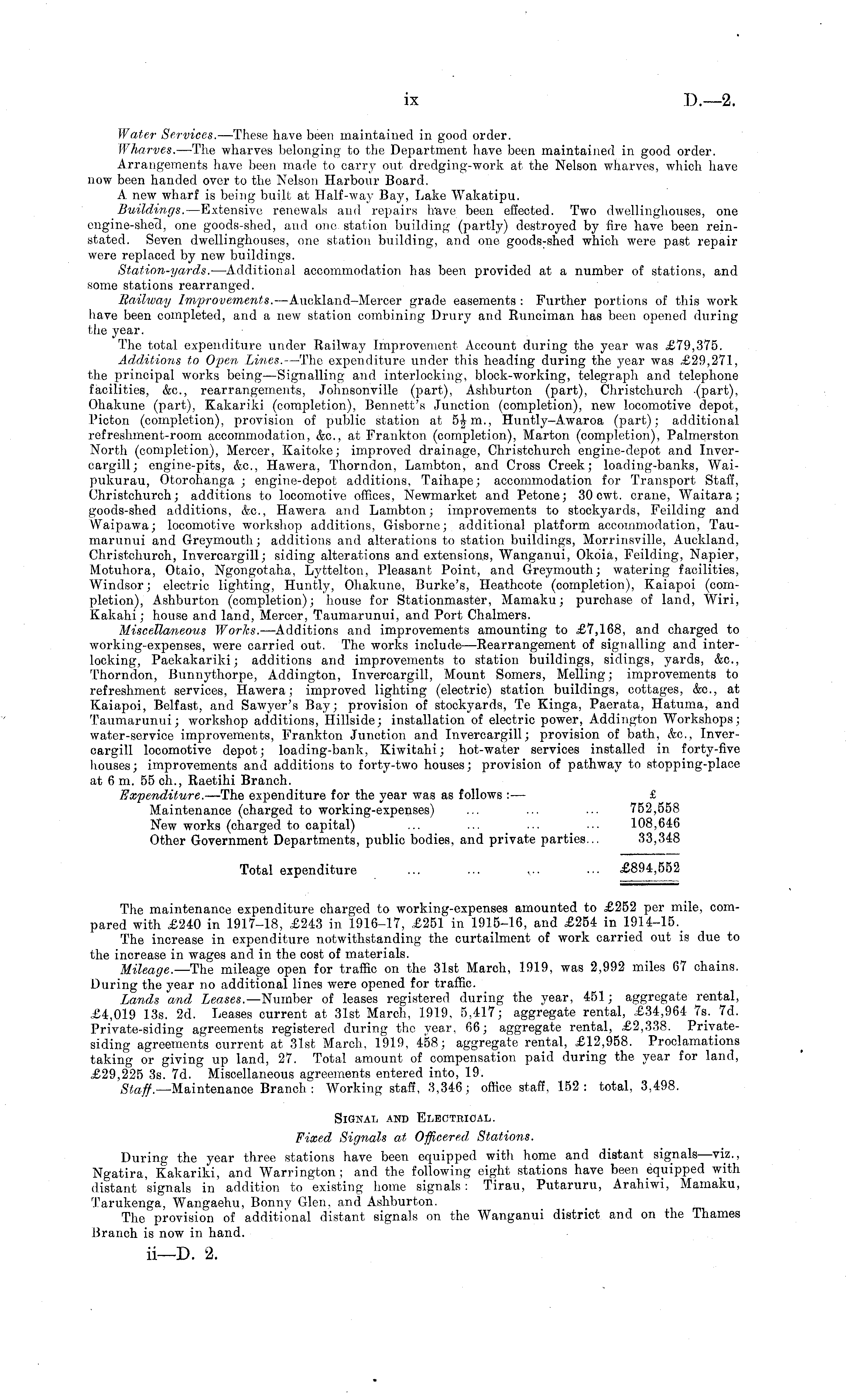 Water Services. —These have been maintained in good order. Wharves. —The wharves belonging to the Department have been maintained in good order. Arrangements have been made to carry out dredging-work at the Nelson wharves, which have now been handed over to the Nelson Harbour Board. A new wharf is being built at Half-way Bay, Lake Wakatipu. Buildings. —Extensive renewals and repairs brave been effected. Two dwellinghouses, one engine-shecl, one goods-shed, and one, station building (partly) destroyed by fire have been reinstated. Seven dwellinghouses, one station building, and one goods : shed which were past repair were replaced by new buildings. Station-yards. —Additional accommodation has been provided at a number of stations, and some stations rearranged. Railway Improvements. —Auckland-Mercer grade easements : Further portions of this work have been completed, and a new station combining Drury and Runciman has been opened during the year. The total expenditure under Railway Improvement Account during the year was £79,375. Additions to Open Lines. —The expenditure under this heading during the year was £29,271, the principal works being—Signalling and interlocking, block-working, telegraph and telephone facilities, &c, rearrangements, Johnsonville (part), Ashburton (part), Christchurch (part), Ohakune (part), Kakariki (completion), Bennett's Junction (completion), new locomotive depot, Picton (completion), provision of public station at s|m., Huntly-Awaroa (part); additional refreshment-room accommodation, &c, at Frankton (completion), Marton (completion), Palmerston North (completion), Mercer, Kaitoke; improved drainage, Christchurch engine-depot and Invercargill; engine-pits, &c, Hawera, Thorndon, Lambton, and Cross Creek; loading-banks, Waipukurau, Otorohanga ; engine-depot additions, Taihape; accommodation for Transport Staff, Christchurch; additions to locomotive offices, Newmarket and Petone; 30 cwt. crane, Waitara; goods-shed additions, &c, Hawera and Lambton; improvements to stockyards, Fcilding and Waipawa; locomotive workshop additions, Gisborne; additional platform accommodation, Taumarunui and Greymouth; additions and alterations to station buildings, Morrinsville, Auckland, Christchurch, Invercargill; siding alterations and extensions, Wanganui, Okoia, Feilding, Napier, Motuhora, Otaio, Ngongotaha, Lyttelton, Pleasant Point, and Greymouth; watering facilities, Windsor; electric lighting, Huntly, Ohakune, Burkes, Heathcote (completion), Kaiapoi (completion), Ashburton (completion); house for Stationmaster, Mamaku; purchase of land, Wiri, Kakahi; house and land, Mercer, Taumarunui, and Port Chalmers. Miscellaneous Works. —Additions and improvements amounting to £7,168, and charged to working-expenses, were carried out. The works include —Rearrangement of signalling and interlocking, Paekakariki; additions and improvements to station buildings, sidings, yards, &c, Thorndon, Bunnythorpe, Addington, Invercargill, Mount Somers, Melling; improvements to refreshment services, Hawera; improved lighting (electric) station buildings, cottages, &c, at Kaiapoi, Belfast, and Sawyer's Bay; provision of stockyards, Te Kinga, Paerata, Hatuma, and Taumarunui; workshop additions, Hillside; installation of electric power, Addington Workshops; water-service improvements, Frankton Junction and Invercargill; provision of bath, &c, Invercargill locomotive depot; loading-bank, Kiwitahi; hot-water services installed in forty-five houses; improvements and additions to forty-two houses; provision of pathway to stopping-place at 6 m. 55 eh., Raetihi Branch. Expenditure. —The expenditure for the year was as follows : — £ Maintenance (charged to working-expenses) ... ... ... 752,558 New works (charged to capital) ... ... ... ■■• 108,646 Other Government Departments, public bodies, and private parties... 33,348 Total expenditure ... ... ... ... £894,552 The maintenance expenditure charged to working-expenses amounted to £252 per mile, compared with £240 in 1917-18, £243 in 1916-17, £251 in 1915-16, and £254 in 1914-15. The increase in expenditure notwithstanding the curtailment of work carried out is due to the increase in wages and in the cost of materials. Mileage. —The mileage open for traffic on the 31st March, 1919, was 2,992 miles 67 chains. During the year no additional lines were opened for traffic. Lands and Leases.— Number of leases registered during the year, 451; aggregate rental, £4,019 13s. 2d. Leases current at 31st March, 1919, 5,417; aggregate rental, £34,964 7s. 7d. Private-siding agreements registered during the year, 66; aggregate rental, £2,338. Privatesiding agreements current at 31st March, 1919, 458; aggregate rental, £12,958. Proclamations taking or giving up land, 27. Total amount of compensation paid during the year for land, £29,225 3s. 7d. Miscellaneous agreements entered into, 19. Staff.— Maintenance Branch : Working staff, 3,346; office staff, 152: total, 3,498. Signal and Electrical. Fixed Signals at Officered, Stations. During the year three stations have been equipped with home and distant signals—viz., Ngatira, Kakariki, and Warrington ; and the following eight, stations have been equipped with distant signals in addition to existing home signals: Tirau, Putaruru, Arahiwi, Mamaku, Tarukenga, Wangaehu, Bonny Glen, and Ashburton. The provision of additional distant signals on the Wanganui district and on the Thames Branch is now in hand.