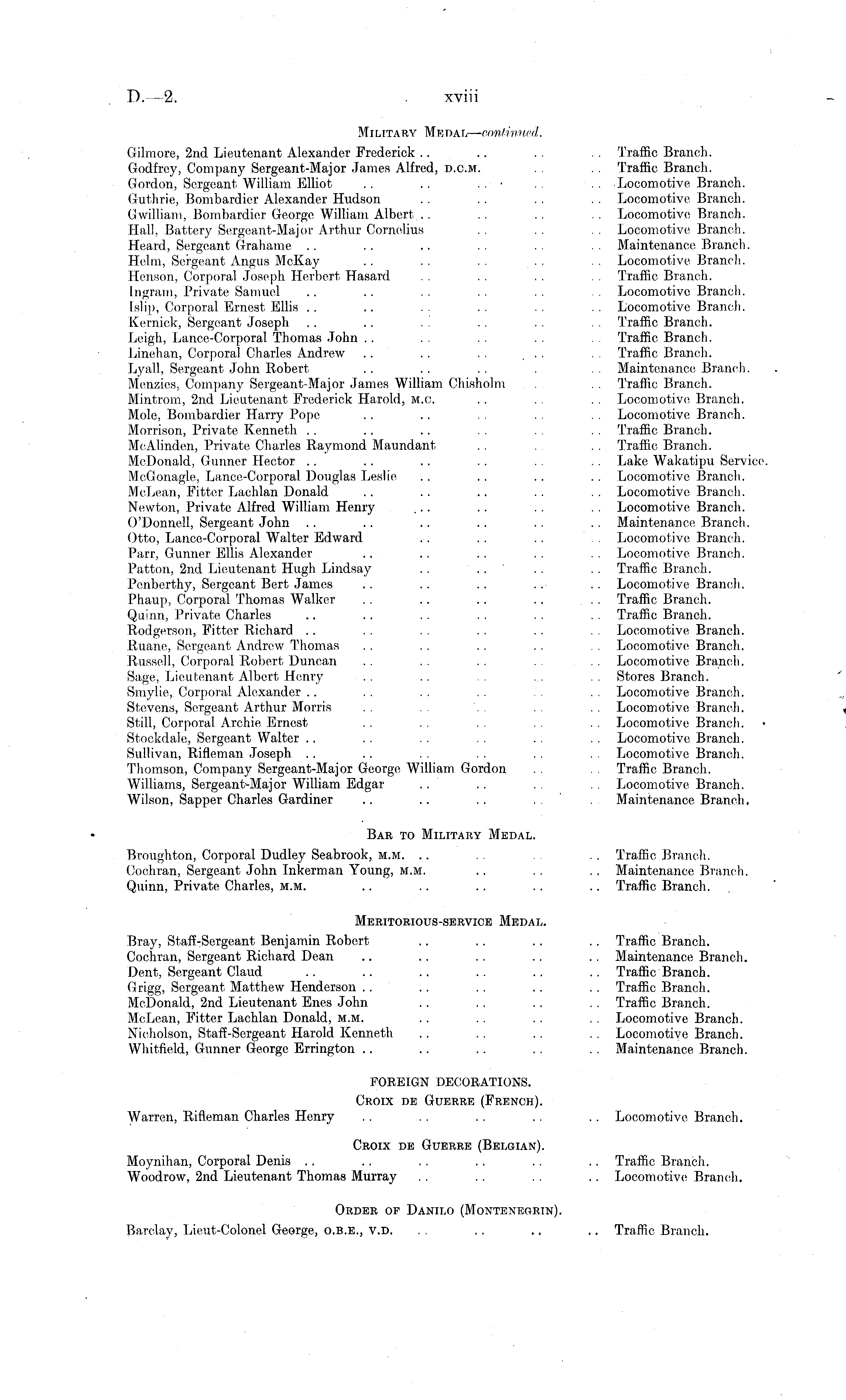 Military Mrdal— continued. Gilmore, 2nd Lieutenant Alexander Frederick .. .. . . . . Traffic Branch. Godfrey, Company Sergeant-Major James Alfred, d.c.m. . . . . Traffic Branch. Gordon, Sergeant William Elliot . . . . . . • . . . . Locomotive Branch. Guthrie, Bombardier Alexander Hudson . . . . . . . . Locomotive Branch. Gwilliam, Bombardier George William Albert . . . . . . Locomotive Branch. Hall, Battery Sergeant-Major Arthur Cornelius . . . . .. Locomotive, Branch. Heard, Sergeant Grabame .. .. .. .. .. .. Maintenance Branch. Helm, Sergeant Angus McKay . . . . . . . . . . Locomotive, Branch. Henson, Corporal, Joseph Herbert Hasard . . . . . . . . Traffic Branch. Ingrain, Private Samuel .. .. . . . . . . . . Locomotive Branch. Islip, Corporal Ernest Ellis .. .. .. .. .. Locomotive Branch. Kernick, Sergeant Joseph . . .. . . . . . . . . Traffic Branch. Leigh, Lance-Corporal Thomas John . . . . . . Traffic Branch. Linehan, Corporal Charles Andrew .. . . . . , . . . . Traffic Branch. Lyall, Sergeant John Robert . . . . . . . . . Maintenance Branch. Menzies, Company Sergeant-Major James William Chisholm ... .. Traffic Branch. Mintrom, 2nd Lieutenant Frederick Harold, M.o. .. . . . . Locomotive; Branch. Mole, Bombardier Harry Pope .. .. .. .. .. Locomotive Branch. Morrison, Private Kenneth .. .. .. .. .. .. Traffic Branch. Mc-Alinden, Private Charles Raymond Maundant . . . . . . Traffic Branch. McDonald, Gunner Hector . . .. .. . . . . . . Lake Wakatipu Service McGonagle, Lance-Corporal Douglas Leslie .. .. .. .. Locomotive Branch. McLean, Fitter Lachlan Donald .. .. .. .. .. Locomotive Branch. Newton, Private Alfred William Henry ... .. .. Locomotive Branch. O'Donnell, Sergeant John .. .. .. .. .. .. Maintenance Branch. Otto, Lance-Corporal Walter Edward . . .. .. Locomotive Branch. Parr, Gunner Ellis Alexander .. .. . . . . . . Locomotive, Branch. Patton, 2nd Lieutenant Hugh Lindsay . . . . . . . . Traffic Branch. Pcnberthy, Sergeant Bert James .. .. .. . .- .. Locomotive Branch. Phaup, Corporal Thomas Walker . . .. .. . . . . Traffic Branch. Quinn, Private Charles .. .. .. .. .. .. Traffic Branch. Rodgerson, Fitter Richard .. . . . . . . . . Locomotive Branch. Ruane, Sergeant Andrew Thomas . . . . . . . . . . Locomotive Branch. Russell, Corporal Robert Duncan . . . . . . . . . . Locomotive Branch. Sage, Lieutenant Albert Henry .. .. ... .. Stores Branch. Smylie, Corporal Alexander .. .. .. .. .. .. Locomotive Branch. Stevens, Sergeant Arthur Morris . . . . . . Locomotive Branch. Still, Corporal Archie, Ernest . . . . . . . . Locomotive Branch. Stockdale, Sergeant Walter .. .. . . . . .. . . Locomotive Branch. Sullivan, Rifleman Joseph .. .. .. .. .. Locomotive Branch. Thomson, Company Sergeant-Major George William Gordon . . Traffic Branch. Williams, Sergeant-Major William Edgar . . . . . . . . Locomotive Branch. Wilson, Sapper Charles Gardiner .. .. .. .. Maintenance Branch. Bar to Military Medal. Broughton, Corporal Dudley Seabrook, m.m. .. . . . . Traffic Branch. Cochran, Sergeant John Inkerman Young, M.M. .. .. .. Maintenance Branch. Quinn, Private Charles, m.m. .. .. .. .. .. Traffic Branch. Meritorious-service Medal. Bray, Staff-Sergeant Benjamin Robert .. . . .. . . Traffic Branch. Cochran, Sergeant Richard. Dean .. . . . . .. .. Maintenance Branch. Dent, Sergeant Claud .. .. .. . . .. . . Traffic Branch. Grigg, Sergeant Matthew Henderson .. .. .. .. .. Traffic Branch. McDonald, 2nd Lieutenant Enes John . . . . .. . . Traffic Branch. McLean, Fitter Lachlan Donald, m.m. . . . . ~ . . Locomotive Branch. Nicholson, Staff-Sergeant Harold Kenneth . . . . . . . . Locomotive Branch. Whitfield, Gunner George Errington .. .. . . .. . . Maintenance Branch. FOREIGN DECORATIONS. Croix de Guerre (French). Warren, Rifleman Charles Henry . . .. .. .. .. Locomotive, Branch. Croix de Guerre (Belgian). Moynihan, Corporal Denis . . .. .. . . . . .. Traffic, Branch. Woodrow, 2nd Lieutenant Thomas Murray .. . . .. .. Locomotive Branch. Order op Danilo (Montenegrin). Barclay, Lieut-Colonel George, 0.b.e., v.d. ~, . ~ .. Traffic Branch,