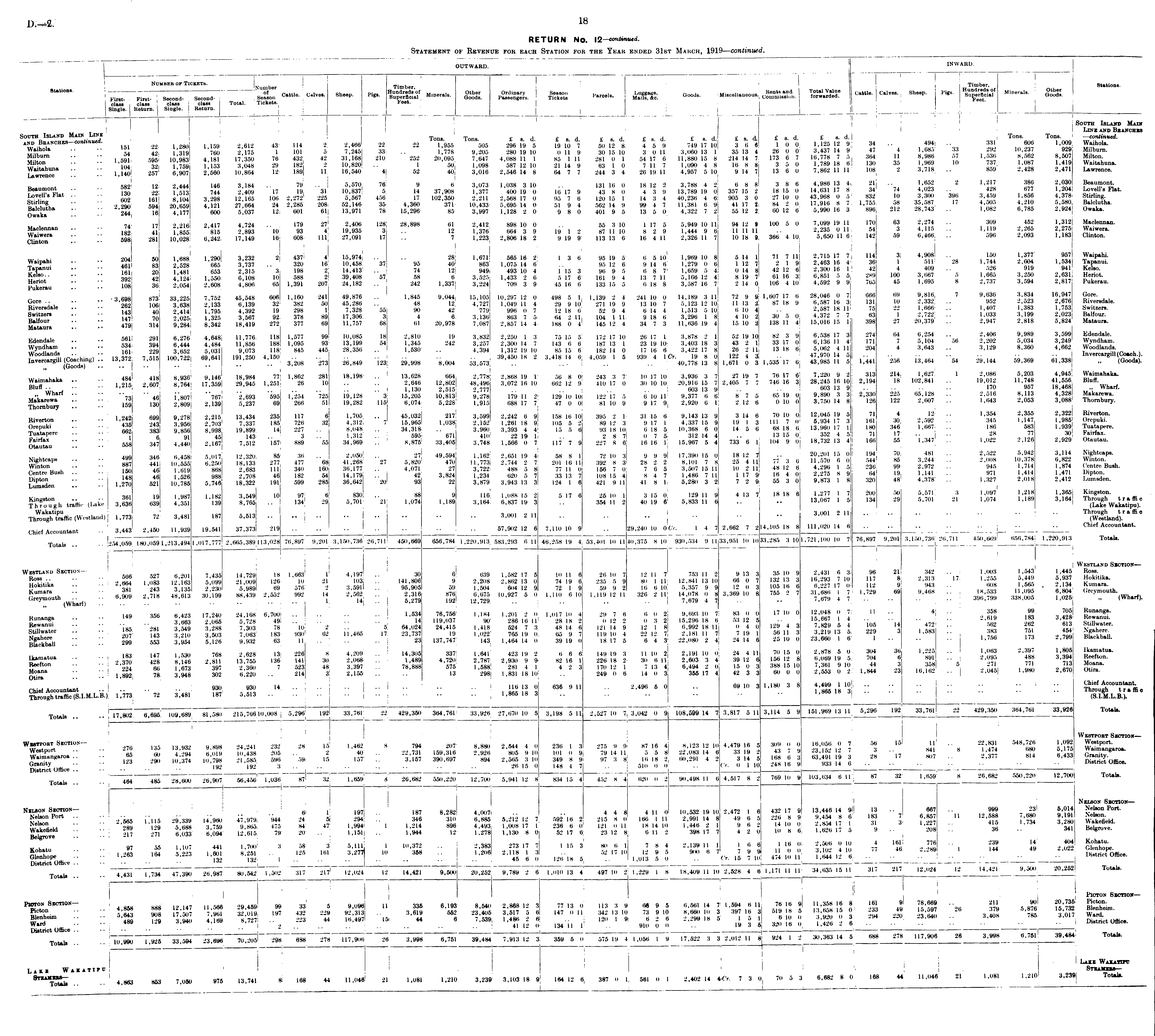 OUTWARD. ' INWARD. ~ ~ ! "* I | | j Number or Tickets. Number Timber ! Timber, Stations, ft* First- Second- Second! 'seaL Cattie. Olves. Sheep. P*.. «• Minerals. «£- -g-g Parce.s. —ft Good, -iscei.aneous. *-"2*, Cattle. CaWes. Sbeep. Other class class class class Total. Tickets. Feet. Single. Return. Single. Return. || South Island Main Line and Branches South Island Main Line ; £sd £ad £ s d £sd £sd £ s d. £ s. d. £ s. d. Tons. Tons. —continued. A Whn.r HE 151 22 1,280 1,159 2,612 43 114 2 2,466 22 22 1,955 505 296 19 5 19 10 7 50 12 8 4 5 9 749 17 l6 3 6 6 1 0 0 1,125 12 9 34 494 331 606 1,009 Waihola. Miwlf " " 54 42 1,319 760 2,175 1 101 5 7,245 33 .. 1,778 9,205 280 19 10 0 11 9 30 15 10 3 0 11 3,060 13 1 35 13 4 26 0 0 3,437 14 9 47 4 1,685 33 292 10,237 929 MiUrarn. Milburn ■■ •• ggg j J() g8;J n <350 432 42 31>168 210 252 2 0,095; 7,647 4,088 11 1 85 111 281 0 1 54 17 6 11,880 15 8 214 14 7 173 6 7 16,778 7 5 364 11 8,986 o7 1,536 8,.>62 8,507 Milton " " ' 104 32| 1,759 1,153 3,048 29 182 2 10,820 .. 1 50 1,098 587 12 10; 21 14 9 63 1 0 7 11 7 1,090 48 16 88 350 1,789 18 6 130 35, 1,969 10 737j 1,087 1,419 Waitahuna. Waitahuna .. • • j | g gQ7 2 g60 i 0> 864 12 189| 11 16,540 4 52 40 3,016 2,546 14 8 64 7 7 244 3 4 26 19 11 4,957 5 10 9 14 7 13 6 0 7,862 11 11 108 2i 3,718 .. 859 2,428 2,471 Lawrence. Lawrence • • • • » . 582 ! 12 2 444 146' 3,184 .. 79 .. 5,570 76 9 6, 3,073 1,038 3 10 .. 131 16 0 ! 18 12 2 3,788 42 688 386 4,986 13 4, 21 .. 1,652 2 1,217 386 2,030 Beaumont. B eau moiit .. • ■ 22 ig 2)409 i 7 19 31 10,837 5 14 37,908 1,377 400 19 0 16 17 9 43 8 0 4 3 9 13,789 19 0 357 15 2 18 15 0 14,631 17 8 34 74 4,023 428 677 1,204 Wells Flat. IxjveU •• •• i6i 8 > 3j2g8 12 165 106 2,272 225 5,567 456 17 102,350! 2,211 2,568 17 0 95 7 6 120 15 1 14 3 4 40,236 4 6 905 3 0 27 10 0 43,968 0 5 832 10 3,300 396 3,459 1,856 4,378 Stirling nM " " 2 290 594 20,659 4,121 27,664 24 2,285! 208 52,146 35 4,360 37lj 10,433 5,695 14 0 51 9 4 562 14 9 99 4 7 11,381 6 9 41 17 2 84 2 0 17,916 8 7 1,755 58 35,587 17 4,50o 4,210 5,580 Balclutha. Owaka " •• ' 244 | 16 4,177 600 5,037 12 601 61 13,971 78 15,296 85 3,997 1,128 2 0 9 8 0 401 9 5 13 5 0 4,322 7 2 55 12 2 60 12 6 5,990 lb 3 896 -1- 28,743 .. 1,082 6,785 2,924 Owaka. . „ 74! 17 2 216 2,417 4,724 .. 179 27 2,406 128 28,898 61 2,412 898 10 0 .. 55 3 10 1 17 5 5,949 10 11 94 12 9 100 5 0 7,099 19 11 170 63 2,274 .. 309 452 1,312 Maclennan. Maclennan .. •• 41 j'ggg 815 2893 10 93 4 19,935 3 12 1,376 664 3 9 19 1 2| 87 11 10 8 2 9 1,444 9 6 11 11 11 .. 2,235 0 11 54 3 4,llo .. 1,119 2,265 2,275 Waiwera. Ctoton™ i. 598 j 281 6,242 17,149 16 608 111 27,091 17 .. 7 1,223 2,806 18 2 9 19 9 113 13 6 16 4 11 2,326 11 7 10 18 9 366 4 10 5,650 11 6 142 59 6,466 .. o96 2,093 1,183 Clinton. . ,. 204 50 1,688 1,290 3,232 2 437 4 15,974 .. .. 28 1,671 565 16 2 1 3 6 95 19 5 6 5 10 1,969 10 8 5 14 1 71 7 11 2,715 17 7 114 3 4,908 .. 150 1,377 957 Waipahi. Waipahi .. •• - gl 83 2 528 665 3,737 .. 320 16 10,458 37 95 40 863 1,075 14 6 95 12 6 9 14 6 1,279 0 6 1 12 7 2 1 9 2,463 16 4 36 1 511 -8 1,744 2,W>4 1,534 Tapanui. Tapanui .. •• 653 2 3 i 5 3 i 98 2 14,413 .. 74 12 949 493 10 4 1 15 3 96 9 5 6 8 7 1,659 5 4 0 14 8 42 12 6 2,300 16 1 42 4 409 .. 0-6 919 941 Kelso £ el ?°: 392 4"> 4 124 1,550| 6,108 10 588 2 39,408 57 58 6 3,525 1,433 2 6 5 17 6 161 9 4 13 7 11 5,166 12 4 8 19 7 61 16 3 6,851 5 5 289 100 3,667 5 l,66o 3,-50 2,631 Henot. Pukerau " .. 108 36 2,054 2,608 4,806 65 1,391 207 24,182 .. 242 1,337 3,224 709 3 9 45 16 6 133 15 5 6 18 8 3,587 16 7 2 14 Oj 106 4 10 4,592 9 9 765 io 1,695 8 2,737 3,o94 2,817 Pukerau. •3 698 873 33,225 7,752! 45,548 606 1,160 241 49,876 .. 1,845 9,044 15,105 10,297 12 0 498 5 1 1,139 2 4 241 10 0 14,189 3 11 72 9 9:1,607 17 6 28,046 0 7 666 69 9,816 7 9,636 3,834 16,947 gore „? re , " " ' 2 62 106 3 638 2,133. 6,139 32 382 50 45,286, .. 48 12 4,727 1,049 11 4 29 9 10 1 271 19 9 13 10 7 5,123 12 10 11 13 2 87 18 9 6,587 16 3 131 10 2,332 .. 952 2,523 2,676 Riversdale. Riversdale .. •• 40 2 ' 414 1>79Q 4>392 19 298 1 7,328 55 90 42 779 996 0 7 12 18 6i 52 9 4 6 14 4 1,513 5 10 6 10 4 2,o87 18 11 75 22 1,666 .. 1,407 1,383 1,753 Switzers. Switzers .. •• 70 .>' 025 1 325 3,567 92 378 89 17,306 3 4 6 3,136 863 7 5 64 2 11 104 1 11 9 18 6 3,296 1 8 4 10 2| 30 5 0 4,372 7 7 63 1 2/722 .. 1,033 3,199 2,023 ® alfour - Balfour .. •• 314 9 284 8>342 18,419 272 377 69 11,757 68 61 20,978 7,087 2,857 14 4 188 0 4! 145 12 4 34 7 3 11,636 19 4 15 10 2 138 11 4 15,016 15 1 398 27 20,379 .. 2,94 / 2,818 5,824 Mataura. Mataura • • • • | , , 561 291 6,276 4,648 11,776 118 1,577 99 10,085 18 2,810 19 3,832 2,250 1 3 75 15 5! 172 17 10 26 17 1 3,878 2 1 52 19 101 82 3 9 6,538 17 3 274 64 6,254 .. 2,406 9,989 3,599 Edendale. Wyndham " " 534 394 6,444 4,484 11,856 188 1,095 M 13,199 54 1,345 242 3,257 2,300 14 187 13 1 23 19 10 3,403 18 3 43 2 J 33 17 0 4 n , Q4 4 29 4,662 WooVnds ».m ».«• «»:» «.«> ■«.«• 4 :! w »;»» » a*. « »,m \m a.™ iar -«.£A SJS i lx.m» < S5IIS » ».«. « »..« tt (C*ooas; ...... ,,, . .. 484 418 8 936 9,146 18,984 77 1,862 281 18,198 .. 13,628 664 2,778 2,868 19 1 56 8 0 243 3 7 10 17 10 3,936 3 7 27 19 7 76 17 6 J.220 9 2 313 214 1,627 1 2,086 Waimahaka. Waimahaka .. •• g 17,359 29,945 1,251 26 10 .. .. 2,640 12,802 48,496 3,072 16 10 662 12 9 410 17 (I 30 10 101 20,916 15 7 2,405 7 7 746 16 3 28,245 16 10 2,194 18 102,841 .. at? ts'ffis w . , Blutt ..••••> > ' _ 1,130 2,515 2 777 603 13 9 .. •• 603 13 " •• •• 9£ " is,400 ,, wnart. wharf •• " "'-3 46 i" 807 " 767 '2,693 595 1,254 725 19,128 3 179 11 2 129 10 10 122 i7 5 6 10 11 9,377 6 6 8 7 5 65 19 0 9,890 3 3 2,330 225 •• 2,516 8,113 4,328 Makarewa. ' - 159 13*> 2,139 5,237 69 266 51 19,282 115 6,074 5,228 1,915 688 17 7 47 0 0 81 10 9 9 17 9 2,920 6 1 2 12 6 0 10 0 3,750 14 8 126 122 2,60/ .. 1,643 2,053