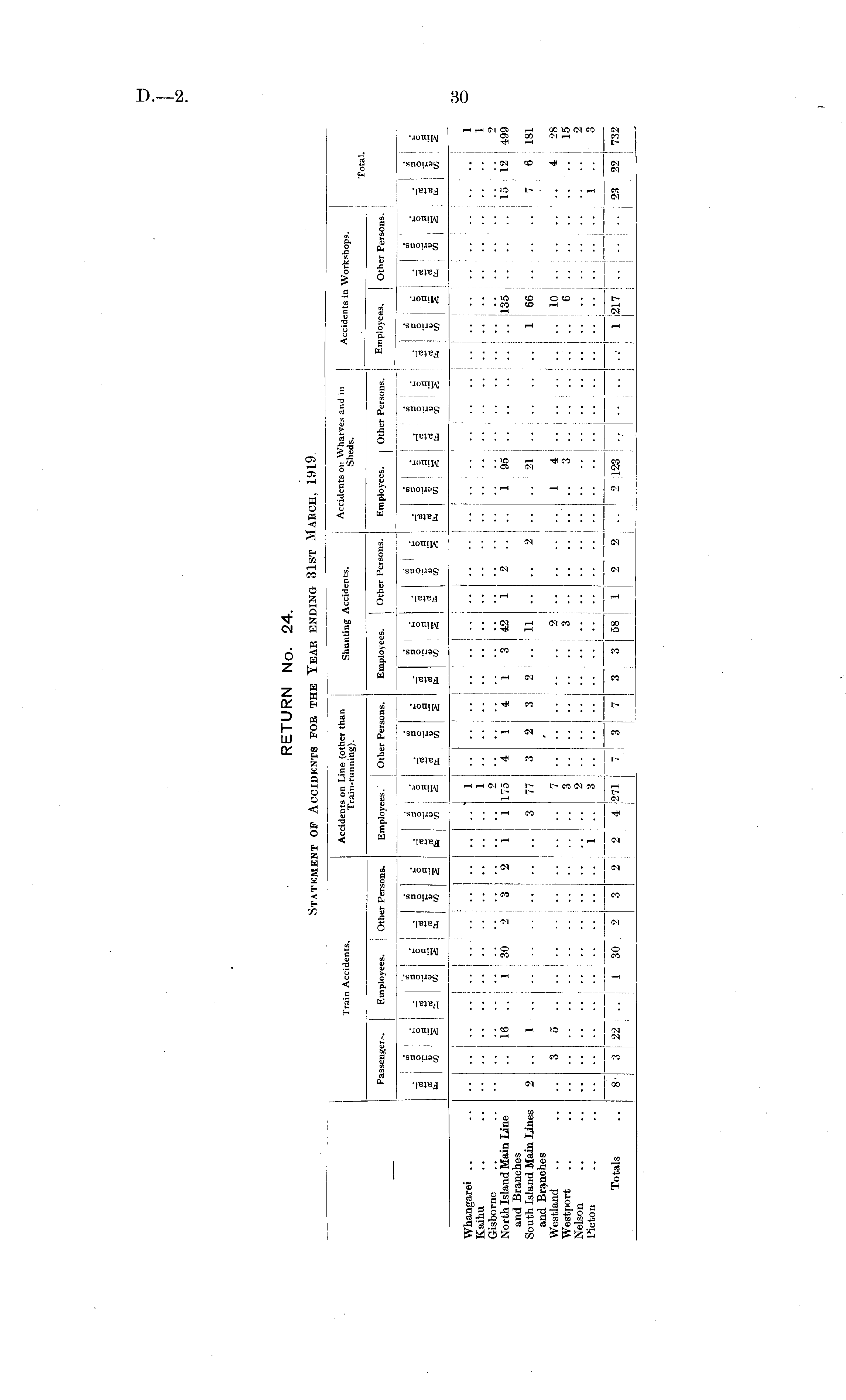 Train Accidents. Accidents on Line (other than Train-running). Shunting Accidents. Accidents on Wharves and in Sheds. Accidents in Workshops. Passenger-. Employees. Other Persons. Employees. Other Persons. Employees. j Other Persons. Employees. Other Persons. Total. Employees. Other Persons. 3 b .2 § 3 .2 (fi 2 to OT c o o S to CO § 73 o I o fe OT : 2 5 •c a <n i ft! IS. OT I S . to OT S U, OT S to W | S to : OT £ to OT.S Whangarei Kaihu Gisborne North Island Main Line and Branches South Island Main Lines and Branches Westland Westport Nelson Picton '.'. its '.'. i 1 .. .. 3 5 .. .. 30 2 3 2 •• 1 •• i 1 .. 1 2 .. 175 4 4 i 4 i 3 42 i 2 3 2 .. 11 .. .' 2 .. 3 .. 2 .. .. 2 .. i .I | .. j ] ! .. 1 .. . ] .. 1 1 95 .. .'.' !! '.'. .. 135 15 j 12 499 .. j 21 .. .. I .. .. 1 66 7 6 181 1 4 10 4 28 3 .. .... .. .. 6 15 j 2 2 123 .- 1 217 .. ! .. .. 23 22 732 3 77 3 3 •• 3 7 3 .. 2 .. 3 .. •• •• I ••. •• .. •■ .. .. I "1 .. .. .. | .. I ■- .. .. .. -- "i 3 7 3 3 58 1 ■■ .. .. .. .. .. .. .. i :: :: :: :: .. .. •• Totals 8 3 3 22 : .. 1 .. 30 2 3 2 2 4 271 7 2 2 ..