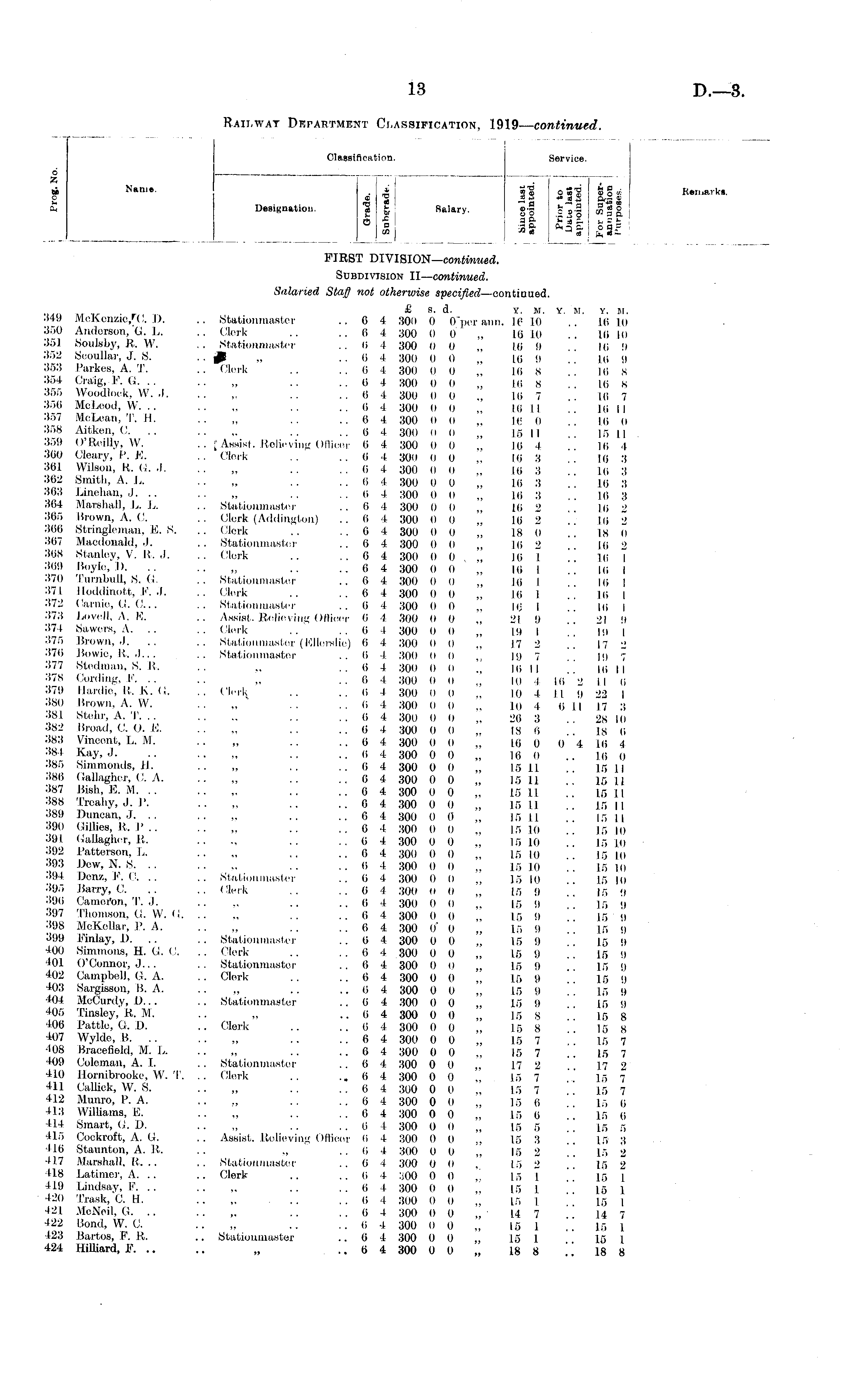 Classification. Service. X ,j Name. o fi ft 6 A. A o ■~ ft A »"B *H»FcJ»Hfl. ■ fth I 2 9 O I 9 o a, I CP 'B I H. HHF ® ft"~ 9 Designation. | £, Ralary. g-g l~ -g j ig f g_ , a Bftft-^ft:oaB co J2 t w 3j j £ gft Ren.fl.rka. FIRST DIVISION— continued. Subdivision II— continued. 349 MoKenzie.fC. D. 350 Anderson, G. L. 351 Soulsby, R. \V. 352 Sooullar, J. S. 353 Parkes, A. T. 354 Craig, F. G. 355 Woodlook, W. ,1. 356 MoLeod, W. .. 357 McLean, T. II. 358 Aitken, C. .. 359 O'Reilly, W. 300 Cleary,' I'. I-:. 361 Wilson, R. G. .1. 362 Smith, A. L. 363 Linehan, J. 364 Marshall, L. L. 365 lir-own, A. C. 360 Stringleman, E. S. 307 Macdonald, .1. 3os Stanley, V. R. .1. .369 Boyle, D. 370 Tur-ribull, S. G. 371 Hoddinott, F, ./. 372 Cai-nic, (i. (,'... 373 Lovell, A. E. 374 Sawors, A. 375 Brown, J. 376 Howie, II. .1... •377 Stedman, S. II. .378 Cording, F, .. 379 Hardie, II. K. G. 380 lir-own, A. W. 381 Stehr, A. T. . . 382 Broad, 0. O. E. 383 Vincent, L. M. 384 Kay, J. 385 Simmonds, U. •386 Gallagher, C. A. 387 Bish, E. M. .. 388 Trcahy, J. P. 389 Duncan, ,1. .. 390 Gillies, R. I' .. 391 GaUagher, R. 392 Patterson. I,. 393 Dow, N. S. 394 Denz, F. 0. .. 395 Barry, C. 39<i Camei'on, T. ,1. 397 Thomson, G. W. (I. 398 MoKellar, I'. A. 399 Finlay, D. .. 400 Simmons, H. G. C. 401 O'Connor, J... 402 Campbell, G. A. 403 Sargisson, B. A. 404 McCurdy, D... 405 Tinslcy,' R. M. 406 Battle, G. D. 407 Wylde, B. .. 408 Bracefield, M. L 409 Coleman, A. I. 410 Uornibrooke, W. T. 411 Oaliick, W. S. 412 Munro, P. A. 113 Williams, E. 414 Smart, G. D. 415 Cockroft, A. G. 116 Staunton, A. R. 417 Marshall, R. .. 418 Latimer, A. .. 419 Lindsay, F, . . 120 Trask, C. H. 121 McNeil, ({. .. -122 Bond, W. C. 423 Bartos, F. R. 424 Hilliard, F. .. Salaried Staff not otherwise specified —continued. £ s. d. Y. M. Y. HI. Y. 111. .. Stationmaster .. 6 4 300 0 O'per aim. 10 10 .. 16 lo • ■ Clork .. ..64 300 0 0 „ Hi III . . Hi |u .. Stationmaster 6 4 300 o 0 „ Hi 9 io 9 •• 0 „ ..64 300 0 0 „ 10 9 111 9 ■• Clerk .. ..0 4 300 0 0 „ 10 8 .. Hi s ..6 4 300 0 0 „ l(i 8 .. |(i g .. 6 4 300 0 0 „ 10 7 .. 16 7 .. 6 4 300 0 0 „ 16 I I . . Hi I I .. 6 4 300 O 0 „ |{i (i Hi ii ■ •6 4 300 0 0 „ 15 II . . 15 11 .. {Assist. Relieving Offl ■ 6 4 300 0 0 „ 16 4 .. Hi l •• Clerk .. ..6 4 300 0 0 ,. Hi 3 .. Hi 3 .. 6 4 300 0 0 „ Hi 3 .. Ill 3 6 4 300 0 0 „ Hi 3 .. 16 3 -.6 4 300 0 0 „ Hi 3 .. Hi 3 .. Stationmaster- .. 6 4 300 0 0 „ 16 2 .. 16 2 .. Clerk (Addington) .. 6 4 300 o o „ Hi 2 .. n; 2 •• 'lerk '.. ..64 300 0 0 „ 18 (I .'. Is 0 .. Stationmaster .. 6 4 300 o o „ Hi 2 .. Hi 2 Clerk .. ..6 4 300 0 0 „ Hi I , [ n; | ..0 4 300 0 0 „ Hi | .. |i; | .. Stationmaster .. 6 4 300 o o ,, hi l .. hi l Clerk .. ..6 4 300 o o „ Hi 1 .. it; | .. Stationmaster .. 6 1 300 o o „ n; | .. lo I .. Assist. Relieving Offioer 6 4 300 0 0 „ 21 9 .. 21 9 Clerk .. ..6 1 300 0 0 „ |<) 1 ., |<i i .. Stationmaster (Ellerslioj 6 4 300 o o „ 17 2 .. 17 2 .. Stationmaster .. 0 1 300 0 o ,, 19 7 .. 19 7 .. 6 4 30" n 11 „ 16 H .. Hi 11 ..6 4 300 0 0 „ 10 1 Hi 2 II (i ■■ Clerk .. . . 0 4 300 0 0 ., HI 1 II 9 22 I ..61 300 0 (I ,. Ii) 4 <i I I 17 :; -.04 300 0 0 ,. 26 3 .. 28 III ..6 4 300 0 0 ,. IS 0 .. is 0 ..6 4 300 0 (I „ 16 0 0 4 Hi I .. 6 4 300 0 0 „ Hi II .. Hi 0 .. 6 4 300 0 0 „ 15 II .. 16 II .. 0 4 300 0 0 „ 15 11 .. 15 II .. 0 4 300 0 0 „ 15 11 .. 15 11 .. 0 4 300 0 0 „ 15 11 .. 15 II ..6 4 300 0 0 „ 15 II .. 15 II .. 6 4 300 (I 0 „ 15 10 .. 15 10 ■ . 6 4 300 0 0 15 10 .. 15 HI ..6 4 300 0 0 „ 15 II) .. ig hi ..6 4 300 0 0 „ 1,5 10 .. 15 10 .. Stationmaster .. 0 4 300 0 0 „ l;> 10 .. 15 |u ■ • Clerk .. ..6 4 300 0 0 „ 15 9 .. 15 9 .. 6 4 300 0 0 „ 15 9 .. 15 9 .. 6 4 300 0 0 „ 15 9 .. 15 9 .. 6 4 300 0" 0 „ 15 9 .. 15 9 .. Stationmaster .. 6 4 300 0 0 „ 15 9 .. 15 9 ■ • Clerk .. ..6 4 300 0 0 „ 15 9 .. 15 9 Stationmaster- .. 6 4 300 0 11 „ 15 9 .. 15 n ■• Clerk .. .. 6 4 300 0 0 „ 15 9 .[ 15 9 -.0 4 300 0 0 „ 15 9 .. 15 9 .. Stationmaster .. 6 4 300 0 0 „ 15 9 15 9 .. 0 4 300 0 0 „ 15 S .. 18 8 • • Clerk .. ..04 300 00 „ 158 .. 158 ..6 4 300 0 0 „ 15 7 .. 15 7 ..6 4 300 0 0 „ 15 7 .. 15 7 Stationmaster .. 6 4 300 0 0 „ 17 2 17 2 •■ Clerk .. ..0 4 300 0 0 „ 15 7 .'.' 15 7 .. 6 4 800.0 0 „ 15 7 .. 15 7 .. 6 4 300 0 0 „ 15 6 .. 15 0 .. 6 4 300 0 0 „ 15 6 .. 15 6 -.6 4 300 0 0 „ 15 5 .. 15 5 .. Assist. Relieving Officer (i 4 300 0 0 ,, 15 3 .. 15 :{ ..64 300 00 „ 15 2 .. 16 2 .. Stationmaster 6 4 300 0 0 , 15 2 .. 15 2 • • Clerk .. ..64 :>00 0 0 ,'. 15 I [[ If, | ..6 I 300 0 0 „ 15 I .. ie 1 ■ •6 I 300 0 0 „ Ifi 1 ,, i.-, 1 ..64 300 0 0 „ ■ 14 7 II 7 . . 6 4 300 0 0 „ 15 1 .. 15 1 .. Stationmaster .. 6 4 300 0 0 „ 15 1 . 15 1 .. 6 4 300 0 0 „ 18 8 !! 18 8