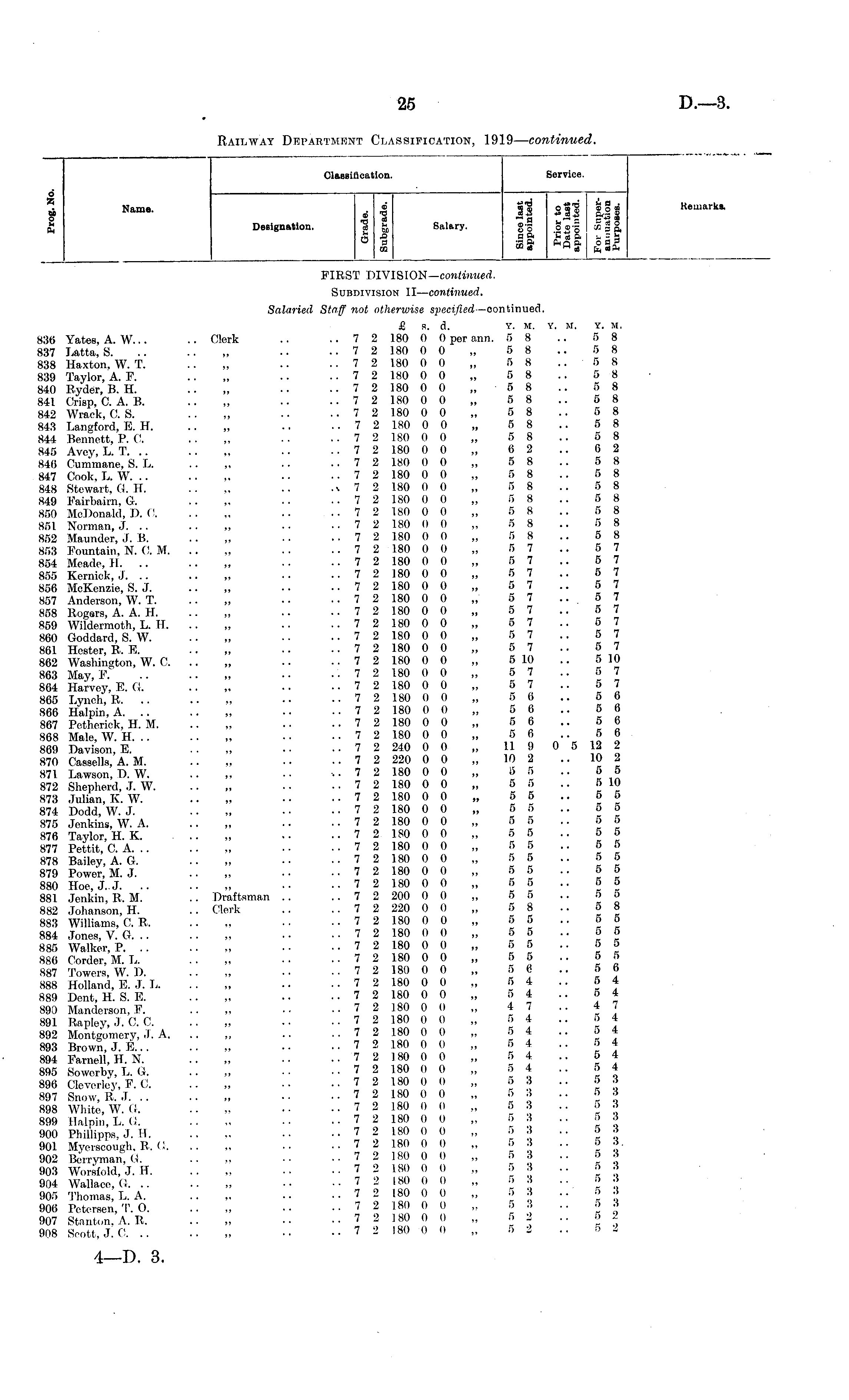 Classification. Service. d A A o u ft Name. 9 •a ? ; 5 CD a u -a 3 00 || s%t Ui flft iHojft u z J; Id Ot ft Q ft o a s 02 a i-i as ft cdft He marks. Designation. Salary. FIRS' IT DIVISION— continued. SUB! (division II — continued. Salaried Staff r not otherwise specified —oontinued. 836 Yates, A. W... 837 Latta, S. 838 Haxton. W. T. 839 Taylor, A. F. 840 Ryder, B. H. 841. Crisp, C. A. B. 842 Wrack, C. S. 843 Langford, E. H. 844 Bennett, P. C. 845 Avey, L. T. 846 Cummane, S. L. 847 Cook, L. W. .. 848 Stewart, G. H. 849 Fairbairn, G. 850 McDonald, D. 0, 851 Norman, J. .. 852 Maunder, J. B. 853 Fountain, N. C. M. 854 Meade, 11. .. 855 Kernick, J. .. 856 McKeii7.ie, S. J. 857 Anderson, W. T. 858 Rogers, A. A. H. 859 Wildermoth, L. H. 860 Goddard, S. W. 861 Hester, R. E. 862 Washington, W. C. 863 May, F. 864 Harvey. E. G. 865 Lynch, R. .. S66 Halpin, A. .. 867 Petherick, H. M. 868 Male, W. H. .. 869 Davison, E. 870 Cassells, A. M. 871 Lawson, D. W. 872 Shepherd, J. W. 873 Julian, K. W. 874 Dodd, W. J. 875 Jenkins, W. A. 876 Taylor, H. K. 877 Pettit, C. A. .. 878 Bailey, A. G. 879 Power, M. J. 880 Hoe, J.. J. .. 881 .Jenkin, R. M. 882 Johanson, H. 883 Williams, C. R. 884 Jones, V. G. .. 885 Walker, P. .. 886 Corder, M. L. 887 Towers, W. D. 888 Holland, E. J. L. 889 Dent, H. S. E. 890 Manderson, F. 891 Rapley, J. C. C. 892 Montgomery, .1. A. 893 Brown, J. E... 894 Farnell, H. N. 895 Sowerby, L. G. 896 Cleverley, F. C. 897 Snow, R. J. .. 898 White, W. G. 899 Halpin, L. G. 900 Phillipps, J. H. 901 Myerscough, R. G. 902 Berryman, G. 903 Worsfold, J. H. 904 Wallace, G. .. 905 'Thomas, L. A. 906 Petersen, T. O. 907 Stanton. A. R. 908 Scott, J. C. .. Clerk .. .. ; ,, . • ,, • * >* * * Draftsman Clerk i £ s. d. Y. M. v. M. Y. M. 7 2 180 0 0 por ann. 5 8 .. B 8 7 2 180 0 0 „ 5 8 .. 5 8 7 2 180 0 0 „ 5 8 .. ■ 5 8 7 2 180 0 0 „ 5 8 .. 5 8 7 2 180 0 0 „ 5 8 .. 5 8 7 2 180 0 0 „ 5 8 .. 5 8 7 2 180 0 0 „ 5 8 .. 5 8 7 2 180 0 0 „ 5 8 .. 5 8 7 2 180 0 0 „ 5 8 .. 5 8 7 2 180 0 0 „ 6 2 .. 6 2 7 2 180 0 0 „ 5 8 .. 5 8 U 180 0 0 „ 5 8 .. 5 8 7 2 180 0 0 „ 5 8 .. 5 8 7 2 180 0 0 „ 5 8 .. 5 8 7 2 180 0 0 „ 5 8 .. 5 8 7 2 180 0 0 „ 5 8 .. 5 8 7 2 180 0 0 „ 5 8 .. 5 8 7 2 180 0 0 „ 5 7 .. 5 7 7 2 180 0 0 „ 5 7 .. 5 7 7 2 180 0 0 „ 5 7 .. 5 7 7 2 180 0 0 „ 5 7 .. 5 7 7 2 180 0 0 „ 5 7 .. 5 7 7 2 180 0 0 „ 5 7 .. 5 7 7 2 180 0 0 „ 5 7 .. 5 7 7 2 180 0 0 „ 5 7 .. 5 7 7 2 180 0 0 „ 5 7 .. 5 7 7 2 180 0 0 „ 5 10 .. 5 10 7 2 180 0 0 „ 5 7 .. 5 7 7 2 180 0 0 „ 5 7 .. 5 7 7 2 180 0 0 „ 5 6 .. 5 6 7 2 180 0 0 „ 5 6 .. 5 6 7 2 180 0 0 „ 5 6 .. 5 6 7 2 180 0 0 „ 5 6 .. 5 6. 7 2 240 0 0 „ 11 9 0 5 12 2 7 2 220 0 0 „ 10 2 .. 10 2 7 2 180 0 0 „ 15 5 .. 5 5 7 2 180 0 0 „ 5 5 .. 5 10 7 2 180 0 0 „ 5 5 .. 5 5 7 2 180 0 0 „ 5 5 .. 5 5 7 2 180 0 0 „ 5 5 .. 5 5 7 2 180 0 0 „ 5 5 .. 5 5 7 2 1.80 0 0 „ 5 5 .. 5 5 7 2 180 0 0 „ 5 5 .. 5 5 7 2 180 0 0 „ 5 5 .. 5 5 7 2 180 0 0 „ 5 5 .. 5 5 7 2 200 0 0 „ 5 5 .. 5 5 7 2 220 0 0 „ 5 8 .. 5 8 7 2 180 0 0 „ 5 5 .. 5 5 7 2 180 0 0 „ 5 5 .. 5 5 7 2 180 0 0 „ 5 5 .. 5 5 7 2 180 0 0 „ 5 5 .. 5 5 7 2 180 0 0 „ 5 (i .. 5 6 7 2 180 0 0 „ 5 4 .. 5 4 7 2 180 0 0 „ 5 4 .. 5 4 7 2 180 0 0 „ 4 7 .. 4 7 7 2 180 0 0 „ 5 4 .. 5 4 7 2 180 0 0 „ 5 4 .. 5 4 7 2 180 0 0 „ 5 4 .. 5 4 7 2 180 0 0 „ 5 4 .. 5 4 7 2 180 0 0 „ 5 4 .. 5 4 7 2 180 0 0 „ 5 3 .. 5 3 7 2 180 0 0 „ 5 3 .. 5 3 7 2 180 0 0 „ 5 3 .. 5 3 7 2 180 0 0 „ 5 3 .. 5 3 7 2 180 0 0 „ 5 3 .. 5 3 7 2 180 0 0 „ 5 3 .. 5 3. 7 2 180 0 0 „ 5 3 .. 5 3 7 2 180 0 0 „ 5 3 .. 5 3 7 2 180 0 0 „ 5 3 .. 5 3 7 2 180 0 0 „ 5 3 ..' 5 3 7 2 180 0 0 „ 5 8 .. 5 3 7 2 180 0 0 „ 5 2 .. 5 2 7 2 180 0 0 „ 5 2 .. 5 2
