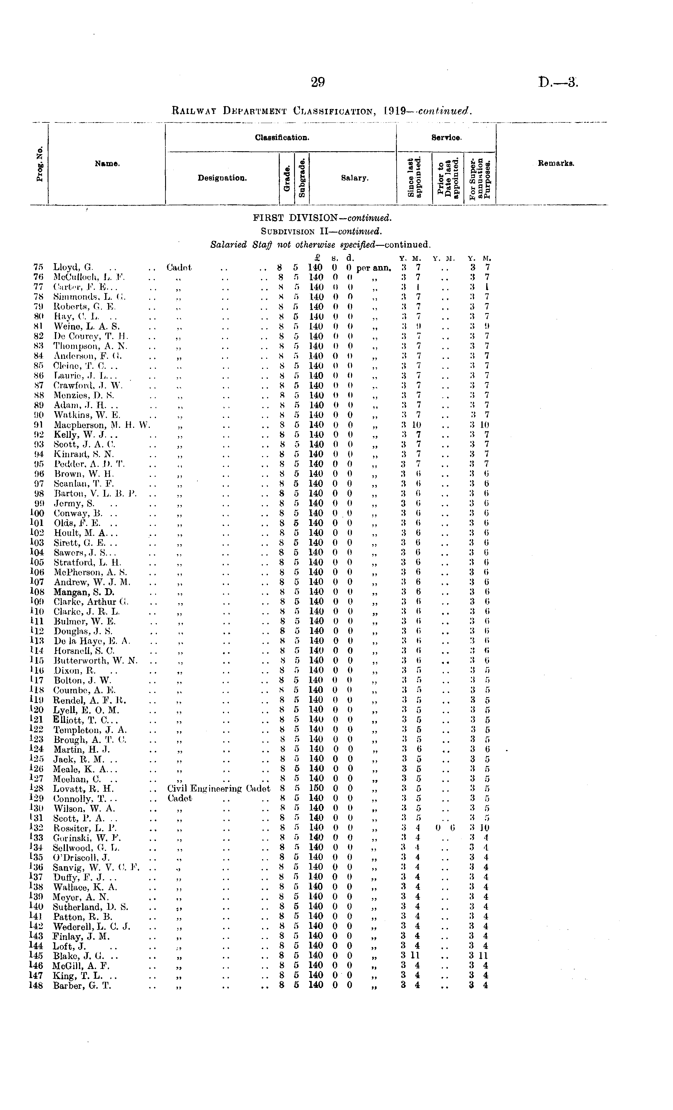 Classification. Service. X oi Name. o fi 6 A A o M ft Name. OJ m'S -WO ill " • i £° £ sl lii Designation. « & Salary. g g S«-g =|° fi -2 aft'S-Sfti-fli! 3 a & ftoft OBB CO 02 ce H w oft : Kemarks Kemarks. B. Designation. / FIRST DIVISION-continued. Subdivision II— continued. 75 Lloyd, G. 76 McCuIloch, L. F. 77 Carter, F. E... 78 Simmonds, L. G. 79 Roberts, G. E. 80 Hay, C. L. .. 81 Weine, L. A. S. 82 De Courcy, T. H. 83 Thompson, A. N, 84 Anderson, F. (!. 85 Cleino, T. C. .. 86 Laurie, J. L. 87 Crawford, J. W. 88 Menzios, D. S. 89 Adam, J. H. .. 90 Watkins, W. E. 91 Macpherson, M. H. W. 92 Kelly, W. J. .. 93 Scott, J. A. C. 94 Kinraid, S. N. 95 Pcddor, A. I). T. 96 Brown, W. H. 97 Scanlan, T. F. 98 Barton, V. L. B. P. .. 99 Jermy, S. 100 Conway, B. .. 101 Olds, F. E. .. 102 Hoult, M. A... 103 Sirett, G. E. .. 104 Sawors, J. S... 105 Stratford, L. H. 106 McPhorson, A. S. 107 Andrew, W. J. M. 108 Mangan, S. D. 109 Clarke, Arthur G. 110 Clarke, J. R. L. 111 Buhner, W. E. 112 Douglas, J. S. 113 De la Hayc, E. A. 114 Horsnell, S. C. 115 Butterworth, W. N. .. 116 Dixon,R. .. 117 Bolton, J. W. 118 Coumbo, A. E. 119 Rendel, A. F. R. 120 Lyell, E. O. M. 121 Elliott, T. C... 122 Tonrploton, J. A. 128 Brough, A. T. O. 124 Martin, H. J. 125 Jack, R. M. .. 126 Meale, K. A... 127 Meehan, C. .. 128 Lovatt, R. H. 129 Connolly, T. .. 130 Wilson, W. A. 131 Scott, P. A. .. 132 Rossitor, L. P. 133 Gorinski, W. F. 134 Sellwood, G. L. 135 O'Driscoll, J. '36 Sanvig, W. V. C, F. .. 137 Duffy, F. J. .. 138 Wallace, K. A. 139 Meyor, A. N. 140 Sutherland, D. S. 141 Patton, R. B. 142 Wedoroll, L. 0. J. 143 Finlay, J. M. U4 Loft, J. 145 Blake, J. G. .. 146 McGill, A. F. 147 King, T. L. .. 148 Barber, G. T. Salaried Staff not otherwise specified —continued. £ S. d. Y. M. Y. M. Y. M. Cadot .. .. 8 5 140 0 0 per ann. 3 7 .. 3 7 ..85 140 0 0 „ 37 .. 37 ..8 5 140 0 0 „ 3 1 .. 3 1 . . S 5 140 0 0 „ 3 7 .. 3 7 . . 8 5 140 0 0 „ 3 7 . . 3 7 . . S 5 140 0 0 „ 3 7 .. 3 7 ..8 5 140 0 0 „ 3 9 .. 3 9 .. 8 5 140 0 0 „ 3 7 .. 3 7 ..85 140 0 0 „ 37 . . 37 .. S 5 140 0 0 „ 3 7 .. 3 7 .. 8 5 140 0 0 „ 3 7 .. 3 7 ..85 140 0 0 „ 37 .. 37 .. 8 5 140 0 0 „ 3 7 .. 3 7 ..85 140 (I 0 „ 37 . . 37 ..85 140 0 0 „ 37 .. 3 7 ..8 5 140 0 0 „ 3 7 .. 3 7 ..8 5 140 0 0 „ 3 10 .. 3 10 .. 8 5 140 0 0 „ 3 7 .. 3 7 ..8 5 140 0 0 „ 3 7 .. 3 7 ..8 5 140 0 (I „ 3 7 .. 3 7 ..8 5 140 0 0 „ 3 7 .. 3 7 . . 8 5 140 0 0 „ 3 6 .. 3 6 „ ' .. .. 8 5 140 0 0 „ 3 6 .. 3 6 .. 8 5 140 0 0 „ 3 6 .. 3 6 ..85 140 00 „ 3 Ii .. 3 6 ..8 5 140 0 0 „ 3 6 .. 3 6 .. 8 5 140 0 0 „ 3 6 .. 3 6 .. 8 5 140 0 0 „ 3 0 .. 3 6 .. 8 5 140 0 0 „ 3 6 .. 3 0 .. 8 5 140 0 0 „ 3 6 .. 3 6 .. 8 5 140 0 0 „ 3 6 .. 3 6 .. 8 5 140 0 0 „ 3 6 .. 3 0 .. 8 5 140 0 0 „ 3 6 .. 3 6 .. 8 5 140 0 0 „ 3 6 .. 3 6 .. 8 5 140 0 0 „ 3 6 .. 3 6 . . 8 5 140 0 0 „ 3 6 .. 3 6 .. 8 5 140 0 0 „ 3 6 .. 3 6 .. 8 5 140 0 0 „ 3 6 .. 3 6 ..85 140 0 0 „ 3 6 .. 36 ..85 140 00 „ 36 .. 3 6 .. 8 5 140 0 0 „ 3 6 .. 3 6 ..85 140 0 0 „ 3 5 .. 3 5 ..8 5 140 0 0 „ 3 5 .. 3 5 .. S 5 140 0 0 „ 3 5 .. 3 5 .. 8 5 140 0 0 „ 3 5 .. 3 5 .. 8 5 140 0 0 „ 3 5 .. 3 5 .. 8 5 140 0 0 „ 3 5 .. 3 5 .. 8 5 140 0 0 „ 3 5 .. 3 5 .. 8 5 140 0 0 „ 3 5 .. 3 5 .. 8 5 140 0 0 „ 3 6 .. 3 6 .. 8 5 140 0 0 ,, 3 5 .. 3 5 .. 8 5 140 0 0 „ 3 5 .. 3 5 .. 8 5 140 0 0 „ 3 5 .. 3 5 Civil Engineering Cadet 8 5 150 0 0 „ 3 5 .. 3 5 Cadot .. .. 8 5 140 0 0 „ 3 5 .. 3 5 ..8 5 140 0 0 „ 3 5 .. 3 5 ..8 5 140 0 0 „ 3 5 .. 3 5 ..8 5 140 0 0 „ 3 4 0 6 3 10 .. 8 5 140 0 0 „ 3 4 .. 3 4 .. 8 5 140 0 0 „ 3 4 .. 3 4 .. 8 5 140 0 0 „ 3 4 .. 3 4 „ .. .. 8 5 140 0 0 „ 3 4 .. 3 4 ..8 5 140 0 0 „ 3 4 .. 3 4 .. 8 5 140 0 0 „ 3 4 .. 3 4 .. 8 5 140 0 0 „ 3 4 .. 3 4 „ .. .. 8 5 140 0 0 „ 3 4 .. 3 4 .. 8 5 140 0 0 „ 3 4 .. 3 4 .. 8 5 140 0 0 „ 3 4 .. 3 4 .. 8 5 140 0 0 „ 3 4 .. 3 4 .. 8 5 140 0 0 „ 3 4 .. 3 4 .. 8 5 140 0 0 „ 8 11 .. 3 11 „ .. .. 8 5 140 0 0 „ 3 4 .. 3 4 .. 8 5 140 0 0 „ 3 4 .. 3 4 .. 8 5 140 0 0 „ 3 4 .. 3 4