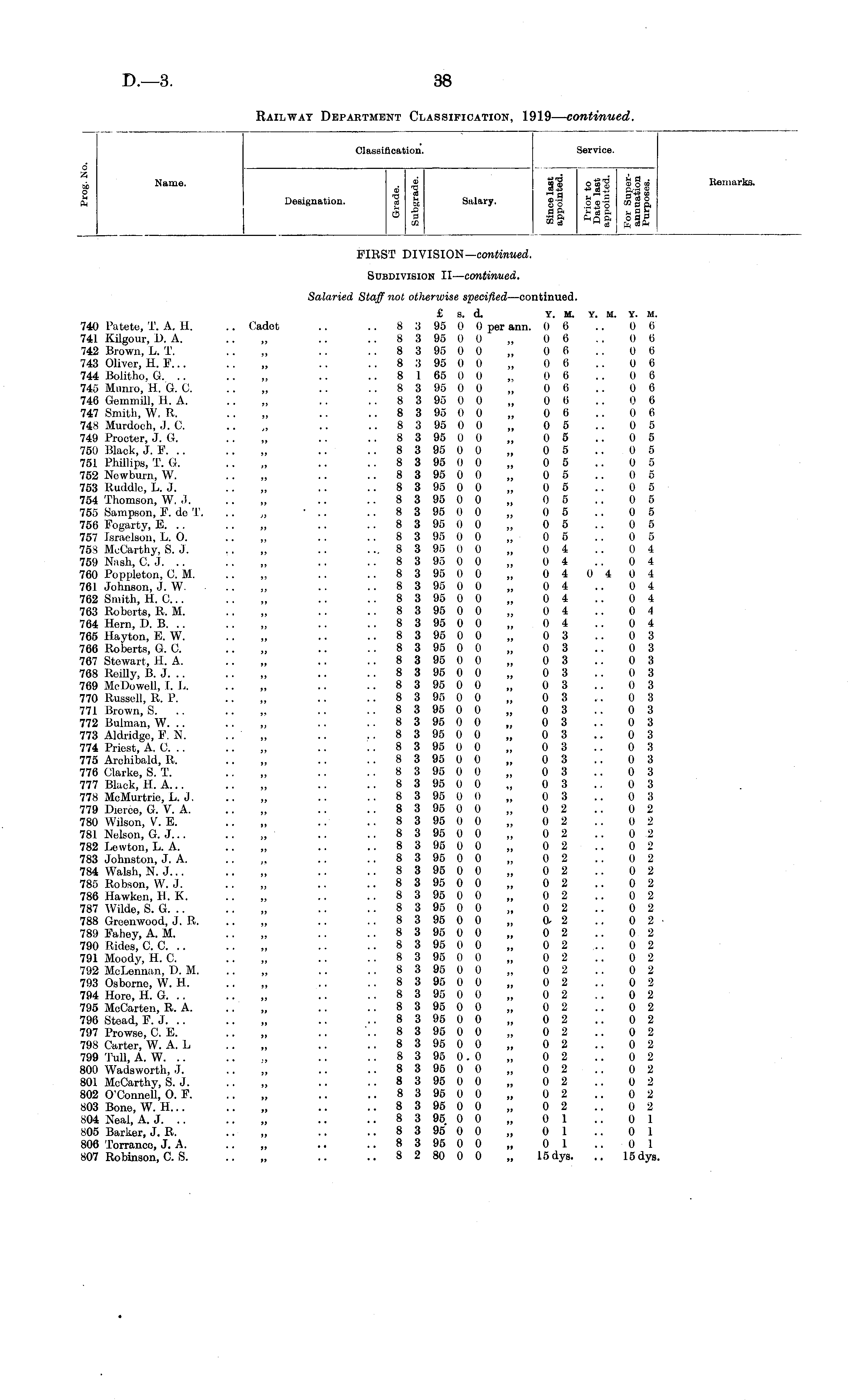 Classification. Service. d o £ Name. a C DC £ Salary. II sit !j§ g| S«| cof| ag, > « a h"S Item arks. Designation. FIRST DIVISION— continued. Subdivision II— continued. Salaried Staff not otherwise specified —continued. 740 I'ateto, T. A. H. 741 Kilgour, D. A. 742 Brown, L. T. 743 Oliver, H. F... 744 Bolitho, G. .. 745 Monro, H. G. C. 746 Gommill, H. A. 747 Smith, W. R. 748 Murdoch, J. 0. 749 Procter, J. G. 750 Black, J. F. 751 Phillips, T. G. 752 Now burn, W. 753 Huddle, L. J. 754 Thomson, W. J. 755 Sampson, F. do T. 756 Fogarty, E. .. 757 Israelson, L. 0. 75S McCarthy, S. J. 759 Nosh, C. J. 760 Poppleton, C M. 761 Johnson, J. W. 762 Smith, H. 0... 763 Roborts, R. M. 764 Hern, D. B. 765 Hayton, E. W. 766 Roberts, G. C. 767 Stewart, H. A. 768 Reilly, B. J. .. 769 McDowell, I. L. 770 Russell, R. P. 771 Brown, S. 772 Bulman, W. .. 773 Aldridgo, F. N. 774 Priest, A. 0. .. 775 Archibald, R. 776 Clarke, S. T. 777 Black, H. A... 778 McMurtrie, L. J. 779 Dierco, G. V. A. 780 Wilson, V. E. 781 Nelson, G. J... 782 Lowton, L. A. 783 Johnston, J. A. 784 Walsh, N. J... 785 Robson, W. J. 786 Hawken, H. K. 787 Wilde, S. G. .. 788 Greenwood, J. R. 789 Fahey, A. M. 790 Rides, CC. 791 Moody, H. C. 792 McLennan, I). M. 793 Osborno, W. H. 794 Horo, H. G. 795 McCarten, R. A. 796 Stead, F. J. .. 797 Prowse, C E. 798 Carter, W. A. L 799 Tull, A. W. 800 Wadsworth, J. 801 McCarthy, S. J. 802 OConnell, O. F. 803 Bone, W. H... 804 Neal, A. J. 805 Barker, J. R. 806 Torrance, J. A. 807 Robinson, C S. Cadet £ s. d. Y. M. .. 8 3 95 0 0 per ann. 0 6 8 3 95 0 0 „ 0 6 .. 8 3 95 0 0 „ 0 6 8 3 95 0 0 „ 0 6 .. 8 1 65 0 0 „ 0 6 .. 8 3 95 0 0 „ 0 6 .. 8 3 95 0 0 „ 0 6 .. 8 3 95 0 0 „ 0 6 .. 8 3 95 0 0 „ 0 5 .. 8 3 95 0 0 „ 0 5 .. 8 3 95 0 0 „ 0 5 .. 8 3 95 0 0 „ 0 5 .. 8 3 95 0 0 „ 0 5 .. 8 3 95 0 0 „ 0 5 .. 8 3 95 0 0 „ 0 5 • .. 8 3 95 0 0 „ 0 5 .. 8 3 95 0 0 „ 0 5 .. 8 3 95 0 0 „ 0 5 ... 8 3 95 0 0 „ 0 4 .. 8 3 95 0 0 „ 0 4 .. 8 3 95 0 0 „ 0 4 8 3 95 0 0 „ 0 4 .. 8 3 95 0 0 „ 0 4 .. 8 3 95 0 0 „ 0 4 .. 8 3 95 0 0 „ 0 4 .. 8 3 95 0 0 „ 0 3 .. 8 3 95 0 0 „ 0 3 8 3 95 0 0 „ 0 3 .. 8 3 95 0 0 „ 0 3 8 3 95 0 0 „ 0 3 .. 8 3 95 0 0 „ 0 3 .. 8 3 95 0 0 „ 0 3 .. 8 3 95 0 0 „ 0 3 8 3 95 0 0 „ 0 3 . . 8 3 95 0 0 „ 0 3 8 3 95 0 0 „ 0 3 8 3 95 0 0 „ 0 3 .. 8 3 95 0 0 „ 0 3 .. 8 3 95 0 0 „ 0 3 .. 8 3 95 0 0 „ 0 2 8 3 95 0 0 „ 0 2 .. 8 3 95 0 0 „ 0 2 .. 8 3 95 0 0 „ 0 2 .. 8 3 95 0 0 „ 0 2 .. 8 3 95 0 0 „ 0 2 .. 8 3 95 0 0 „ 0 2 8 3 95 0 0 „ 0 2 .. 8 3 95 0 0 „ 0 2 .. 8 3 95 0 0 „ a 2 .. 8 3 95 0 0 „ 0 2 .. 8 3 95 0 0 „ 0 2 .. 8 3 95 0 0 „ 0 2 .. 8 3 95 0 0 „ 0 2 .. 8 3 95 0 0 „ 0 2 .. 8 3 95 0 0 „ 0 2 .. 8 3 95 0 0 „ 0 2 .. 8 3 95 0 0 „ 0 2 8 3 95 0 0 „ 0 2 .. 8 3 95 0 0 „ 0 2 8 3 95 0. 0 „ 0 2 .. 8 3 95 0 0 „ 0 2 .. 8 3 95 0 0 „ 0 2 .. 8 3 95 0 0 „ 0 2 8 3 95 0 0 „ 0 2 8 3 95 0 0 „ 0 1 .. 8 3 95 0 0 „ 0 1 .. 8 3 95 0 0 „ 0 1 8 2 80 0 0 „ 15dys. Y. M. Y. M. 0 6 0 6 0 6 0 6 0 6 0 6 0 6 0 6 0 5 0 5 0 5 0 5 0 5 0 5 0 5 0 5 0 5 0 5 0 4 0 4 0 4 0 4 0 4 0 4 0 4 0 4 0 3 0 3 0 3 0 3 0 3 0 3 0 3 0 3 0 3 0 3 0 3 0 3 0 3 0 3 0 2 0 2 0 2 0 2 0 2 0 2 0 2 0 2 0 2 0 20 2 0 2 0 2 0 2 0 2 0 2 0 2 0 2 0 2 0 2 0 2 0 2 0 2 0 2 0 2 0 1 0 1 0 1 15dys.