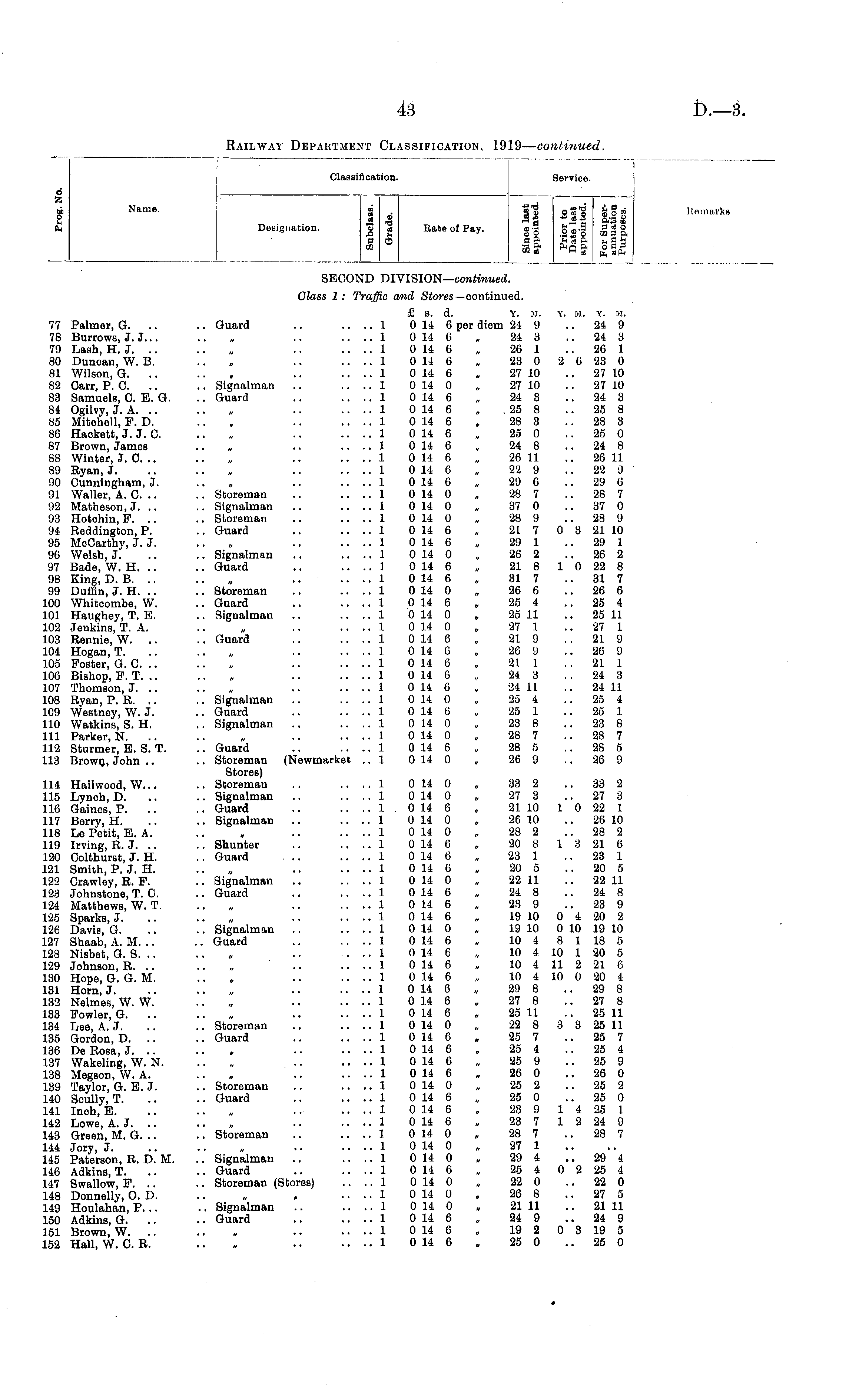 Classification. Service. 4 A A o i. ft Designation. to i 4 -H CO .a s a a CO Bate of Pay. 11 oti a ih— a So 1*1 aft p a ft iZS 1 Remarks Name. |.2S ft** <a S -A o qq s a J~ I 3 O A3 fc *fc SECOND DIVISION— continued. Class 1 : Traffic and Stores—continued. 77 Palmer, G. .. 78 Burrows, J. J... 79 Lash, H. J. 80 Dunoan, W. B. 81 Wilson, G. .. 82 Carr, P. 0. 83 Samuels, 0. E. G, 84 Ogilvy, J. A. 85 Mitchell, F. D. 86 Hackett, J. J. C. 87 Brown, James 88 Winter, J. C. .. 89 Ryan, J. 90 Cunningham, J. 91 Waller, A. C. .. 92 Matheson, J. .. 93 Hotohin, F. .. 94 Reddington, P. 95 MoCarthy, J. J. 96 Welsh, J. 97 Bade, W. H. 98 King, D. B. 99 Duffin, J. H. .. LOO Whitcombe, W. 101 Haughey, T. E. L02 Jenkins, T. A. L03 Rennie, W. .. 104 Hogan, T. L05 Foster, G. 0. LOO Bishop, F. T. L07 Thomson, J. .. 08 Ryan, P. R. .09 Westney, W. J. .10 Watkins, S. H. Lll Parker, N. L12 Sturmer, E. S. T. .13 Brown, John .. Lll Hailwood, W... L15 Lynoh, D. il6 Gaines, P. L17 Berry, H. L18 Le Petit, E. A. L19 Irving, R. J. L20 Colthurst, J. H. .21 Smith, P. J. H. .22 Crawley, R. F. .23 Johnstone, T. 0. .24 Matthews, W. T. .25 Sparks, J. .26 Davis, G. .27 Shaab, A. M. .. .28 Nisbet, G. S. .. .29 Johnson, R. .. .30 Hope, G. G. M. .31 Horn, J. L32 Nelmes, W. W. .33 Fowler, G. .. .34 Lee, A. J. L35 Gordon, D. .. :36 DeRosa, J. .. L37 Wakeling, W. N. 138 Megson, W. A. 139 Taylor, G. E. J. 140 Scully, T. 141 Inch, E. L42 Lowe, A. J. .. .43 Green, M. G. .. L44 Jory, J. .45 Paterson, R. D. M. .46 Adkins, T. .47 Swallow, F. .. L48 Donnelly, O. D. 149 Houlahan, P... L50 Adkins, G. L51 Brown, W. .. .52 Hall, W. 0. R. £ S. d. Y. M. Y. M. Y. H. .. Guard .. .... 1 0 14 6 per diem 24 9 .. 24 9 .... 1 0 14 0 „ 24 3 .. 24 3 .... 1 0 14 6 „ 26 1 26 1 .... 1 0 14 6 , 23 0 2 6 23 0 .... 1 0 14 6 „ 27 10 .. 27 10 .. Signalman .. .... 1 0 14 0 „ 27 10 .. 27 10 .. Guard .. .... 1 0 14 6 „ 24 3 .. 24 3 .... 1 0 14 6 , ,25 8 25 8 .... 1 0 14 6 „ 28 3 .. 28 3 .... 1 0 14 6 „ 25 0 .. 25 0 .... 1 0 14 6 „ 24 8 .. 24 8 .... 1 0 14 6 „ 26 11 26 11 .... 1 0 14 6 „ 22 9 22 9 .... 1 0 14 6 „ 29 6 29 6 .. Storeman .. .... 1 0 14 0 „ 28 7 .. 28 7 .. Signalman .. .... 1 0 14 0 „ 37 0 .. 37 0 .. Storeman .. .... 1 0 14 0 „ 28 9 .. 28 9 .. Guard .. .... 1 0 14 6 , 21 7 0 3 21 10 .... 1 0 14 6 „ 29 1 29 1 .. Signalman .. .... 1 0 14 0 „ 26 2 .. 26 2 .. Guard .. .... 1 0 14 6 , 21 8 1 0 22 8 .... 1 0 14 6 „ 31 7 .. 31 7 .. Storeman .. .... 1 0 14 0 „ 26 6 .. 26 6 .. Guard .. .... 1 0 14 6 , 25 4 .. 25 4 .. Signalman .. .... 1 0 14 0 . 25 11 .. 25 11 .... 1 0 14 0 , 27 1 27 1 .. Guard .. .... 1 0 14 6 „ 21 9 .. 21 9 .... 1 0 14 6 „ 26 9 .. 26 9 .... 1 0 14 6 , 21 1 21 1 .... 1 0 14 6 „ 24 3 24 3 .... 1 0 14 6 „ 24 11 .. 24 11 .. Signalman .. .... 1 0 14 0 „ 25 4 .. 25 4 .. Guard .. .... 1 0 14 6 „ 25 1 .. 25 1 .. Signalman .. .... 1 0 14 0 „ 23 8 .. 23 8 .... 1 0 14 0 „ 28 7 28 7 .. Guard .. .... 1 0 14 6 „ 28 5 .. 28 5 .. Storeman (Newmarket .. 1 0 14 0 „ 26 9 .. 26 9 Stores) .. Storeman .. .... 1 0 14 0 „ 83 2 .. 33 2 .. Signalman .. .... 1 0 14 0 ,, 27 3 .. 27 3 .. Guard .. .... 1 0 14 6 „ 21 10 1 0 22 1 .. Signalman .. .... 1 0 14 0 . 26 10 .. 26 10 .... 1 0 14 0 „ 28 2 .. 28 2 .. Shunter .. .... 1 0 14 6 „ 20 8 1 3 21 6 .. Guard ... .... 1 0 14 6 „ 23 1 .. 23 1 .... 1 0 14 6 „ 20 5 .. 20 5 .. Signalman .. .... 1 0 14 0 „ 22 11 .. 22 11 .. Guard .. .... 1 0 14 6 „ 24 8 .. 24 8 .... 1 0 14 6 „ 23 9 23 9 .... 1 0 14 6 „ 19 10 0 4 20 2 .. Signalman .. .... 1 0 14 0 , 19 10 0 10 19 10 .. Guard .. .... 1 0 14 6 „ 10 4 8 1 18 5 .... 1 0 14 6 „ 10 4 10 1 20 5 .... 1 0 14 6 „ 10 4 11 2 21 6 .... 1 0 14 6 „ 10 4 10 0 20 4 .... 1 0 14 6 , 29 8 29 8 .... 1 0 14 6 , 27 8 27 8 .... 1 0 14 6 „ 25 11 25 11 .. Storeman .. .... 1 0 14 0 „ 22 8 3 3 25 11 .. Guard .. .... 1 0 14 6 . 25 7 .. 25 7 .... 1 0 14 6 „ 25 4 25 4 .... 1 0 14 6 „ 25 9 .. 25 9 .... 1 0 14 6 , 26 0 .. 26 0 .. Storeman .. .... 1 0 14 0 „ 25 2 .. 25 2 .. Guard .. .... 1 0 14 6 „ 25 0 .. 25 0 .... 1 0 14 6 „ 23 9 1 4 25 1 .... 1 0 14 6 , 23 7 1 2 24 9 .. Storeman .. .... 1 0 14 0 , 28 7 .. 28 7 .... 1 0 14 0 „ 27 1 .. Signalman .. .... 1 0140 , 29 4 .. 29 4 .. Guard .. .... 1 0 14 6 „ 25 4 0 2 25 4 .. Storeman (Stores) .... 1 0 14 0 , 22 0 .. 22 0 .... 1 0 14 0 , 26 8 27 5 .. Signalman .. .... 1 0 14 0 „ 2111 .. 2111 .. Guard .. .... 1 0 14 6 „ 24 9 .. 24 9 .... 1 0 14 6 , 19 2 0 3 19 5 .... 1 0 14 6 , 25 0 .. 25 0