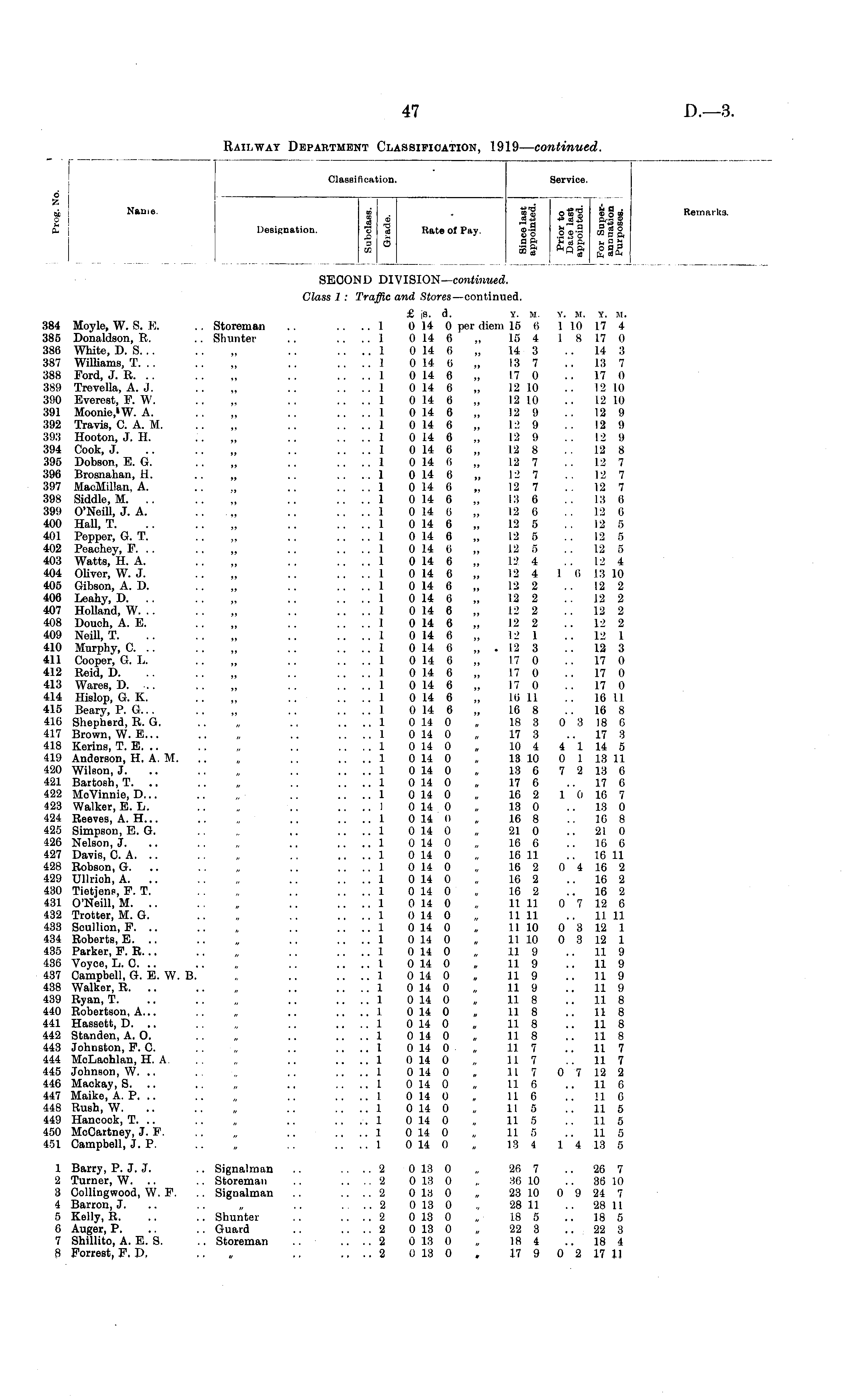 Classification. Service. A A ■ ' " ,-- ob Name. » . . t% OS'S S§« O c3® ft'^ ft | Designation. B la Rate of Pay. g-g gg-2 co g g, 3(3 SSiPSftinaiH * S3& °gS § £ fi S 3 © CC Hate of Pay. Remarks. SECOND DIVISION— continued. Class 1 : Traffic and Stores —continued. £ |8. d. Y. M. Y. M. Y. M. 384 Moyle, W. S. E. .. Storeman .. .... 1 0 14 0 per diem 15 6 1 10 17 4 385 Donaldson, R. .. Shunter .. .... 1 0 14 6 „ 15 4 I 8 17 0 386 White, D. S. .. .. „ .. .... 1 0 14 6 „ 14 3 .. 14 3 387 Williams, T. . . .. „ .. .... 1 0 14 6 13 7 13 7 388 Ford, J. R. .. .. „ .. .... 1 0146 „ 170 .. 170 389 Trevella, A. J. .. „ .. .... 1 0 14 6 „ 12 10 .. 12 10 390 Everest, F. W. .. „ .. .... 1 0 14 6 „ 12 10 .. 12 10 391 Moonie,»W. A. .. „ .. .... I 0 14 6 „ 12 9 .. 12 9 392 Travis, C. A. M .. .... I 0 14 6 „ 12 9 12 9 393 Hooton, J. H. .. „ .'. .... 1 0 14 6 „ 12 9 12 9 394 Cook, J. .. .. „ .. .... 1 0 14 6 „ 12 8 12 8 395 Dobson, E. G. .. „ .. .... 1 0 14 Ii „ 12 7 12 7 396 Brosnahan, H. .. „ .. .... 1 0 14 6 „ 127 127 397 MacMillan, A. .. ., .. .... 1 0 14 6 „ 12 7 .. 12 7 398 Siddlo, M. .. .. „ .. .... 1 0 14 6 13 6 13 6 399 O'Neill, J. A. .. .„ .. .... 1 0 14 6 „ 12 6 12 6 400 Hall, T. .. .. „ .. .... 1 0 14 6 12 5 12 5 401 Pepper, G. T. .. „ .. .... 1 0 14 6 „ 12 5 .. 12 5 402 Peachey, F. .. .. „ .. .... 1 0 14 6 „ 12 5 12 5 403 Watts, H. A. .. „ .. .... 1 0 14 6 „ 12 4 .. 12 4 404 Oliver, W. J. .. „ .. .... 1 0 14 6 12 4 1 0 13 10 405 Gibson, A. D. .. „ .. .... I 0 14 6 „ 12 2 .. 12 2 406 Leahy, D. .. .. „ .. .... 1 0 14 6 12 2 12 2 407 Holland, W... .. „ .. .... I 0 14 6 „ 12 2 12 2 408 Douch, A. E. .. „ .. .... 1 0 14 6 „ 12 2 12 2 409 Neill, T. .. .. „ .. .... I 0 14 6 „ 12 1 12 1 410 Murphy, C .. .. „ .. .... I 0 14 6 „ . 12 3 12 3 411 Cooper, G. L. .. „ .. .... 1 0 14 6 „ 17 0 17 0 412 Reid, D. .. .. „ .. .... 1 0 14 6 „ 17 0 17 0 413 Wares, D. ... .. „ .. .... 1 0 14 6 „ 17 0 17 0 414 Hislop, G. K. .. „ .. .... 1 0 14 6 „ 16 11 .. 16 11 415 Beary, P. G... .. „ .. .... 1 0 14 6 „ 16 8 16 8 416 Shepherd, R. G. .. „ .. .... 1 0 14 0 „ 18 3 0 3 18 6 417 Brown, W. E... .. „ .. .... 1 0 14 0 „ 17 3 17 3 418 Kerins, T. E. .. .. „ .. .... 1 0 14 0 ,, 10 4 4 1 14 5 419 Anderson, H. A. M. .. „ .. .... 1 0 14 0 „ 13 10 0 1 13 11 420 Wilson, J. .. .. „ .. .... 1 0 14 0 „ 13 6 7 2 13 6 421 Bartosh.T. .. .. „ .. .... 1 0 14 0 „ 17 6 17 6 422 MoVinnie, D... .. „ ■ .. .... 1 0140 „ 16 2 1 0 16 7 423 Walker, E. L. .. „ .. .... 1 0 14 0 „ 13 0 13 0 424 Reeves, A. H... .. „ .. .... 1 0 14 0 „ 1.6 8 16 8 425 Simpson, E. G. .. „ .. .... 1 0 14 0 „ 21 0 21 0 426 Nelson, J. .. .. „ .. .... 1 0 14 0 „ 16 6 .. 16 6 427 Davis, C. A. .. .. „ .. .... 1 0 14 0 „ 16 11 .. 16 11 428 Robson,G. .. .. „ .. .... 1 0 14 0 „ 16 2 0 4 16 2 429 Ullrioh, A. .. .. „ .. .... 1 0 14 0 „ 16 2 16 2 430 Tietjens, F. T. „ .. .... 1 0 14 0 „ 16 2 16 2 431 O'Neill, M. .. .. „ .. .... 1 0 14 0 „ 11 11 0 7 12 6 432 Trotter, M. G. .. „ .. .... 1 0 14 0 „ 1111 ..1111 433 Scullion, F. .. .. „ .. .... 1 0 14 0 „ 11 10 0 3 12 1 434 Roberts, E. .. .. , .. .... 1 0 14 0 „ 11 10 0 3 12 1 435 Parker, F. R... .. „ .. .... 1 0 14 0 „ 11 9 11 9 436 Voyce, L. C. .. .. „ .. .... I 0 14 0 „ 119 11 9 437 Campbell, G. E. W. B. „ .. .... 1 0 14 0 „ 11 9 11 9 438 Walker, R. .. .. „ .. .... 1 0 14 0 „ 11 9 11 9 439 Ryan, T. .. .. „ .. .... 1 0 14 0 „ 11 8 ..118 440 Robertson, A... .. „ .. .... 1 0 14 0 , 11 8 11 8 441 Hassett, D. .. .. „ .. .... 1 0 14 0 „ 118 ..118 442 Standen, A. O. .. „ .. .... 1 0 14 0 „ 11 8 11 8 443 Johnston, F. C. .. „ .. .... 1 0 14 0 „ 11 7 11 7 444 McLaohlan, H. A. .. „ .. .... 1 0 14 0 „ 11 7 11 7 445 Johnson, W. .. .. „ .. .... 1 0 14 0 „ 11 7 0 7 12 2 446 Mackay, S. .. .. „ .. .... 1 0 14 0 „ 11 6 11 6 447 Maike, A. P. .. .. „ .. .... 1 0 14 0 „ 11 6 .. 11 6 448 Rush, W. .. .. „ .. .... 1 0 14 0 „ 11 5 11 5 449 Hancock, T. .. .. „ .. .... 1 0 14 0 „ 11 5 11 5 450 McCartney, J. F. .. „ .. .... 1 0 14 0 „ 11 5 11 5 451 Campbell, J. P. .. „ .... 1 0 14 0 „ 13 4 1 4 13 5 1 Barry, P. J. J. .. Signalman .. .... 2 0 13 0 „ 26 7 .. 26 7 2 Turner, W. .. .. Storeman .. .... 2 0 13 0 ,. 36 10 .. 36 10 3 Collingwood, W. F. .. Signalman .. .... 2 0 13 0 „ 23 10 0 9 24 7 4 Barron, J. .. .. „ .. .... 2 0 13 0 ., 28 11 ..28 11 5 Kelly, R. .. .. Shunter .. .... 2 0 13 0 „ 18 5 .. 18 5 0 Auger, P. .. .. Guard .. .... 2 0 13 0 „ 22 3 .. 22 3 7 Shillito, A. E. S. .. Storeman .. .... 2 0 13 0 „ 18 4 .. 18 4 8 Forrest, F. D, ,, » ., .... 2 0 13 0 . 17 9 0 2 17 11