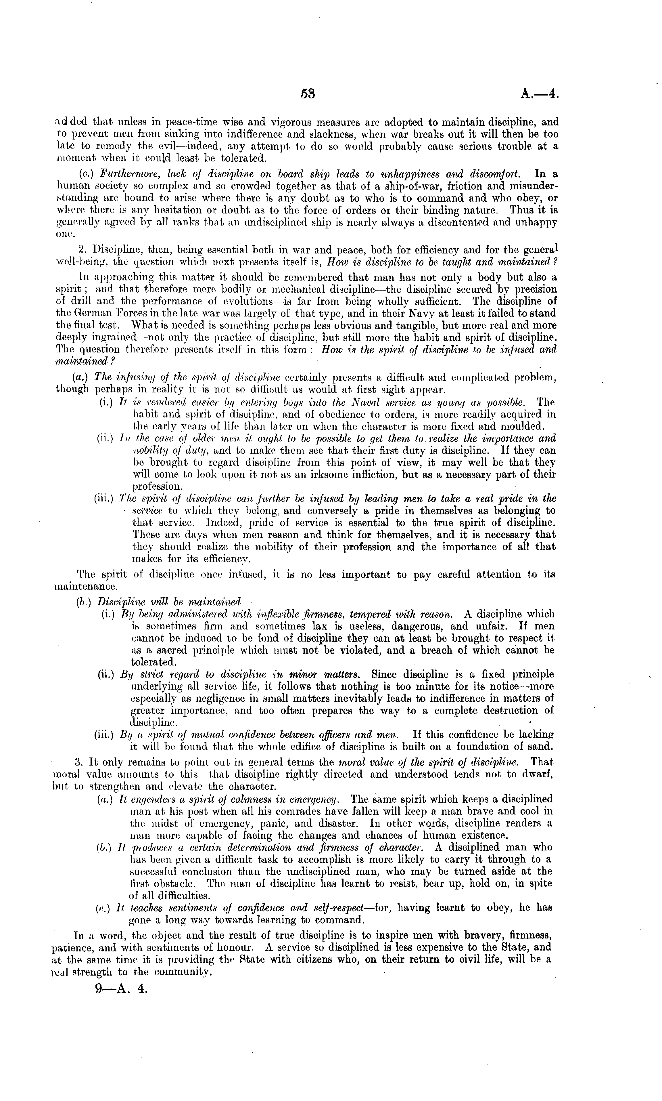 added that unless in peace-time wise and vigorous measures are adopted to maintain discipline, and to prevent men from sinking into indifference and slackness, when war breaks out it will then be too late to remedy the evil—indeed, any attempt to do so would probably cause serious trouble at a moment when it could least be tolerated. (c.) Furthermore, lack oj discipline on board ship leads to unhappiness and discomfort. In a human society so complex and so crowded together as that of a ship-of-war, friction and misunderstanding are bound to arise where there is any doubt as to who is to command and who obey, or where there is any hesitation or doubt as to the force of orders or their binding nature. Thus it is generally agreed by all ranks that an undisciplined ship is nearly always a discontented and unhappy one. 2. Discipline, then, being essential both in war and peace, both for efficiency and for the genera' well-being, the question which next presents itself is, How is discipline to be taught and maintained ? In approaching this matter it should be remembered that man has not only a body but also a spirit; and that therefore mere bodily or mechanical discipline—the discipline secured by precision of drill and the performance of evolutions—is far from being wholly sufficient. The discipline of the German Forces in the late war was largely of that type, and in their Navy at least it failed to stand the final test. What is needed is something perhaps less obvious and tangible, but more real and more deeply ingrained—not only the practice of discipline, but still more the habit and spirit of discipline. The question therefore presents itself in this form : How is the, spirit of discipline to be infusea and maintained ? (a.) The infusing oj the spirit oj discipline certainly presents a difficult and complicated problem, though perhaps in reality it is not so difficult as would at first sight appear. (i.) It is rendered easier by entering boys into the Naval service as young as possible. The habit and spirit of discipline, and of obedience to orders, is more readily acquired in the early years of life than later on when the character is more fixed and moulded. (ii.) In the case of older men it ought to be possible to get them to realize the importance and nobility oj duty, and to make them see that their first duty is discipline. If they can be brought to regard discipline from this point of view, it may well be that they will come to look upon it not as an irksome infliction, but as a necessary part of their profession, (iii.) The spirit oj discipline can further be injused by leading men to take a real pride in the service to which they belong, and conversely a pride in themselves as belonging to that service. Indeed, pride of service is essential to the true spirit of discipline. These are days when men reason and think for themselves, and it is necessary that they should realize the nobility of their profession and the importance of all that makes for its efficiency. The spirit of discipline once infused, it is no less important to pay careful attention to its maintenance. (b.) Discipline will be maintained — (i.) By being administered, with inflexible firmness, tempered with reason. A discipline which is sometimes firm and sometimes lax is useless, dangerous, and unfair. If men cannot be induced to be fond of discipline they can at least be brought to respect it as a sacred principle which must not be violated, and a breach of which cannot be tolerated, (ii.) By strict regard to discipline in minor matters. Since discipline is a fixed principle underlying all service life, it follows that nothing is too minute for its notice—more especially as negligence in small matters inevitably leads to indifference in matters of greater importance, and too often prepares the way to a complete destruction of discipline, (iii.) By a spirit oj mutual confidence between officers and men. If this confidence be lacking it will be found that the whole edifice of discipline is built on a foundation of sand. 3. It only remains to point out in general terms the moral value oj the spirit oj discipline. That moral value amounts to this—that discipline rightly directed and understood tends not to dwarf, but to strengthen and elevate the character. (a.) It engenders a spirit oj calmness in emergency. The same spirit which keeps a disciplined man at his post when all his comrades have fallen will keep a man brave and cool in the midst of emergency, panic, and disaster. In other words, discipline renders a man more capable of facing the changes and chances of human existence. (b.) It, produces a certain determination and firmness of character. A disciplined man who has been given a difficult task to accomplish is more likely to carry it through to a successful conclusion than the undisciplined man, who may be turned aside at the first obstacle. The man of discipline has learnt to resist, bear up, hold on, in spite of all difficulties, (o.) It leaches sentiments of confidence and selj-respecl —for, having learnt to obey, he has gone a long way towards learning to command. In a word, the object and the result of true discipline is to inspire men with bravery, firmness, patience, and with sentiments of honour. A service so disciplined is less expensive to the State, and at the same time it is providing the State with citizens who, on their return to civil life, will be a leal strength to the community.