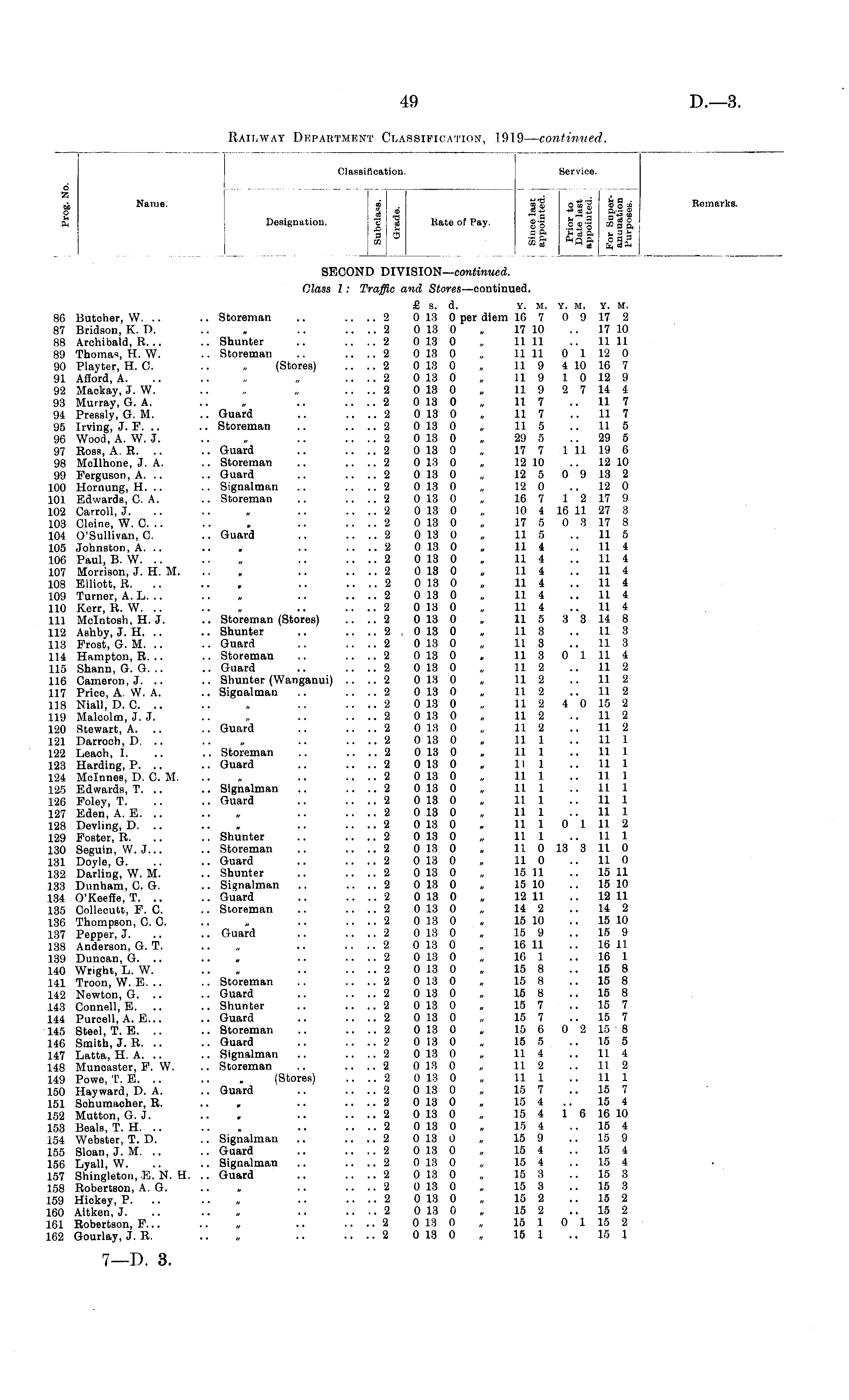 Classification. Service. 6 , _—— .———. w Name. « . §1* ofg «§£ £ Designation. c a Rate of Pay. g-| oa-g co § g, a 3 .3 a ? a a u 2 5 » SS oa~ 6 A oc o u Classification. Remarks. SECOND DIVISION— continued. Class 1: Traffic and Stores —continued. £ s. d. Y. M. Y. m, Y. M. 86 Butcher, W. .. .. Storeman .. .... 2 0 13 0 per diem 16 7 0 9 17 2 87 Bridson, K. D. .. „ .. .... 2 0 13 0 „ 17 10 17 10 88 Archibald, R. .. .. Shunter .. .... 2 0 13 0 , 1111 .. 1111 89 Thomas H. W. .. Storeman .. .... 2 0 13 0 „ 11 11 0 1 12 0 90 Playter, H. 0. .. „ (Stores) .... 2 0 13 0 „ 11 9 4 10 16 7 91 Afford, A. .. .. „ „ .... 2 0 13 0 „ 11 9 1 0 12 9 92 Mackay, J. W. .. „ „ .... 2 0 13 0 „ 11 9 2 7 14 4 93 Murray, G. A. .. „ .. .... 2 0 13 0 „ 11 7 11 7 94 Pressly, G. M. .. Guard .. .... 2 0 13 0 „ 11 7 .. 11 7 95 Irving, J. F. .. .. Storeman .. .... 2 0 13 0 „ 11 5 .. 11 5 96 Wood, A. W.J. .. , .. .... 2 0 13 0 . 29 5 .. 29 5 97 Ross, A. R. .. .. Guard .. .... 2 0 13 0 „ 17 7 1 11 19 6 98 Mollhone, J. A. .. Storeman .. .... 2 0 13 0 . 12 10 .. 12 10 99 Ferguson, A. .. .. Guard .. .... 2 0 13 0 „ 12 5 0 9 13 2 100 Hornung, H. .. .. Signalman .. .... 2 0 13 0 „ 12 0 .. 12 0 101 Edwards, O. A. .. Storeman .. .... 2 0 13 0 „ 16 7 1 2 17 9 102 Carroll, J. .. .. , .. .... 2 0 13 0 „ 10 4 16 11 27 3 103 Cleine, W. C. .. .. , 2 0 13 0 „ 17 5 0 3 17 8 104 O'Sullivan, C. .. Guard .. .... 2 0 13 0 „ 11 5 .. 11 5 105 Johnston, A. .. .. . .. .... 2 0 13 0 , 11 4 11 4 106 Paul, B. W. .. .. „ .. .... 2 0 13 0 „ 11 4 .. 11 4 107 Morrison, J. H. M. .. „ .. .... 2 0 13 0 . 114 .. 114 108 Elliott, R. .. .. , .. .... 2 0 13 0 , 11 4 .. 11 4 109 Turner, A. L... .. , .. .... 2 0 13 0 „ 11 4 .. 11 4 110 Kerr, R. W. .. .. „ .. .... 2 0 13 0 „ 11 4 .. 11 4 111 Mcintosh, H. J. .. Storeman (Stores) .... 2 0 13 0 „ 11 5 3 3 14 8 112 Ashby, J. H. .. .. Shunter .. .... 2 , 0 13 0 . 11 3 .. U 3 113 Frost, G. M. .. .. Guard .. .... 2 0 13 0 „ 11 3 .. 11 3 114 Hampton, R... .. Storeman .. .... 2 0 13 0 . 11 3 0 1 11 4 115 Shann, G. G. .. .. Guard .. .... 2 0 13 0 „ 11 2 .. 11 2 116 Cameron, J. .. .. Shunter (Wanganui) .... 2 0 13 0 „ 11 2 .. 11 2 117 Price, A. W. A. .. Signalman .. .... 2 0 13 0 . 11 2 .. 11 2 118 Niall, D. C 2 0 13 0 „ 11 2 4 0 15 2 119 Malcolm, J. J. .. „ .. .... 2 0 13 0 „ 11 2 .. 11 2 120 Stewart, A. .. .. Guard .. .... 2 0 13 0 „ 11 2 .. 11 2 121 Darroch, D. .. .. „ .. .... 2 0 13 0 „ 11 1 .. 11 1 122 Leach, I. .. .. Storeman .. .... 2 0 13 0 „ 11 1 .. 11 1 123 Harding, P. .. .. Guard .. .... 2 0 13 0 . 11 1 .. 11 1 124 Mclnnes, D. C. M. .. „ .. .... 2 0 13 0 , 11 1 .. 11 1 125 Edwards, T. .. .. Signalman .. .... 2 0 13 0 „ 11 1 .. 11 1 126 Foley, T. .. .. Guard .. .... 2 0 13 0 „ 11 1 .. 11 1 127 Eden, A. E. .. .. „ .. .... 2 0 13 0 „ 11 1 11 1 128 Devling, D .. .... 2 0 13 0 . 11 1 0 1 11 2 129 Foster, R. .. .. Shunter .. .... 2 0 13 0 „ 11 1 .. 11 1 130 Seguin, W. J... .. Storeman .. .. .. 2 0 13 0 „ 11 0 13 3 11 0 131 Doyle, G. .. .. Guard .. .... 2 0130 „ 110 .. 110 132 Darling, W. M. .. Shunter .. .... 2 0 13 0 „ 15 11 .. 15 11 133 Dunham, 0. G. .. Signalman .. .... 2 0 13 0 „ 15 10 .. 15 10 134 O'Keeffe, T. .. .. Guard .. .... 2 0 13 0 , 12 11 .. 12 11 135 Collecutt, F. 0. .. Storeman .. .... 2 0 13 0 „ 14 2 .. 142 136 Thompson, CC. .. „ .. .. ..2 0 13 0 . 15 10 .. 15 10 137 Pepper, J. .. .. Guard .. .... 2 0 13 0 „ 1.5 9 .. 15 9 138 Anderson, G. T. .. „ 2 0 13 0 „ 16 11 ..16 11 139 Duncan, G , 2 0 13 0 „ 10 1 .. 16 1 140 Wright, L. W. .. . .. .... 2 0 13 0 , 15 8 .. 15 8 141 Troon, W. E. .. .. Storeman .. .... 2 0 13 0 „ 15 8 .. 15 8 142 Newton, G. .. .. Guard .. .... 2 0 13 0 , 15 8 .. 15 8 143 Connell, E. .. .. Shunter .. .... 2 0 13 0 „ 15 7 .. 15 7 144 Purcell, A. E... .. Guard .. .... 2 0 13 0 „ 15 7 .. 15 7 145 Steel, T. E. .. .. Storeman .. .... 2 0 13 0 „ 15 6 0 2 15 8 146 Smith, J. R. .. .. Guard .. .... 2 0 13 0 „ 15 5 .. 15 5 147 Latta, H. A. .. .. Signalman .. .... 2 0 13 0 „ 11 4 .. 11 4 148 Muncaster, F. W. .. Storeman .. .... 2 0 13 0 „ 11 2 .. 1.1 2 149 Powe, T. E. .. .. . (Stores) .... 2 0 13 0 „ 111 .. Ill 150 Hay ward, D. A. .. Guard .. .... 2 0 13 0 „ 15 7 .. 15 7 151 Sohumaoher, R. .. . .. .... 2 0 13 0 „ 15 4 .. 15 4 1,52 Mutton, G.J. .. . 2 0 13 0 „ 15 4 1 6 16 10 153 Reals, T.H „ 2 0 13 0 „ 15 4 .. 15 4 154 Webster, T. D. .. Signalman .. .... 2 0 13 0 „ 15 9 .. 15 9 155 Sloan, J. M. .. .. Guard .. .... 2 0 13 0 , 15 4 .. 15 4 156 Lyall, W. .. .. Signalman .. .... 2 0 13 0 „ 15 4 .. 15 4 157 Shingleton, E. N. H. .. Guard .. .... 2 0 13 0 „ 15 3 .. 15 3 158 Robertson, A. G. .. „ 2 0 13 0 „ 15 3 .. 15 3 159 Hickey, P. .. .. „ 2 0 13 0 „ 15 2 ..152 160 Aitken, J 2 0 13 0 „ 15 2 .. 15 2 161 Robertson, F ,, 2 0 13 0 „ 15 1 0 1 15 2 162 Gourlay, J. R. .. „ .. .... 2 0 13 0 , 15 1 ., 15 1 7—D. 3.
