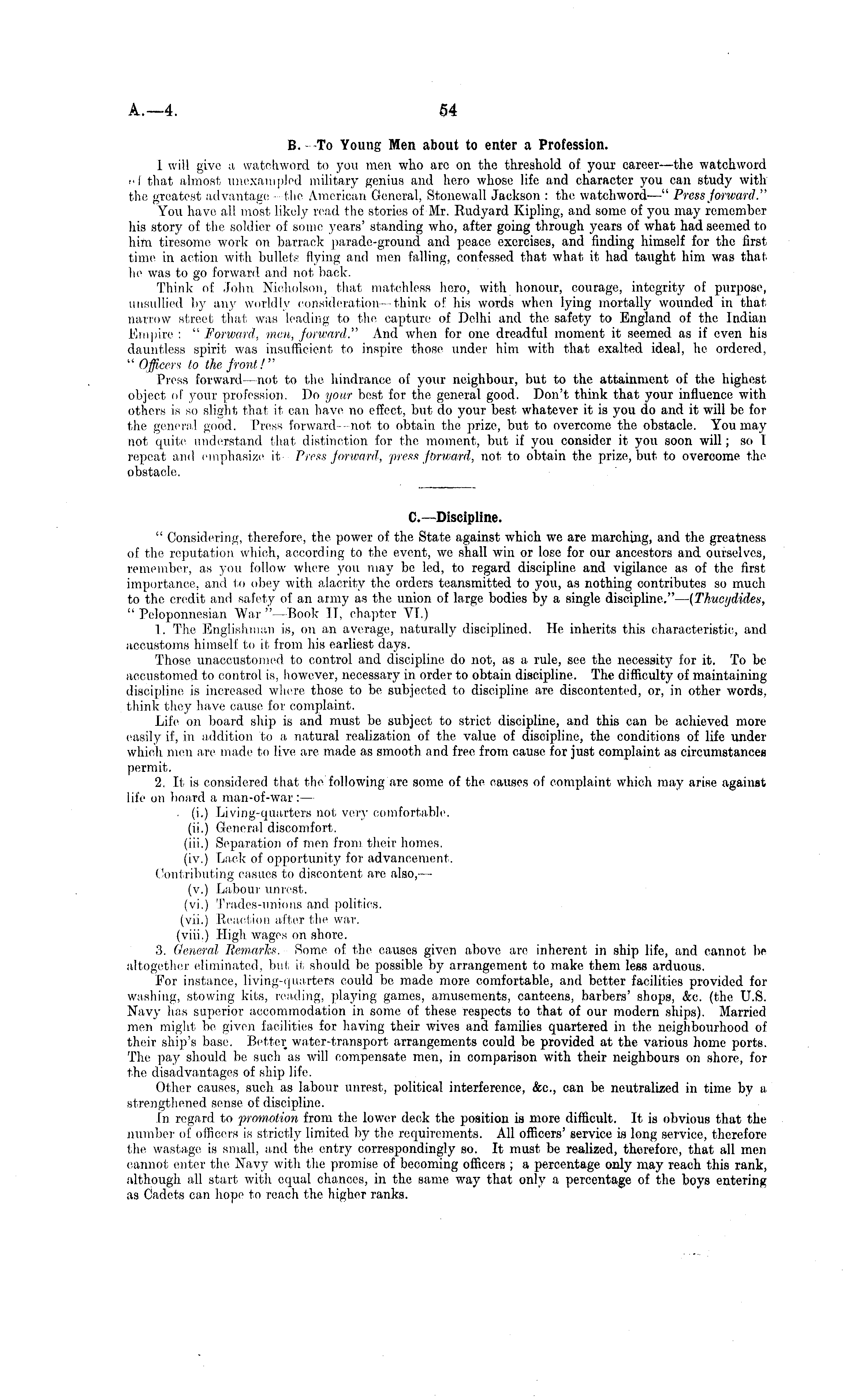 8.-~To Young Men about to enter a Profession. 1 will give a watchword to you men who are on the threshold of your career—the watchword '•I that almost unexampled military genius and hero whose life and character you can study with the greatest advantage—the American General, Stonewall Jackson : the watchword- —" Press forward." You have all most likely read the stories of Mr. Rudyard Kipling, and some of you may remember his story of the soldier of some years' standing who, after going through years of what had seemed to him tiresome work on barrack parade-ground and peace exercises, and finding himself for the first time in action with bullets flying and men falling, confessed that what it had taught him was that he was to go forward and not back. Think of John Nicholson, that matchless lie.ro, with honour, courage, integrity of purpose, unsullied by any worldly consideration—-think of his words when lying mortally wounded in that narrow street that was leading to the eapture of Delhi and the safety to England of the Indian Empire : " Forward, men, jorward." And when for one dreadful moment it seemed as if even his dauntless spirit was insufficient to inspire those under him with that exalted ideal, he ordered, "Officers to the front/" Press forward—not to the hindrance of your neighbour, but to the attainment of the highest object of your profession. Do your best for the general good. Don't think that your influence with others is so slight that it can have no effect, but do your best whatever it is you do and it will be for the general good. Press forward—not to obtain the prize, but to overcome the obstacle. You may not quite understand that distinction for the moment, but if you consider it you soon will; so I repeat and emphasize it Press forward, press forward, not to obtain the prize, but to overcome the obstacle. C. —Discipline. " Considering, therefore, the power of the State against which we are marching, and the greatness of the reputation which, according to the event, we shall win or lose for our ancestors and ourselves, remember, as you follow where you may be led, to regard discipline and vigilance as of the first importance, and to obey with alacrity the orders teansmitted to you, as nothing contributes so much to the credit and safety of an army as the union of large bodies by a single discipline."— (Thucydides, " Peloponnesian War " —Book IT, chapter VI.) 1. The Englishman is, on an average, naturally disciplined. He inherits this characteristic, and accustoms himself to it from his earliest days. Those unaccustomed to control and discipline do not, as a rule, see the necessity for it. To be accustomed to control is, however, necessary in order to obtain discipline. The difficulty of maintaining discipline is increased where those to be subjected to discipline are discontented, or, in other words, think they have cause for complaint. Life on board ship is and must be subject to strict discipline, and this can be achieved more easily if, in addition to a natural realization of the value of discipline, the conditions of life under which men are made to live are made as smooth and free from cause for just complaint as circumstances permit. 2. It is considered that the following are some of the causes of complaint which may arise against life on board a man-of-war: — (i.) Living-quarters not very comfortable. (ii.) General discomfort, (iii.) Separation of men from their homes, (iv.) Lack of opportunity for advancement. Contributing casucs to discontent are also, —• (v.) Labour unrest, (vi.) Trades-unions and politics, (vii.) Reaction after the war. (viii.) High wages on shore. 3. General Remarks. Some of the causes given above are inherent in ship life, and cannot be altogether eliminated, but it should be possible by arrangement to make them less arduous. For instance, living-quarters could be made more comfortable, and better facilities provided for washing, stowing kits, reading, playing games, amusements, canteens, barbers' shops, &c. (the U.S. Navy has superior accommodation in some of these respects to that of our modern ships). Married men might be given facilities for having their wives and families quartered in the neighbourhood of their ship's base. Better water-transport arrangements could be provided at the various home ports. The pay should be such as will compensate men, in comparison with their neighbours on shore, for the disadvantages of ship life. Other causes, such as labour unrest, political interference, &c, can be neutralized in time by a strengthened sense of discipline. In regard to promotion from the lower deck the position is more difficult. It is obvious that the number of officers is strictly limited by the requirements. All officers' service is long service, therefore the wastage is small, and the entry correspondingly so. It must be realized, therefore, that all men cannot enter the Navy with the promise of becoming officers ; a percentage only may reach this rank, although all start with equal chances, in the same way that only a percentage of the boys entering as Cadets can hope to reach the higher ranks.