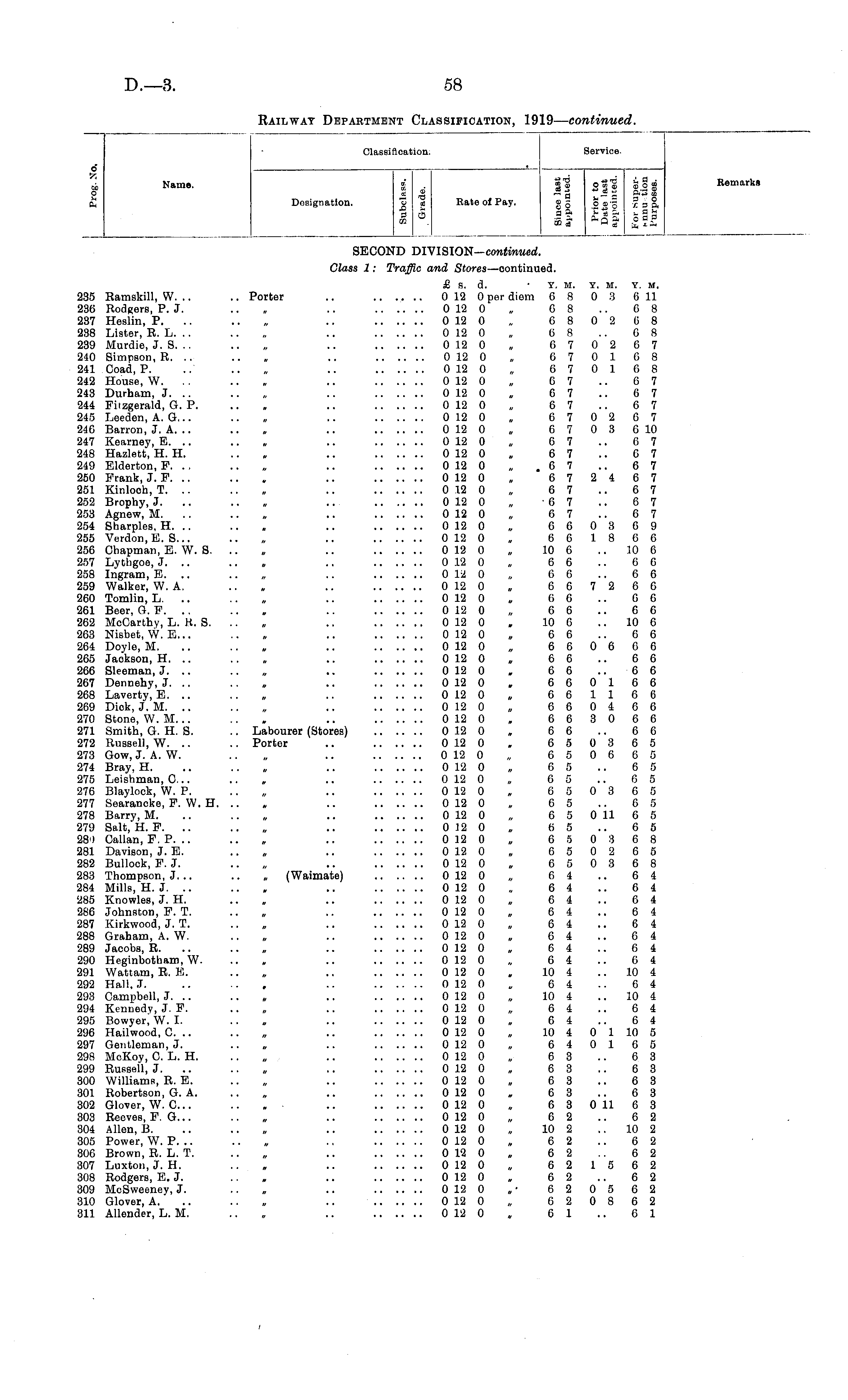 Class! ication. Service. 6 y. A o £ Name. a, a. X " s. B 02 US " a S5 a a £ 3 aii °°i £ i as £ fe -..a 3 o ogo r. 3 a >-% a ■- a H ft q ft o a a "as i, i-h Remarks Designation. 9 IS) OS 3 Rate of Pay. SECOND DlVISIOn-continued. Glass 1: Traffic and Stores —continued. £ s. d. - Y. M. !35 Ramskill, W. .. .. Porter .. 0 12 0 per diem 6 8 !36 Rodgers, P. J. .. „ .. 0 12 0 „ 0 8 !37 Heslin, P. .. .. „ .. 0 12 0 , 6 8 !38 Lister, R. L. .. .. „ .. 0 12 0 „ 6 8 !39 Murdie, J. S. .. .. „ .. 0 12 0 6 7 !40 Simpson, R. .. .. „ .. 0 12 0 „ 6 7 !41 Coad, P. ..' .. „ .. 0 12 0 „ 6 7 !42 House, W. .. .. „ .. 0 12 0 „ 6 7 !43 Durham, J. .. .. „ .. 0 12 0 „ 6 7 !44 Firzgerald, G. P. .. „ .. 0 12 0 „ 6 7 !45 Leeden, A. G... .. „ .. 0 12 0 „ 6 7 !46 Barron, J. A. .. .. „ .. 0 12 0 „ 6 7 147 Kearney, E. .. .. „ .. 0 12 0 „ 6 7 148 Hazlett, H. H. .. , .. 0 12 0 , 6 7 !49 Elderton, F. .. .. „ .. 0 12 0 „ .67 !50 Frank, J. F. .. .. . .. 0 12 0 „ 0 7 151 Kinlooh, T. .. .. „ .. 0 12 0 „ 0 7 !52 Brophy, J. .. „ .. 0 12 0 „ 6 7 153 Agnew, M. .. .. „ .. 0 12 0 „ 6 7 !54 Sharpies, H. .. .. „ .. 0 12 0 „ 6 6 !55 Verdon.E. S... .. „ .. 0 12 0 „ 6 6 156 Chapman, E. W. S. .. „ .. 0 12 0 „ 10 6 157 Lythgoe, J. .. .. „ .. 0 12 0 „ 6 6 158 Ingram, E. .. .. „ .. 0 12 0 „ 6 6 !59 Walker, W. A. .. „ .. 0 12 0 „ 6 6 160 Tomlin, L. .. .. „ .. 0 12 0 „ 6 6 161 Beer, G. F. .. .. „ .. 0 12 0 „ 6 6 !62 McCarthy, L. K. S. .. „ .. 0 12 0 , 10 6 !63 Nisbet, W. E... .. „ .. 0 12 0 „ 6 6 !64 Doyle, M. .. .. „ .. 0 12 0 „ 6 6 !65 Jackson, H. .. .. „ .. 0 12 0 „ 6 6 !66 Sleeman, J. .. .. „ .. 0 12 0 „ 6 6 167 Dennehy, J. .. .. „ .. 0 12 0 . 6 6 !68 Laverty, E. .. .. „ .. 0 12 0 „ 6 6 !69 Diok, J. M. .. .. „ .. 0 12 0 „ 6 6 !70 Stone, W. M... .. . .. 0 12 0 , 6 6 !71 Smith, G. H. S. .. Labourer (Stores) 0 12 0 „ 6 6 !72 Russell, W. .. .. Porter .. 0 12 0 , 6 5 !73 Gow, J. A. W. .. „ .. 0 12 0 „ 6 5 !74 Bray, H. .. .. „ .. 0 12 0 „ 6 5 !75 Leishman, 0... .. » .. 0 12 0 „ 6 5 !76 Blaylock, W. P. .. „ .. 0 12 0 , 6 5 !77 Searancke, F. W. H. .. „ .. 0 12 0 „ 6 5 178 Barry, M. .. .. „ .. 0 12 0 „ 6 5 179 Salt, H. F. .. .. „ .. 0 12 0 , 6 5 !8<) Callan, F. P. .. .. „ .. 0 12 0 „ 6 5 181 Davison, J. E. .. „ .. 0 12 0 „ 6 5 !82 Bullock, F. J. .. „ .. 0 12 0 „ 6 5 183 Thompson, J. .. .. „ (Waimate) 0 12 0 „ 6 4 184 Mills, H. J. .. .. „ .. 0 12 0 „ 6 4 !85 Knowles, J. H. .. „ .. 0 12 0 „ 6 4 !86 Johnston, F. T. .. „ .. 0 12 0 „ 6 4 !87 Kirkwood, J. T. .. „ .. 0 12 0 „ 6 4 188 Graham, A. W. .. „ .. 0 12 0 „ 6 4 !89 Jacobs, R. .. .. „ .. 0 12 0 „ 6 4 !90 Heginbotham, W. .. „ .. 0 12 0 „ 0 4 191 Wattam, R. E. .. „ .. 0 12 0 „ 10 4 !92 Hall. J. .. .. . .. 0 12 0 „ 6 4 !93 Campbell, J. .. .. „ .. 0 12 0 „ 10 4 194 Kennedy, J. F. .. „ .. 0 12 0 „ 6 4 !95 Bowyer, W.I. .. „ .. 0 12 0 „ 6 4 196 Hailwood, C. .. .. „ .. 0 12 0 „ 10 4 !97 Gentleman, J. .. „ .. 0 12 0 „ 6 4 !98 McKoy, CLE .. „ .. 0120 „ 63 !99 Russell, J. .. .. „ .. 0 12 0 „ 6 3 100 Williams, R. E. .. „ .. 0 12 0 „ 6 3 101 Robertson, G. A. .. „ .. 0 12 0 „ 6 3 102 Glover, W. C... .. „ ■ .. 0 12 0 „ 6 3 S03 Reeves, F. G... .. ,, .. 0 12 0 „ 6 2 104 Allen, B. .. .. „ .. 0 12 0 „ 10 2 S05 Power, W. P. .. .. „ .. 0 12 0 „ 6 2 106 Brown, R. L. T. .. „ .. 0 12 0 „ 6 2 107 Luxton, J. H. .. „ .. 0 12 0 „ 6 2 108 Rodgers, E. J. .. „ .. 0 12 0 „ 6 2 109 McSweeney, J. .. „ .. 0 12 0 „ • 6 2 110 Glover, A, .. .. „ .. 0 12 0 „ 6 2 111 Allender, L. M. .. „ .. 0 12 0 „ 6 1 Y. M. Y. M. 0 3 6 11 6 8 0 2 6 8 6 8 0 2 6 7 0 16 8 0 16 8 6 7 6 7 6 7 0 2 6 7 0 3 6 10 0 7 G 7 6 7 2 4 6 7 6 7 6 7 6 7 0 3 6 9 18 6 6 10 6 6 6 6 6 7 2 6 6 6 6 6 6 .. 10 6 6 6 0 6 0 6 6 6 .. 6 6 0 16 6 116 6 0 4 6 6 3 0 6 6 6 6 0 3 6 5 0 6 6 5 6 5 6 5 0 3 6 5 6 5 0 11 6 5 6 5 0 3 6 8 0 2 6 5 0 3 6 8 6 4 6 4 6 4 6 4 6 4 6 4 6 4 6 4 10 4 6 4 10 4 6 4 6 4 0 1 10 5 0 16 5 6 3 6 3 6 3 6 3 0 11 6 3 6 2 10 2 6 2 6 2 15 6 2 6 2 0 5 6 2 0 8 6 2 6 1