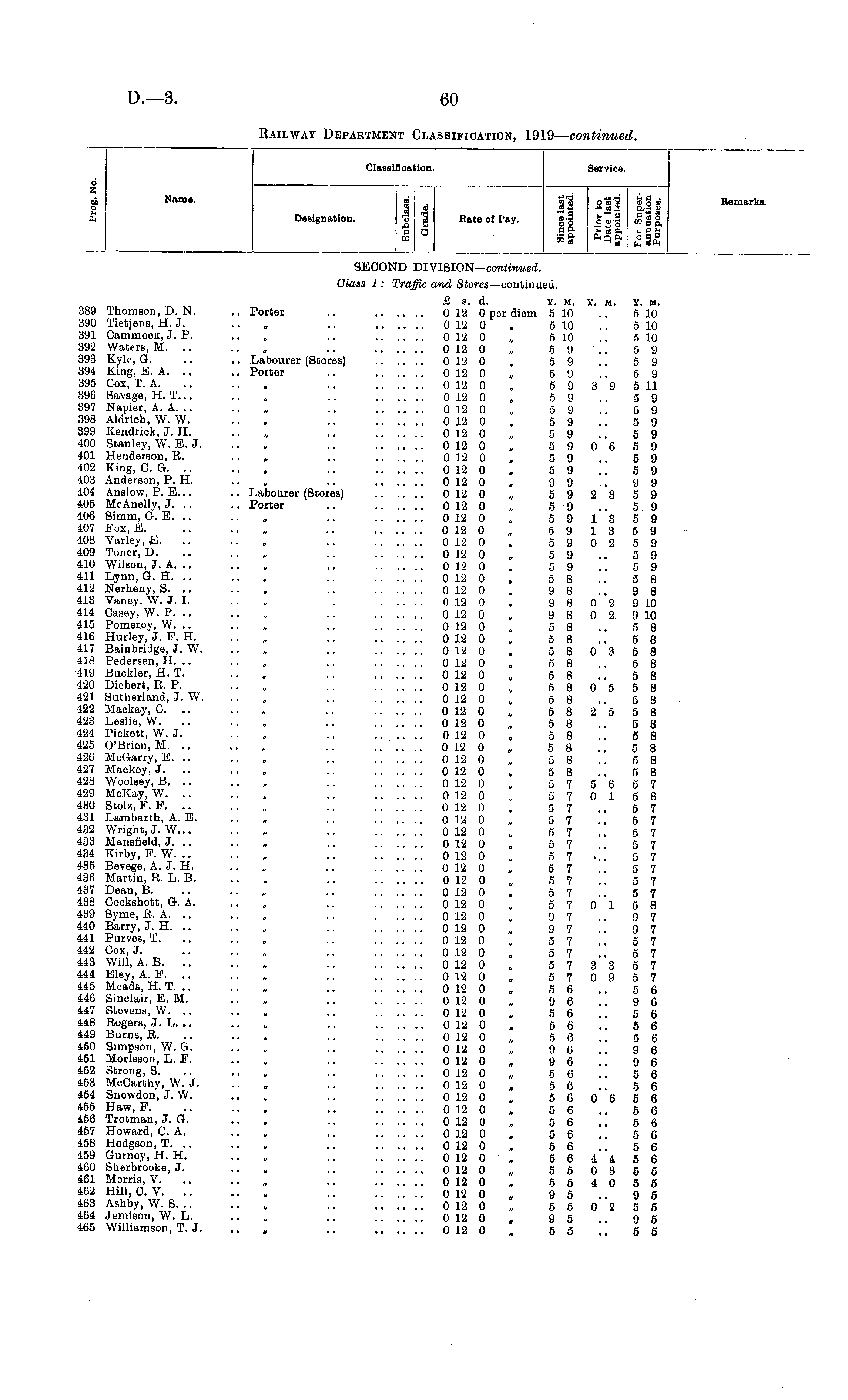 o Z t£ o u ft Name. Classification. Service. Designation. CO £ 4 a O Kate of Pay. II sit lis e.9 *Zo fltSS So .2 2S m 3 a aft u 9% Ss 2- ftQ ft i a a 3 02 co M ca fq coft Rem ark b. SECOND DIVISION— continued. Class 1: Traffic and Siorcs—continued. 389 Thomson, D. N. 390 Tietjens, H. J. 391 CammocK, J. P. 392 Waters, M. .. 393 Kyle, G. 394 King, E. A. .. 395 Cox, T. A. 396 Savage, H. T... 397 Napier, A. A. .. 398 Aldrich, W. W. 399 Kendrick, J. H. 400 Stanley, W. E. J. 401 Henderson, R. 402 King, C. G. 403 Anderson, P. H. 404 Anslow, P. E... 405 McAnelly, J. .. 406 Simm, G. E. 407 Fox, E. 408 Varley, E. 409 Toner, D. 410 Wilson, J. A. .. 411 Lynn, G. H. 412 Nerheny, S. .. 413 Vaney, W. J. I. 414 Casey, W. P. 415 Pomeroy, W. .. 416 Hurley, J. F. H. 417 Bainbridgo, J. W. 418 Pedersen, H. .. 419 Buckler, H. T. 420 Diebert, R. P. 421 Sutherland, J. W. 422 Mackay, O. .. 423 Leslie, W. 424 Pickett, W. J. 425 O'Brien, M. .. 426 McGarry, E. .. 427 Mackey, J. 428 Woolsey, B. .. 429 McKay, W. .. 430 Stolz, F. F. 431 Lambarth, A. E. 432 Wright, J. W... 433 Mansfield, J. .. 434 Kirby, F. W. .. 435 Bevege, A. J. H. 436 Martin, R. L. B. 437 Dean, B. 438 Cockshott, G. A. 439 Syme, R. A. 440 Barry, J. H. .. 441 Purves, T. 442 Cox, J. 443 Will, A. B. 444 Eley, A. F. 445 Meads, H. T. .. 446 Sinclair, E. M. 447 Stevens, W. .. 448 Rogers, J. L. .. 449 Burns, R. 450 Simpson, W. G. 451 Morisson, L. F. 452 Strong, S. 453 McCarthy, W. J. 454 Snowdon, J. W. 455 Haw, F. 456 Trotman, J. G. 457 Howard, C. A. 458 Hodgson, T. .. 459 Gurney, H. H. 460 Sherbrooke, J. 461 Morris, V. 462 Hill, C. V. .. 463 Ashby, W. S. .. 464 Jemison, W. L. 465 Williamson, T. J. £ S. d. Y. M. Y. M. .. Porter .. 0 12 0 per diem 5 10 0 12 0 „ 5 10 0 12 0 „ 5 10 0 12 0 „ 5 9'.. .. Labourer (Stores) 0 12 0 „ 5 9 .. Porter .. 0 12 0 „ 5 9 0 12 0 „ 5 9 3 9 0 12 0 „ 5 9 ...... 0 12 0 „ 59 0 12 0 „ 5 9 0 12 0 „ 5 9 0 12 0 „ 5 9 0 6 0 12 0 „ 5 9 0 12 0 . 5 9 0 12 0 „ 9 9 .. Labourer (Stores) 0 12 0 „ 5 9 2 3 .. Porter .. 0 12 0 „ 5 9 0 12 0 „ 5 9 13 0 12 0 „ 5 9 13 0 12 0 , 5 9 0 2 0 12 0 „ 5 9 0 12 0 . 5 9 0 12 0 . 5 8 0 12 0 . 9 8 0 12 0 . 9 8 0 2 0 12 0 „ 9 8 0 2. 0 12 0 „ 5 8 0 12 0 „ 5 8 0 12 0 „ 5 8 0 3 0 12 0 „ 5 8 0 12 0 „ 5 8 0 12 0 „ 5 8 0 5 0 12 0 „ 5 8 0 12 0 „ 5 8 2 5 0 12 0 „ 5 8 0 12 0 „ 5 8 0 12 0 „ 5 8 0 12 0 „ 5 8 0 12 0 „ 5 8 0 12 0 „ 5 7 5 6 0 12 0 „ 5 7 0 1 0 12 0 „ 5 7 0 12 0 5 7 0 12 0 „ 5 7 0 12 0 „ 5 7 0 12 0 „ 5 7 0 12 0 „ 5 7 0 12 0 „ 5 7 0 12 0 „ 5 7 0 12 0 „ 5 7 0 1 0 12 0 „ 9 7 0 12 0 „ 9 7 0 12 0 „ 5 7 0 12 0 „ 5 7 0 12 0 „ 5 7 3 3 0 12 0 „ 5 7 0 9 0 12 0 „ 5 0 0 12 0 „ 9 6 0 12 0 „ 5 6 0 12 0 „ 5 6 0 12 0 „ 5 6 0 12 0 „ 9 6 0 12 0 „ 9 6 0 12 0 „ 5 6 0 12 0 „ 5 6 0 12 0 „ 5 6 0 6 0 12 0 „ 5 6 0 12 0 „ 5 6 0 12 0 „ 5 6 0 12 0 „ 5 6 0 12 0 „ 5 6 4 4 0 12 0 „ 5 5 0 3 0 12 0 „ 5 5 4 0 0 12 0 „ 9 5 0 12 0 „ 5 5 0 2 0 12 0 „ 9 5 0 12 0 „ 5 5 Y. M. 5 10 5 10 5 10 5 9 5 9 5 9 5 11 5 9 5 9 5 9 5 9 5 9 5 9 5 9 9 9 5 9 5 9 5 9 5 9 5 9 5 9 5 9 5 8 9 8 9 10 9 10 5 8 5 8 5 8 5 8 5 8 5 8 5 8 5 8 5 8 5 8 5 8 5 8 5 8 5 7 5 8 5 7 5 7 5 7 5 7 5 7 5 7 5 7 5 7 5 8 9 7 9 7 5 7 5 7 5 7 5 7 5 6 9 6 5 6 5 6 5 6 9 6 9 6 5 6 5 6 5 6 5 6 5 6 5 6 5 6 5 6 5 5 5 5 9 5 5 5 9 5 6 5