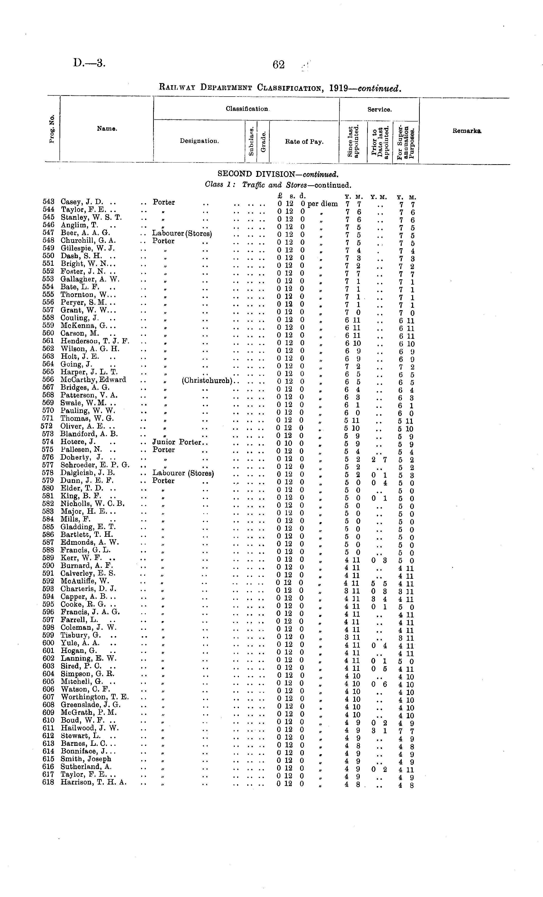 Classification Service. if Name ' I o |l s|| a Designation. J g Kate of Pay. g-g g^.9 s5 a a fc S E * 023 <^P>3 d EG cr o u ft So .2 5 5 s a flft *-a>cc 2* ogs 9 o as Q...H 9 ir, ° OS g p. u g fc 3 a 3 r^aft Remarks. Remarks. SECOND DIVISION— continued. Class 1 : Traffic and Stores— continued. _.„ _, £ s. d. Y. M. Y. M. 543 Casey, J. D. .. .. Porter .. 0 12 0 per diem 7 7 544 Taylor, F. E 0 12 0 „ 7 6 545 Stanley, W. S. T. .. „ .. 0 12 0 „ 7 6 546 Anglim, T. .. .. „ .. 0 12 0 "„ 7 5 \ \ 547 Beer, A. A. G. .. Labourer (Stores) 0 12 0 „ 7 5 548 Churchill, G. A. .. Porter .. 0 12 0 „ 7 5 549 Gillespie, W. J. .. „ .. ! 0 12 0 "„ 7 4 550 Dash, S. H. .. .. „ .. 0 12 0 " 7 3 551 Bright, W. N... .. „ .. 0 12 0 „ 7 2 552 Foster, J.N... .. „ .. 0 12 0 „ 7 7 553 Gallagher, A. W. .. „ .. 0 12 0 "„ 7 1 554 Bate, L. F. .. .. „ .. ...... 0 12 0 "„ 71 \\ 555 Thornton, W... .. „ .. 0 12 0 „ 7 1 556 Peryer, S. M. .. .. „ .. 0 12 0 7 1 557 Grant, W. W , .. .. .. ., 0 12 0 * 7 0 '.'. 558 Couhng, J. .. .. „ .. 0 1.2 0 „ 6 11 559 McKenna, G. .. .. „ .. 0 12 0 „ 6 11 560 Carson, M. .. .. „ .. 0 12 0 „ 6 11 .. 561 Henderson, T. J. F. .. , .. 0 12 0 „ 6 10 562 Wilson, A. G. H. .. „ ,. .. 0 12 0 ' 6 9 563 Holt, J. E „ .'.' 0 12 0 "„ 6 9 564 Going, J. .. .. „ .. 0 12 0 „ 7 2 565 Harper, J. L. T. .. „ .. 0 12 0 „ 6 5 566 McCarthy, Edward .. , (Christohuroh) 0 12 0 „ 6 5 567 Bridges, A. G. .. „ .. 0 12 0 „ 6 4 568 Patterson, V. A. .. ,, ., 0 12 0 6 3 569 Swale, W.M... .. „ .. ..'.." 012 0 " 61 570 Pauling, W. W. .. , 0 12 0 "„ 6 0 '.'. 571 Thomas, W. G. .. ,, .. 0 12 0 , 5 11 572 Oliver, A. E. .. .. „ .. 0 12 0 "„ 5 10 '.'. 573 Blandford, A. B. .. „ .. 0 12 0 „ 5 9 574 Hotere, J. .. .. Junior Porter.. 0 10 0 '„ 5 9 575 Pallesen, N. .. .. Porter .. 0 12 0 " 5 4 576 Doherty, J. .. .. „ .. 0 12 0 "„ 5 2 2" 7 577 Sohroeder, E. P. G. .. „ .. 0 12 0 „ 5 2 578 Dalgleish, J. B. .. Labourer (Stores) 0 12 0 " 5 2 0 1 579 Dunn, J. E. F. .. Porter .. 0 12 0 . 50 04 580 Elder, T. D 0 12 0 , 5 0 581 King, B. F. .. .. , .. 0 12 0 „ 5 0 0 1 582 Nicholls, W. 0. B. .. „ .. 0 12 0 5 0 583 Major, H. E. .. .. „ .. 0 12 0 " 5 0 584 Mills, F „ 0 12 0 „ 5 0 585 Gladding, E. T. .. , .. 0 12 0 „ 5 0 '.'. 586 Bartlett, T. H. .. „ .. 0 12 0 „ 5 0 587 Edmonds, A. W. .. „ .. 0 12 0 "„ 5 0 588 Francis, G. L. .. ,, .. 0 12 0 "„ 5 0 589 Kerr, W. F „ 0 12 0 „ 4 11 o"3 590 Bumard, A. F. .. „ .. 0 12 0 „ 4 11 591 Calverley, E. S. .. „ .. 0 12 0 "„ 4 11 592 McAuliffe, W. .. „ .. 0 12 0 „ 4 11 5" 5 593 Charteris, D. J. .. „ .. 0 12 0 „ 3 11 0 3 594 Capper, A. B. .. .. „ .. 0 12 0 "„ 4 11 3 4 595 Cooke, E.G. .. .. , .. 0 12 0 „ 4 11 0 1 596 Francis, J. A. G. .. „ .. 0 12 0 „ 4 11 597 Farrell, L. .. .. , .. 0 12 0 „ 4 11 598 Coleman, J. W. .. „ .. 0 12 0 „ 4 11 599 Tisbury, G. .. .. „ .. 0 12 0 * 3 11 600 Yule, A. A. .. .. „ .. 0 12 0 „ ill o"l 601 Hogan, G. .. „ .. 0 12 0 „ 4 11 602 Lanning, E. W. .. „ .. 0 12 0 „ 4 11 0 1 603 Sired, P. C 0 12 0 „ 4 11 0 5 604 Simpson, G. R. .. „ .. 0 12 0 „ 4 10 605 Mitchell, G. .. .. ,, .. 0 12 0 ," 4 10 o'e 606 Watson, 0. F. .. „ .. 0 12 0 „ 4 10 607 Worthington, T. E. .. „ .. 0 12 0 "„ 4 10 !! 608 Greenslade, J. G. .. „ .. 0 12 0 4 10 609 McGrath, P. M. .. „ .. 0 12 0 " 4 10 610 Boud, W.F , 0 12 0 "„ 4 9 o"2 611 Hailwood, J. W. .. „ .. ...... 0 12 0 „ 4931 612 Stewart, L. .. „ .. 0 12 0 , 4 9 613 Barnes, L. 0. .. .. „ .. 0 12 0 " 4 8 614 Bonniface, J. .. .. „ .. 0 12 0 „ 4 9 615 Smith, Joseph .. „ .. 0 12 0 " 4 9 616 Sutherland, A. .. „ .. 0 12 0 " 4 9 0 "2 617 Taylor, F. E 0 12 0 , 4 9 618 Harrison, T. H. A. .. „ .. 0 12 0 „ 4 8 Y. M. 7 7 7 6 7 6 7 5 7 5 7 5 7 4 7 3 7 2 7 7 7 1 7 1 7 1 7 1 7 0 6 11 6 11 6 11 6 10 6 9 6 9 7 2 6 5 6 5 6 4 6 3 6 1 6 0 5 11 5 10 5 9 5 9 5 4 5 2 5 2 5 3 5 0 5 0 5 0 5 0 5 0 5 0 5 0 5 0 5 0 5 0 5 0 4 11 4 11 4 11 3 11 4 11 5 0 4 11 4 11 4 11 3 11 4 11 4 11 5 0 4 11 4 10 4 10 4 10 4 10 4 10 4 10 4 9 7 7 4 9 4 8 4 9 4 9 4 11 4 9 4 8