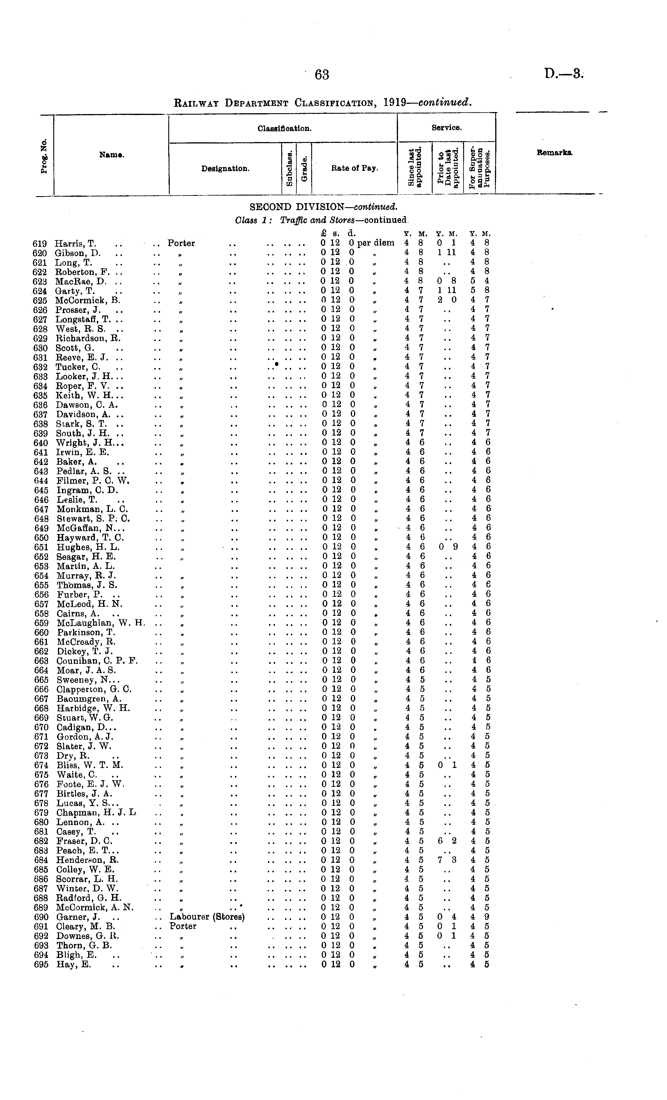 Classification. Service. fc ft Nam*. cd 9 aS ■° t 3 O OQ § a of ° 2 a a ■023 Ha C02 fc" 3 .2 2o fc ca a u a • (DO 00 Q..X 0> cggg, & aft Remarks. Designation. Rate of Pay. SECOND DIVISION— continued. Class 1: Traffic and Stores —continued 619 Harris, T. 620 Gibson, D. .. 621 Long, T. 622 Roberton, F. .. 623 MacRae, D. .. 624 Garty, T. 625 McCormick, B. 626 Prosser, J. 627 Longstaff, T. .. 628 West, R. S. .. 629 Richardson, R. 630 Scott, G. 631 Reeve, E. J. 632 Tucker, C. 633 Looker, J. H. .. 634 Roper, F. V. 635 Keith, W. H... 636 Dawson, C A. 637 Davidson, A. .. 638 Stark, S. T. 639 South, J. H. .. 640 Wright, J. H... 641 Irwin, E. E. 642 Baker, A. 643 Pedlar, A. S. 644 Filmer, P. 0. W. 645 Ingram, G. D. 646 Leslie, T. 647 Monkman, L. C. 648 Stewart, S. P. 0. 649 McGafian, N... 650 Hayward, T. C. 651 Hughes, H. L. 652 Seagar, H. E. 653 Martin, A. L. 654 Murray, R. J. 655 Thomas, J. S. 656 Furber, P. .. 657 McLeod, H. N. 658 Cairns, A. 659 MoLaughlan, W. H. 660 Parkinson, T. 661 McCready, R. 662 Dickey, T. J. 663 Counihan, C. P. F. 664 Moar, J. A. S. 665 Sweeney, N... 666 Clapperton, G. 0. 667 Baoumgren, A. 668 Harbidge, W. H. 669 Stuart, W. G. 670 Cadigan, D... 671 Gordon, A.J. 672 Slater, J. W. 673 Dry, R. 674 Bliss, W. T. M. 675 Waite, 0. .. 676 Foote, E. J. W, 677 Birtles, J. A. 678 Lucas, Y. S... 679 Chapman, H. J. L 680 Lennon, A. .. 681 Casey, T. 682 Fraser, D. C. 683 Peach, E. T... 684 Henderson, R. 685 Colley, W. E. 686 Scorrar, L. H. 687 Winter, D. W. 688 Radford, G. H. 689 McCormick, A. N. 690 Garner, J. .. 691 Cleary, M. B. 692 Downes, G. R. 693 Thorn, G. B. 694 Bligh, E. 695 Hay, E. £ S. d. Y. M. Y. M. .. Porter .. 0 12 0 per diem 4 8 0 1 0 12 0 „ 4 8 1 11 0 12 0 „ 4 8 0 12 0 , 4 8 0 12 0 „ 4 8 0 8 0 12 0 „ 4 7 1 11 0 12 0 „ 4 7 2 0 0 12 0 „ 4 7 0 12 0 „ 4 7 0 1.2 0 „ 4 7 0 12 0 „ 4 7 0 12 0 „ 4 7 0 12 0 , 4 7 ..*.... 0 12 0 „ 47 0 12 0 „ 4 7 0 12 0 „ 4 7 0 12 0 „ 4 7 0 12 0 „ 4 7 0 12 0 „ 4 7 0 12 0 „ 4 7 0 12 0 „ 4 7 0 12 0 „ 4 6 0 12 0 „ 4 6 0 12 0 „ 4 6 0 12 0 „ 4 6 0 12 0 „ 4 6 0 12 0 „ 4 6 0 12 0 , 4 6 0 12 0 „ 4 6 0 12 0 „ 4 6 .. „ .. 0 12 0 , -46 0 12 0 „ 4 6 0 12 0 . 4 6 0 9 0 12 0 „ 4 6 0 12 0 „ 4 6 0 12 0 „ 4 6 0 12 0 , 4 6 0 12 0 „ 4 6 0 12 0 „ 4 6 0 12 0 . 4 6 0 12 0 „ 4 6 0 12 0 ,. 4 6 0 12 0 „ 4 6 0 12 0 „ 4 6 0 12 0 „ 4 6 0 12 0 „ 4 6 0 12 0 , 4 5 0 12 0 „ 4 5 0 12 0 „ 4 5 0 12 0 „ 4 5 0 12 0 „ 4 5 0 12 0 . 4 5 0 12 0 „ 4 5 0 12 0 „ 4 5 0 12 0 „ 4 5 0 12 0 „ 4 5 0 1 0 12 0 , 4 5 0 12 0 „ 4 5 0 12 0 „ 4 5 0 12 0 „ 4 5 0 12 0 „ 4 5 0 12 0 „ 4 5 0 12 0 „ 4 5 0 12 0 „ 4 5 6 2 0 12 0 „ 4 5 0 12 0 „ 4 5 7 3 0 12 0 „ 4 5 0 12 0 „ 4 5 0 12 0 , 4 5 0 12 0 „ 4 5 0 12 0 , 4 5 .. Labourer (Stores) 0 12 0 „ 4 5 0 4 .. Porter .. 0 12 0 „ 4 5 0 1 0 12 0 „ 4 5 0 1 0 12 0 „ 4 5 0 12 0 , 4 5 0 12 0 „ 4 5 Y. M, 4 8 4 8 4 8 4 8 5 4 5 8 4 7 4 7 4 7 4 7 4 7 4 7 4 7 4 7 4 7 4 7 4 7 4 7 4 7 4 7 4 7 4 6 4 6 4 6 4 6 4 6 4 6 4 6 4 6 4 6 4 6 4 6 4 6 4 6 4 6 4 6 4 6 4 6 4 6 4 6 4 6 4 6 4 6 4 6 4 6 4 6 4 5 4 5 4 5 4 5 4 5 4 5 4 5 4 5 4 5 4 5 4 5 4 5 4 5 4 5 4 5 4 5 4 5 4 5 4 5 4 5 4 5 4 5 4 5 4 5 4 5 4 9 4 5 4 5 4 5 4 5 4 5