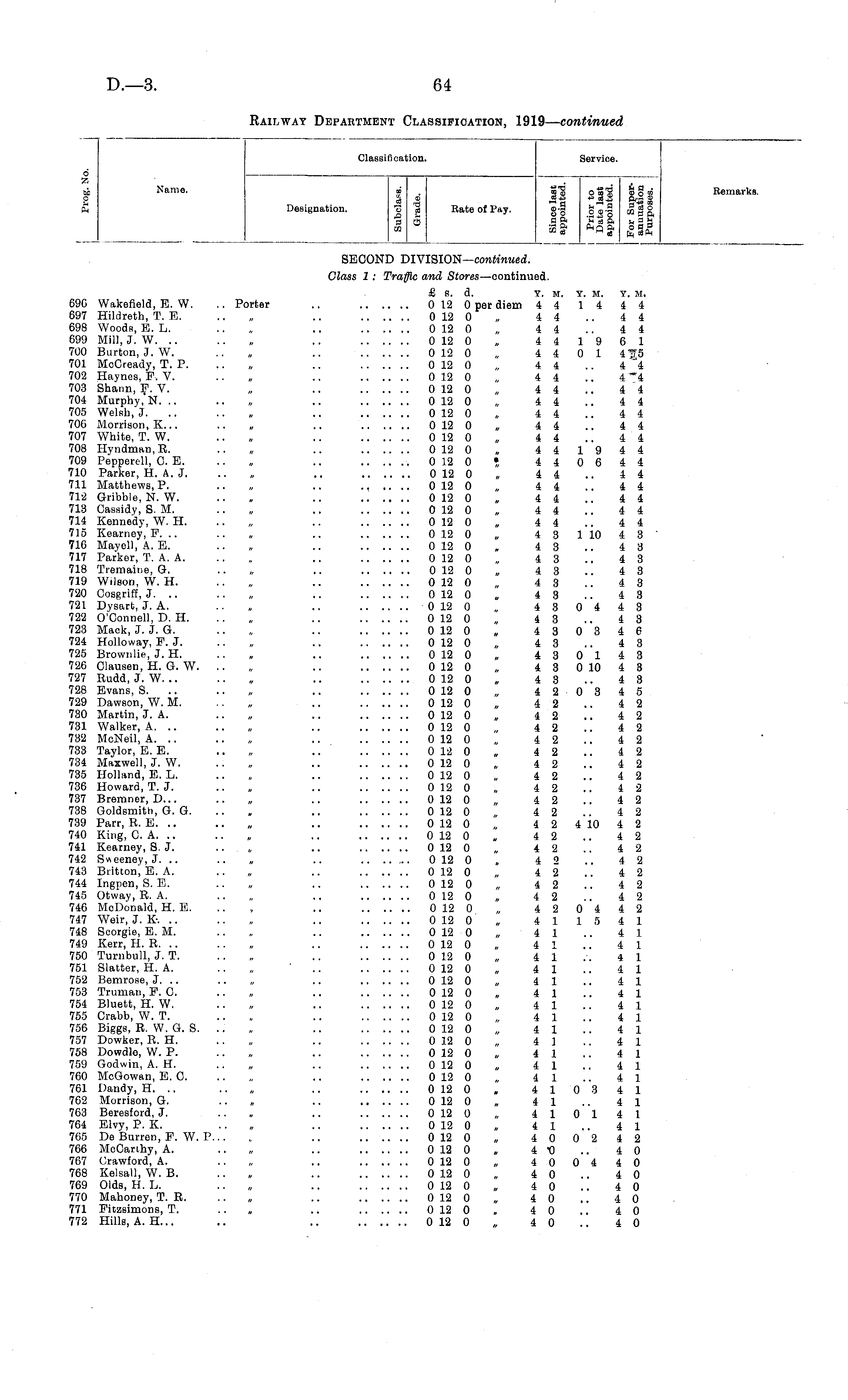 Classification. Service. d SB 5 Name. Designation. DO . .3 -a fi C s © CO Rate of Pay. si o 2 a ft 3 a sil fc™ a .2 2'3 fc cs a ft Q a fc a . o o m a "H 5 to S ft u a h o a s Remarks. SECOND DIVISION— continued. Class 1 : Traffic and Stores —continued. 696 Wakefield, E. W. .. Porter 697 Hildreth, T. E. 698 Woods, E. L. 699 Mill, J. W. .. 700 Burton, J. W. 701 McCready, T. P. 702 Haynes, F. V. 703 Shann, F. V. 704 Murphy ,'N. .. 705 Welsh, J. 706 Morrison, K... 707 White, T. W. 708 Hyndman.R. 709 Pepperell, CE. 710 Parker, H. A. J. 711 Matthews, P. 712 Gribble, N. W. 713 Oassidy, S. M. 714 Kennedy, W. H. 715 Kearney, F. .. 716 Mayell, A. E. 717 Parker, T. A. A. 718 Tremaine, G. 719 Wilson, W. H. .. „ 720 Cosgriff, J. .. 721 Dysart, J. A. 722 O'Connell, D. H. 723 Mack, J. J. G. 724 Holloway, F. J. 725 Brownlie, J. H. 726 Clausen, H. G. W. .. 727 Rudd, J. W. .. 728 Evans, S. .. 729 Dawson, W. M. 730 Martin, J. A. 731 Walker, A. .. 732 McNeil, A. .. 733 Taylor, E. E. 734 Maxwell, J. W. 735 Holland, E. L. 736 Howard, T.J. 737 Bremner, D... 738 Goldsmith, G. G. 739 Parr, R. E. .. 740 King, G. A. .. 741 Kearney, S. J. 742 Sweeney, J. .. 743 Britton, E. A. 744 Ingpen, S. E. 745 Otway, R. A. 746 MoDonald, H. E. 747 Weir, J. K. .. 748 Scorgie, E. M. 749 Kerr, H. R. .. 750 Turnbull, J. T. 751 Slatter, Ii. A. 752 Bemrose, J. .. .. „ 753 Truman, F. 0. 754 Bluett, H. W. 755 Crabb, W. T. 756 Biggs, R. W. G. S. 757 Dowker, R. H. 758 Dowdle, W. P. 759 Godwin, A. H. 760 McGowan, E. C 761 Dandy, H. .. 762 Morrison, G. 763 Beresford, J. 764 Elvy, P. K. 765 De Burren, F. W. P... 766 McCarrhy, A. 767 Crawford, A. 768 Kelsall, W. B. 769 Olds, H. L. 770 Mahoney, T. R. 771 Fitzsimons, T. 772 Hills, A. H... £ s. a. Y. M. Y. M. 0 12 0 per diem 4 4 14 0 12 0 „ 4 4 0 12 0 , 4 4 0 12 0 „ 4 4 19 0 12 0 „ 4 4 0 1 0 12 0 „ 4 4 0 12 0 „ 4 4 0 12 0 „ 4 4 0 12 0 „ 4 4 0 12 0 „ 4 4 0 12 0 , 4 4 0 12 0 „ 4 4 0 12 0 „ 4 4 19 0 12 0 • 4 4 0 6 0 12 0 , 4 4 ...... 0 12 0 „ 4 4 0 12 0 „ 4 4 0 12 0 „ 4 4 0 12 0 „ 4 4 0 12 0 „ 4 3 1 10 0 12 0 , 4 3 0 12 0 „ 4 3 0 12 0 „ 4 3 0 12 0 „ 4 3 0 12 0 , 4 3 0 12 0 „ 4 3 0 4 0 12 0 „ 4 3 0 12 0 , 4 3 0 3 0 12 0 „ 4 3 0 12 0 „ 43 01 0 12 0 „ 4 3 0 10 0 12 0 „ 4 3 0 12 0 „ 4 2 0 3 0 12 0 „ 4 2 0 12 0 , 4 2 0 12 0 „ 4 2 0 12 0 „ 4 2 0 12 0 , 4 2 0 12 0 , 4 2 0 12 0 „ 4 2 0 12 0 „ 4 2 0 12 0 „ 4 2 0 12 0 „ 4 2 0 12 0 „ 4 2 4 10 0 12 0 „ 4 2 0 12 0 „ 4 2 0 12 0 „ 4 2 0 12 0 „ 4 2 0 12 0 „ 4 2 0 12 0 „ 4 2 0 12 0 „ 4 2 0 4 0 12 0 „ 4 1 15 0 12 0 „ 4 1 0 12 0 „ 4 1 0 12 0 „ 4 1 0 12 0 „ 4 1 0 12 0 „ 4 1 0 12 0 „ 4 1 0 12 0 „ 4 1 0 12 0 , 4 1 0 12 0 „ 4 1 0 12 0 „ 4 1 0 12 0 „ 4 1 0 12 0 , 4 1 0 12 0 „ 4 1 0 12 0 „ 4 10 3 0 12 0 „ 4 1 0 12 0 „ 4 1 0 1 0 12 0 „ 4 1 0 12 0 „ 4 0 0 2 0 12 0 „ 4 0 0 12 0 „ 4 0 0 4 0 12 0 , 4 0 0 12 0 „ 4 0 0 12 0 „ 4 0 0 12 0 » 4 0 0 12 0 „ 4 0 Y. M. 4 4 4 4 4 4 6 1 4Ui5 4 4 4 "4 4 4 4 4 4 4 4 4 4 4 4 4 4 4 4 4 4 4 4 4 4 4 4 4 4 3 ' 4 3 4 3 4 3 4 3 4 3 4 3 4 3 4 6 4 3 4 3 4 3 4 3 4 5 4 2 4 2 4 2 4 2 4 2 4 2 4 2 4 2 4 2 4 2 4 2 4 2 4 2 4 2 4 2 4 2 4 2 4 2 4 1 4 1 4 1 4 1 4 1 4 1 4 1 4 1 4 1 4 1 4 1 4 1 4 1 4 1 4 1 4 1 4 1 4 1 4 2 4 0 4 0 4 0 4 0 4 0 4 0 4 0