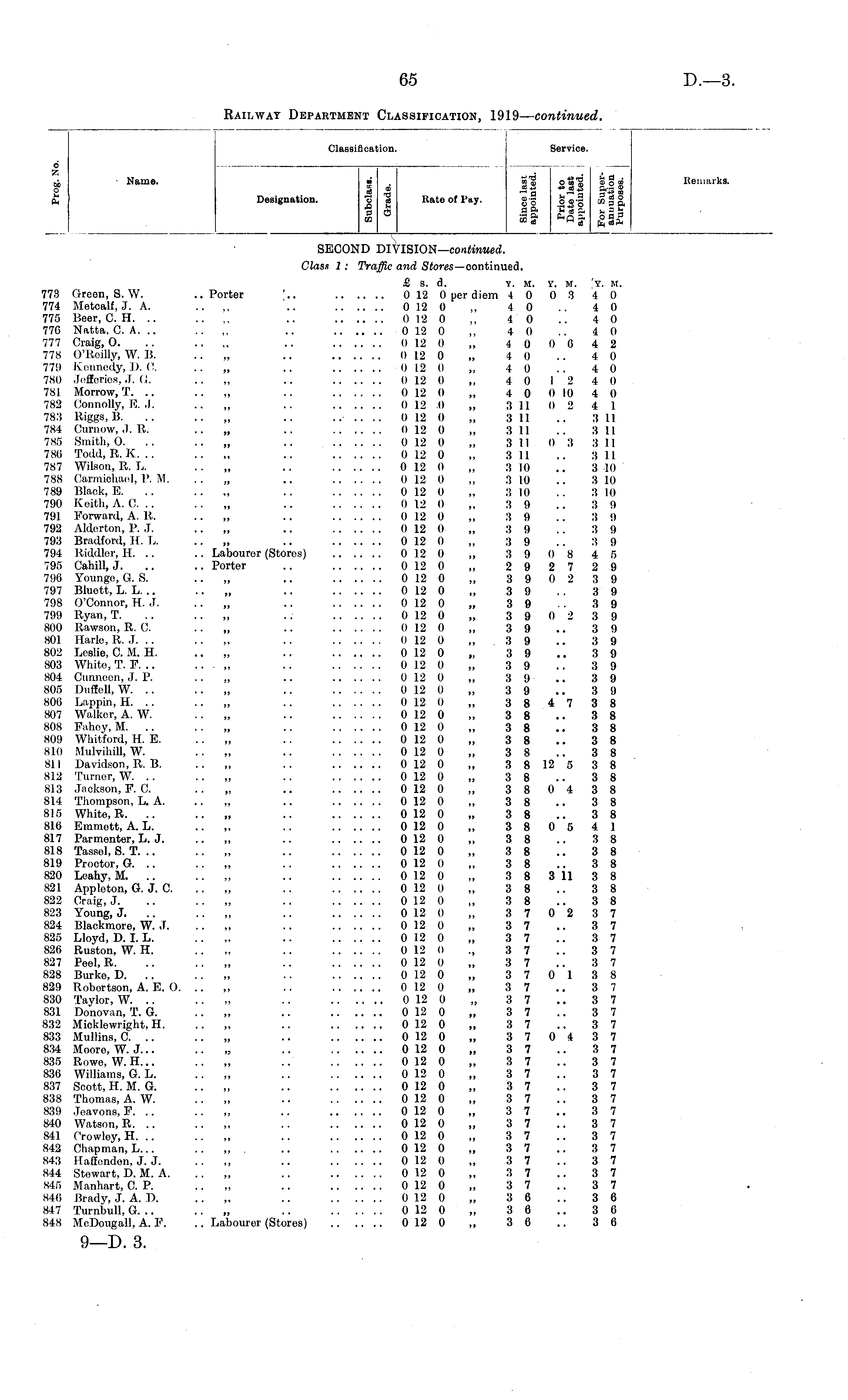 Classification. Service. o Z &b o fa ft Name. Designation. HI 9 £ -a 9 aS ■° £ 3 O 02 Rate of Pay. J» +-> ■+= a! _£ S ,. H n 11 .2 2-3 aft u s ft fc a. 9 o CO a-a o .5 co o 02 g ft fc 3 fc 3a 3 feaft Remarks. SECOND DIVISION— continued. Class 1 : Traffic and Stores— continued. 773 Green, S. W. 774 Metcalf, J. A. 775 Beer, C H. 776 Natta, C. A. .. 777 Craig, 0. 778 O'Reilly, W. B. 779 Kennedy, D. G 780 Jefferios, J. G. 781 Morrow, T. .. 782 Connolly, E. J. 783 Riggs, B. 784 Curnow, J. R. 785 Smith, 0. 786 Todd, R. K. .. 787 Wilson, R. L. 788 Carmichaol, P. M. 789 Black, E. 790 Keith, A. C. 791 Forward, A. R. 792 Alderton, P. J. 793 Bradford, H. L. 794 Riddler, H. .. 795 Cahill, J. 796 Younge, G. S. 797 Bluett, L. L. .. 798 O'Connor, H. J. 799 Ryan, T. 800 Rawson, R. C 801 Harle, R. J. 802 Leslie, C M. H. 803 White, T. F. .. 804 Cunneon, J. P. 805 Drrfiell, W. .. 806 Lappin, H. .. 807 Walker, A. W. 808 Fahey, M. .. 809 Whitford, H. E. 810 Mulviliill, W. 811 Davidson, R. B. 812 Turner, W. .. 813 Jackson, F. 0. 814 Thompson, L. A. 815 White, R. .. 816 Emmott, A. L. 817 Parmenter, L. J. 818 Tassel, S. T. .. 819 Proctor, G. .. 820 Leahy, M. .. 821 Appleton, G. J. C 822 Craig, J. 823 Young, J. 824 Blackmore, W. J. 825 Lloyd, D. I. L. 826 Ruston, W. H. 827 Peel, R. 828 Burke, D. .. 829 Robertson, A. E. O. 830 Taylor, W. .. 831 Donovan, T. G. 832 Micklewright, H. 833 Mullins, C. .. 8.34 Moore, W. J... 835 Rowo, W. H... 836 Williams, G. L. 837 Scott, H. M. G. 838 Thomas, A. W. 839 Jeavons, F. .. 840 Watson, R. 841 Crowloy, H. .. 842 Chapman, L... 843 Haflondon, J. J. 844 Stewart, D. M. A. 845 Manhart, 0. P. 846 Brady, J. A. D. 847 Turnbull, G. .. 848 McDougall, A. F. £ s. d. Y. M. Y. M. ..Porter ;.. 0 12 0 per diem 4 0 0 3 .. ,, .. 0 12 0 ,, 4 0 .. ,, .. 0 12 0 ,, 4 0.. .. ,, .. 0 12 0 ,, 4 0 .. ,, .. 0 12 0 „ 4 0 0 6 ..'■',, .. 0 12 0 „ 4 0 .. „ .. 0 12 0 „ 4 0 .. „ .. 0 12 0 ,, 4 0 12 .. „ .. 0 12 0 „ 4 0 0 10 0 12 0 „ 3 11 0 2 ...... 0 12 0 „ 3 11 .. „ .. 0 12 0 „ 3 11 .. „ .. 0 12 0 „ 3 11 OS .. „ .. 0 12 0 „ 3 11 .. „ .. 0 12 0 „ 3 10 0.12 0 ,, 3 10 .. „ .. 0 12 0 „ 3 10 0 12 0 „ 3 9 .. „ .. 0 12 0 „ 3 9 .. „ .. 0 12 0 „ 3 9 .. „ .. 0 12 0 ,, 3 9 .. Labourer (Stores) 0 12 0 ,, 3 9 0 8 .. Porter .. 0 12 0 „ 2 9 2 7 .. „ .. 0 12 0 „ 3 9 0 2 „ .. 0 12 0 „ 3 9 .. „ .. 0 12 0 „ 3 9 .. „ .. 0 12 0 „ 3 9 0 2 .. „ .. 0 12 0 „ 3 9 .. „ .. 0 12 0 „ 3 9 .. „ .. 0 12 0 „ 3 9 .. „ .. 0 12 0 „ 3 9 .. .. 0 12 0 „ 3 9 .. „ .. 0 12 0 „ 3 9 .. „ .. 0 12 0 „ 3 8 4 7 0 12 0 „ 3 8 0 12 0 „ 3 8 .. „ .. 0 12 0 „ 3 8 .. „ .. 0 12 0 „ 3 8 .. „ .. 0 12 0 ,, 3 8 12 5 .. „ .. 0 12 0 „ 3 8 0 12 0 „ 3 8 0 4 0 12 0 „ 3 8 .. „ .. 0 12 0 „ 3 8 .. „ .. 0 12 0 „ 3 8 0 5 .. „ .. 0 12 0 „ 3 8 .. „ .. 0 12 0 „ 3 8 .. „ .. 0 12 0 „ 3 8 .. „ .. 0 12 0 „ 3 8 3 11 .. „ .. 0 12 0 ,, 3 8 . . „ .. 0 12 0 „ 3 8 .. „ .. 0 12 0 „ 3 7 0 2 .. „ .. 0 12 0 „ 3 7 .. „ .. 0 12 0 „ 3 7 .. „ .. 0 12 O ., 3 7 .. „ .. 0 12 0 „ 3 7 .. .. 0 12 0 „ 3 7 0 1 .. .. 0 12 0 „ 3 7 .. „ .. 0 12 0 „ 3 7 .. .. 0 12 0 „ 3 7 .. „ .. 0 12 0 „ 3 7 .. „ .. 0 12 0 „ 3 7 0 4 0 12 0 „ 3 7 .. „ .. 0 12 0 „ 3 7 0 12 0 „ 3 7 .. .. 0 12 0 „ 3 7 0 12 0 „ 3 7 0 12 0 „ 3 7 .. „ .. 0 12 0 „ 3 7 .. „ .. 0 12 0 „ 3 7 0 12 0 „ 3 7 .. ,, .. 0 12 0 „ 3 7 .. .. 0 12 0 „ 3 7 0 12 0 „ 3 7 .. „ .. 0 12 0 „ 3 6 .. „ .. 0 12 0 „ 3 6 .. Labouror (Stores) 0 12 0 „ 3 6 'y. m. 4 0 4 0 4 0 4 0 4 2 4 0 4 0 4 0 4 0 4 1 3 11 3 11 3 II 3 11 3 10 3 10 3 10 3 9 3 9 3 9 3 9 4 5 2 9 3 9 3 9 3 9 3 9 3 9 3 9 3 9 3 9 3 9 3 9 3 8 3 8 3 8 3 8 3 8 3 8 3 8 3 8 3 8 3 8 4 1 3 8 3 8 3 8 3 8 3 8 3 8 3 7 3 7 3 7 3 7 3 7 3 8 3 7 3 7 3 7 3 7 3 7 3 7 3 7 3 7 3 7 3 7 3 7 3 7 3 7 3 7 3 7 3 7 3 7 3 6 3 6 3 6