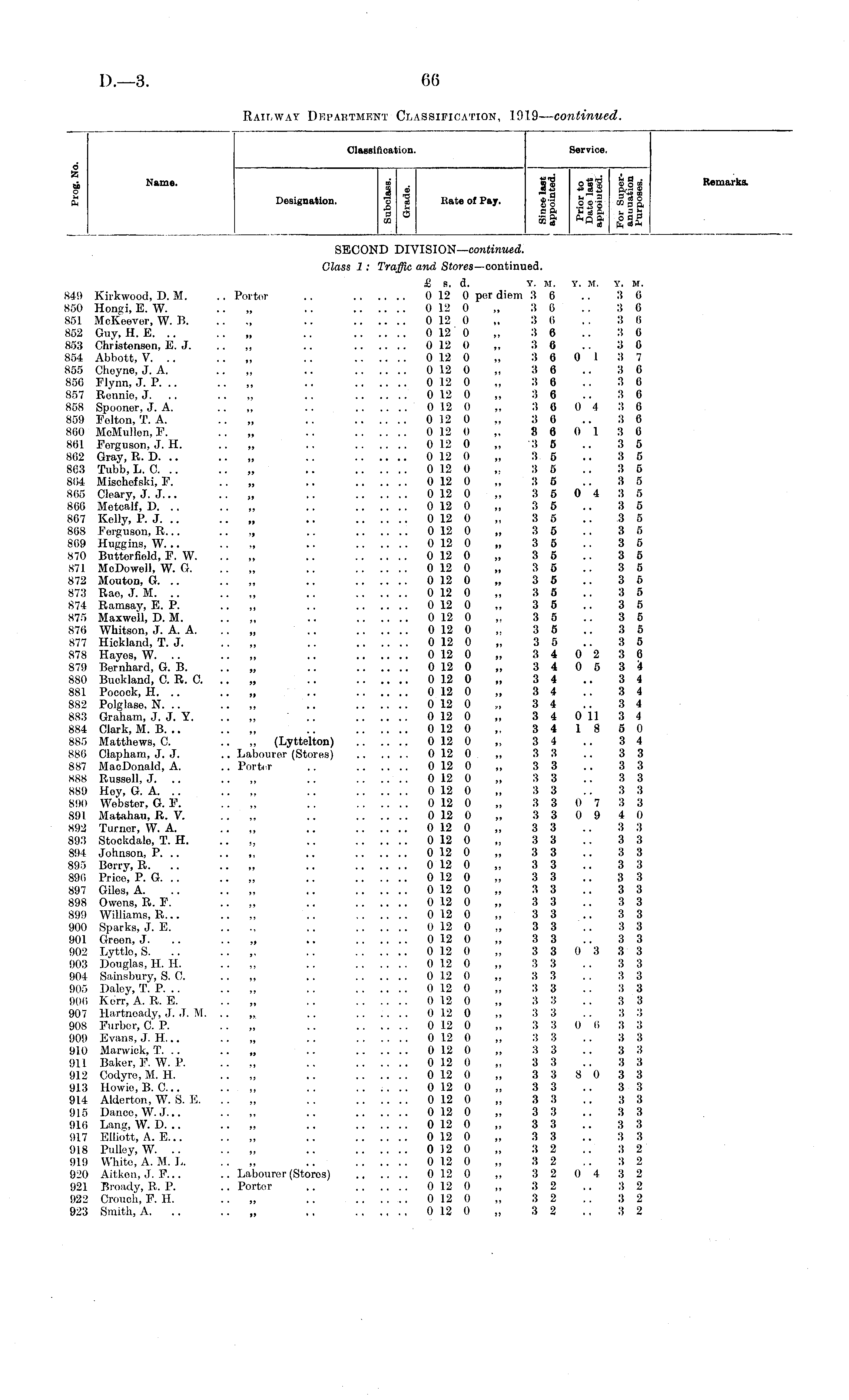 Classification. Service. 6 /. A o fc ft Name. 1 fi 0 CO 82 81 fl 2 a ft '023 0%i egg rig Hi fc a 3 co o 00-3 to 3 ft 'fc c« a fc a fc ft a ft o fl a w a fc, aft Remarks. Designation. 6 m o Rate of Pay. SECOND DIVISION— continued. Glass 1 : Traffic and Stores— continued. 849 Kirkwood, D. M. 850 Hongi, E. W. 851 McKeevor, W. B. 852 Guy, H. E. 853 Christensen, E. J. 854 Abbott, V. .. 855 Choyne, J. A. 850 Flynn, J. P. 857 Rennie, J. .. 858 Spooner, J. A. 859 Folton, T. A. 860 McMullon, F. 861 Ferguson, J. H. 862 Gray, R. D. 863 Tubb, L. C 884 Mischefski, F. 865 Cleary, J. J... 866 Metealf, D. .. 867 Kelly, P. J. 868 Ferguson, R... 869 Huggins, W... 870 Butterfield, F. W. 871 McDowell, W. G. 872 Mouton, G. .. 873 Rae, J. M. 874 Ramsay, E. P. 875 Maxwell, D. M. 876 Whitson, J. A. A. 877 Hickland, T. J. 878 Hayes, W. .. 879 Bernhard, G. B. 880 Buckland, C R. C 881 Pocock, H. .. 882 Polglase, N. .. 883 Graham, J. J. Y. 884 Clark, M. B. .. 885 Matthews, C 886 Clapham, J. J. 887 MacDonald, A. 888 Russell, J. .. 889 Hey, G. A. 890 Webster, G. F. 891 Matahau, R. V. 892 Turner, W. A. 893 Stookdale, T. H. 894 Johnson, P. .. 895 Berry, R. 890 Price, P. G. 897 Giles, A. 898 Owens, R. F. 899 Williams, R... 900 Sparks, J. E. 901 Green, J. 902 Lyttlo, S. 903 Douglas, 11. H. 904 Sainsbury, S. C 905 Daloy, T. P. .. 906 Kerr, A. R. E. 907 Hartnoady, J. J. M. 908 Furbcr, C P. 909 Evans, J. H... 910 Marwick, T. .. 911 Baker, F. W. P. 912 Codyre, M. H. 913 Howie, B.C.. 914 Alderton, W. S. E. 915 Dance, W.J... 916 Lang, W. D. .. 917 Elliott, A. E... 918 Pulley, W. .. 919 White, A. M. It. 920 Aitkon, J. F... 921 Broady, R. P. 922 Crouch, F. H. 923 Smith, A. £ s. d. Y. M. .. Porter .. 0 12 0 per diem 3 6 0 12 0 „ 3 0 .. .. 0 12 0 „ 3 6 0 12 0 „ 3 6 .. „ .. 0 12 0 „ 3 6 .. „ .. 0 12 0 „ 3 6 0 12 0 „ 3 6 .. „ .. 0 12 0 „ 3 6 0 12 0 „ 3 6 0 12 0 „ 3 6 0 12 0 „ 3 6 .. „ .. 0 12 0 „ 8 6 .. „ .. 0 12 0 „ 3 5 .. „ .. 0 12 0 „ 3 5 .. „ .. 0 12 0 ,. 3 5 .. „ .. 0 12 0 „ 3 5 .. „ .. 0 12 0 ,, 3 5 .. „ .. 0 12 0 „ 3 5 .. „ .. 0 12 0 „ 3 5 .. „ .. 0 12 0 „ 3 5 .. „ .. 0 12 0 „ 3 5 .. „ .. 0 12 0 „ 3 5 .. „ .. 0 12 0 „ 3 5 .. „ .. 0 12 0 „ 3 6 .. „ .. 0 12 0 „ 3 5 .. „ .. 0 12 0 „ 3 5 .. „ .. 0 12 0 „ 3 5 .. „ .. 0 12 0 „ 3 5 .. „ .. 0 12 0 „ 3 5 .. „ .. 0 12 0 „ 3 4 .. „ .. 0 12 0 „ 3 4 .. „ .. 0 12 0 „ 3 4 .. „ .. 0 12 0 „ 3 4 .. „ .. 0 12 0 „ 3 4 .. „ .. 0 12 0 „ 3 4 .. „ .. 0 12 0 ,, 3 4 „ (Lyttelton) 0 12 0 „ 3 4 .. Labourer (Stores) 0 12 0 „ 3 3 .. Porter .. 0 12 0 „ 3 3 .. „ .. 0 12 0 „ 3 3 .. „ .. 0 12 0 „ 3 3 .. „ .. 0 12 0 „ 3 3 .. ' „ .. 0 12 0 „ 3 3 .. „ .. 0 12 0 „ 3 3 .. „ .. 0 12 0 „ 3 3 .. „ .. 0 12 0 „ 3 3 .. „ .. 0 12 0 „ 3 3 .. „ .. 0 12 0 „ 3 3 .. „ .. 0 12 0 „ 3 3 .. ' „ .. 0 12 0 „ 3 3 .. „ .. 0 12 0 „ 3 3 .. ., .. 0 12 0 ., 3 3 .. .. 0 12 0 „ 3 3 .. „ .. 0 12 0 „ 3 3 .. ,, .. 0 12 0 „ 3 3 .. „ .. 0 12 0 „ 3 3 .. ,, .. 0 12 0 „ 3 3 .. 0 12 0 „ 3 3 . . .. 0 12 0 „ 3 3 .. „ .. 0 12 0 „ 3 3 .. „ .. 0 12 0 „ 3 3 .. „ .. 0 12 0 „ 3 3 .. „ .. 0 12 0 „ 3 3 .. „ .. 0 12 0 „ 3 3 .. „ .. 0 12 0 „ 3 3 .. „ .. 0 12 0 „ 3 3 .. „ .. 0 12 0 „ 3 3 .. „ .. 0 12 0 „ 3 3 .. „ .. 0 12 0 „ 3 3 .. „ .. 0 12 0 „ 3 2 .. „ .. 0 12 0 „ 3 2 .. Labourer-(Stores) 0 12 0 ,, 3 2 .. Porter .. 0 12 0 „ 3 2 .. „ .. 0 12 0 „ 3 2 ■ • „ 0 12 0 „ 3 2 Y. M. o"i 0 4 0 1 o"i 0°2 0 5 oil 1 8 0 7 0 9 0 "3 0 0 8 0 0 4 y. m. 3 0 3 0 3 « 3 6 3 6 3 7 3 6 3 6 3 6 3 6 3 6 3 6 3 5 3 5 3 5 3 5 3 5 3 5 3 5 3 5 3 5 3 5 3 5 3 5 3 5 3 5 3 5 3 5 3 5 3 6 3 4 3 4 3 4 3 4 3 4 5 0 3 4 3 3 3 3 3 3 3 3 3 3 4 0 3 3 3 3 3 3 3 3 3 3 3 3 3 3 3 3 3 3 3 3 3 3 3 3 3 3 3 3 3 3 3 3 3 3 3 3 3 3 3 3 3 3 3 3 3 3 3 3 3 3 3 3 3 2 3 2 3 2 3 2 3 2 3 2