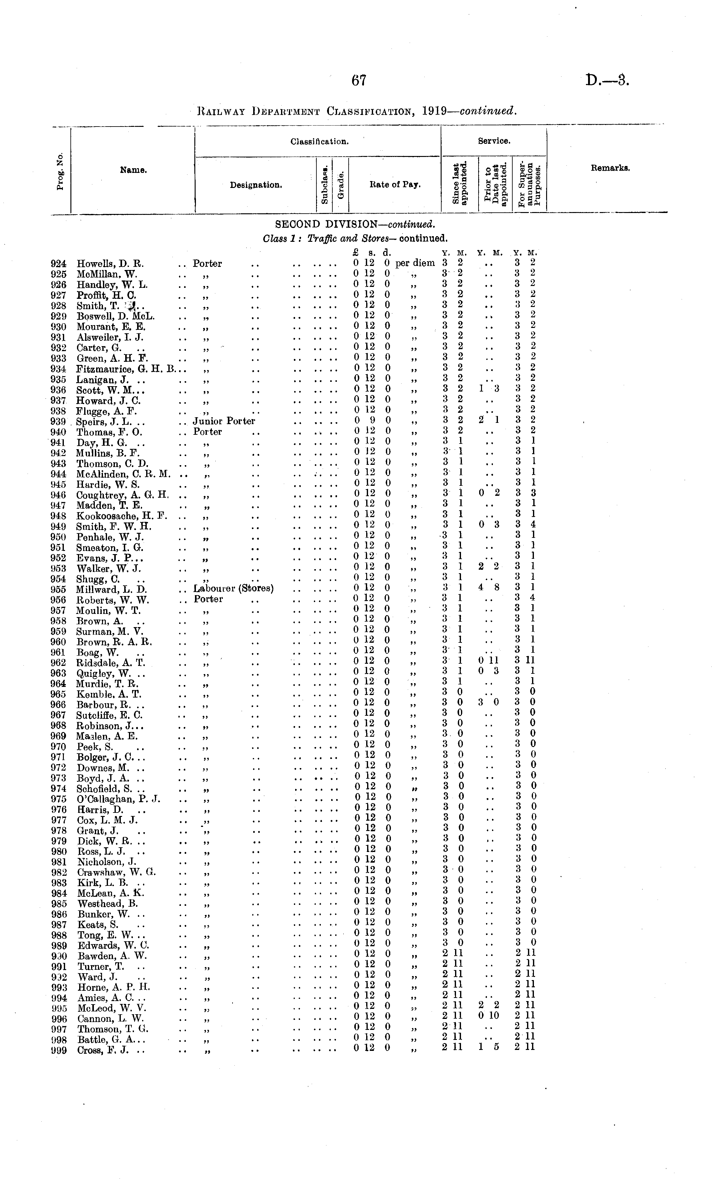 Classification. Service. 6 X A o fc ft Name. Designation. ■ 5 e £ -a O ed A fc 3 O CO Rate of Pay. «ge oco£ sos CO h3 hi. co hj Pi-fc £ rc.9 O'aSO 8 8 SSS ga fc co a fc a S Remarks. SECOND DIVISION— continued. Class 1 : Traffic and Stores— oontinuei sd. £ s. d. 924 Howolls, D. R. .. Porter .. 0 12 0 per diem 925 McMillan. W. .. „ .. 0 12 0 926 Handley, W. L. .. „ .. 0 12 0 927 Promt, H. 0. .. „ .. 0 12 0 928 Smith, T. SJ.. .. „ .. 0 12 0 929 Boswell, D. McL. .. „ .. 0 12 0 930 Mourant, E. E. „ .. 0 12 0 931 Alsweiler, I. J. .. „ .. 0 12 0 932 Carter, G. .. .. „ .. 0 12 0 933 Green, A. H. F. .. „ .. 0 12 0 934 Fitzmaurice, G. H. B... „ .. 0 12 0 935 Lanigan, J. .. .. „ .. 0 12 0 936 Scott, W. M... .. „ .. 0 12 0 937 Howard, J. C. .. „ .. 0 12 0 938 Fluggo, A. F. .. „ .. 0 12 0 939 Spoils, J. L. .. .. Junior Porter 0 9 0 940 Thomas, F. O. .. Porter .. 0 12 0 941 Day, H. G. .. .. ,, .. 0 12 0 942 Mu'llins, B. F. .. „ .. 0 12 0 943 Thomson, CD .. 0 12 0 944 McAlinden, C R. M. .. „ .. ...... 0 12 0 945 Hardie, W. S. .. „ .. 0 12 0 946 Coughtrey, A. G. H. .. „ .. 0 12 0 947 Madden, T. E. .. „ .. 0 12 0 948 Kookoosache, H. F .. 0 12 0 949 Smith, F. W. H. .. „ .. 0 12 0 950 Penhale, W. J. .. „ .. 0 12 0 951 Smeaton, I. G. .. „ .. 0 12 0 952 Evans, J. P... .. „ •• 0 12 0 953 Walkor, W. J. .. „ .. 0 12 0 954 Shugg, C .. .. „ .. 0 12 0 955 Millward, L. D. .. Labourer (Stores) 0 12 0 956 Roberts, W. W. .. Porter .. 0 12 0 957 Moulin, W. T. .. „ .. 0 12 0 958 Brown, A. .. .. „ . ■ 0 12 0 959 Surman, M. V. .. „ .. 0 12 0 960 Brown, R. A. R. .. „ .. 0 12 0 961 Boag, W. .. .. ., ■ • 0 12 0 962 Ridsdale, A. T. .. „ .. 0 12 0 963 Quigley, W. .. .. ,, .. 0 12 0 964 Murdie, T. R. .. „ .. 0 12 0 965 Komble, A. T. .. „ .. 0 12 0 966 Barbour, R. .. .. ,, .. 0 12 0 967 Sutclifle, E. C. •• „ ' .. 0 12 0 968 Robinson, J... .. ,, •• 0 12 0 969 Maslen, A. E. .. „ .. 0 12 0 970 Peek, S. .. .. ,, .. 0 12 0 971 Bolger, J. C... .. „ .. 0 12 0 972 Downes, M. .. .. „ .. 0 12 0 973 Boyd, J. A. .. .. „ .. 0 12 0 974 Schofield, S. .. .. ,, .. 0 12 0 975 O'Callaghan, P. J. .. „ .. 0 12 0 976 Harris, D. .. .. „ .. 0 12 0 977 Cox, L. M. J. .. „ .. 0 12 0 978 Grant, J. .. .. '., • • 0 12 0 979 Dick, W. H. .. .. „ • • 0 12 0 980 Ross, L. J. .. • • „ ■ ■ 0 12 0 981 Nicholson, J. .. „ ■ • 0 12 0 982 Crawshaw, W. G. .. „ ■ ■ 0 12 0 „ 983 Kirk, L. B. .. .. „ ■ • 0 12 0 984 McLean, A. K. .. „ •• 0 12 0 985 Westhead, B. „ .. 0 12 0 986 Bunker, W. .. .. „ • ■ 0 12 0 987 Keats, S. .. •• ,, •• 0 12 0 988 Tong, E. W. .. • • „ • • 0 12 0 989 Edwards, W. 0. .. „ .. 0 12 0 930 Bawden, AW. • ■ „ ■ • 0 12 0 991 Turner, T. .. ..'.., • • 0 12 0 932 Ward, J. .. .. „ • • 0 12 0 993 Home, A. P. H .. 0 12 0 994 Amies, A. C .. . ■ „ ■ • 0 12 0 995 McLeod, W. V. .. „ .. 0 12 0 996 Cannon, L. W. .. „ • • 0 12 0 „ 997 Thomson, T. G. .. „ . ■ 0 12 0 998 Battle, G. A... .. „ .. 0 12 0 999 Cross, F. J. .. .. „ • ■ 0 12 0 Y. M. Y. M. 3 2 3 2 3-2 3 2 3 2 3 2 3 2 3 2 3 2 3 2 3 2 3 2 3 2 13 3 2 3 2 3 2 2 1 3 2 3 1 3 1 3 1 3 1 3 1 3 1 0 2 3 1 3 1 3 10 3 3 1 3 1 3 1 3 12 2 3 1 3 1 4 8 3 1 3 1 3 1 3 1 3 1 3 1 3 1 0 11 3 10 3 3 1 3 0 3 0 3 0 3 0 3 0 3 0 3 0 3 0 3 0 3 0 3 0 3 0 3 0 3 0 3 0 3 0 3 0 3 0 30 3 0 3 0 3 0 3 0 3 0 3 0 3 0 2 11 2 11 2 II 2 11 2 11 2 11 2 2 2 11 0 10 2 11 2 11 2 11 15 Y. M. 3 2 3 2 3 2 3 2 3 2 3 2 3 2 3 2 3 2 3 2 3 2 3 2 3 2 3 2 3 2 3 2 3 2 3 1 3 1 3 1 3 1 3 1 3 3 3 1 3 1 3 4 3 1 3 1 3 1 3 1 3 1 3 1 3 4 3 1 3 1 3 I 3 1 3 1 3 11 3 1 3 1 3 0 3 0 3 0 3 0 3 0 3 0 3 0 3 0 3 0 3 0 3 0 3 0 3 0 3 0 3 0 3 0 3 0 3 0 3 0 3 0 3 0 3 0 3 0 3 0 3 0 2 11 2 11 2 11 2 11 2 11 2 11 2 11 2 11 2 11 2 11