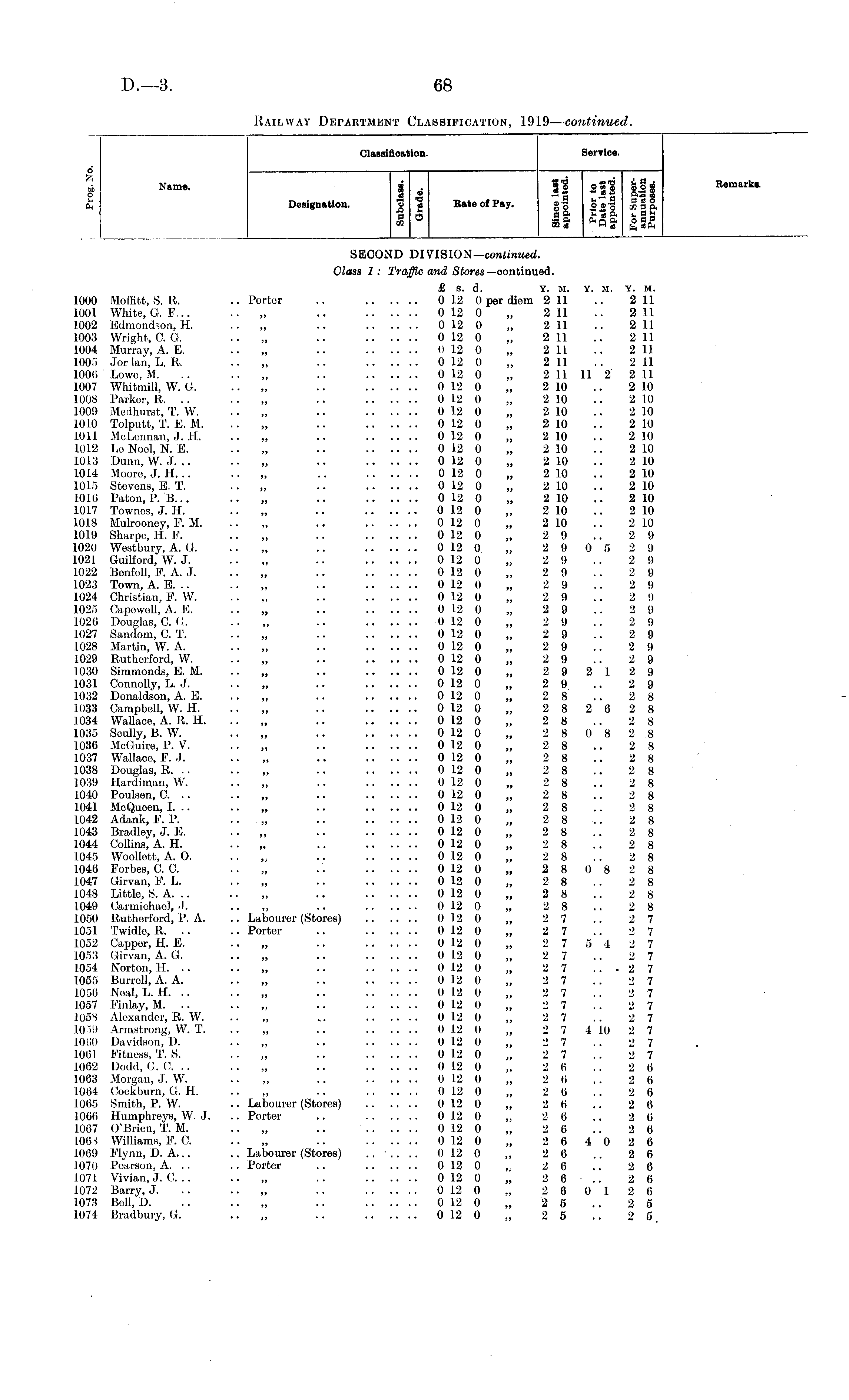 Classification. Service. 6 A, A o ft Name. a"> as id o J3 3 OS 32 - a o--fl 2 fl g sss a to co alt >--a •2 2'3 P < & ft 0 o, ill PlH IO 3 a! o os 3 a fc ss o a 3 h*ft Kemarks. Designation. & Bate of Fay. SECOND DIVISION— continued. Class 1 : Traffic and Stores —continued. 1000 Moffitt, S. R. 1001 White, G. F,.. 1002 Edmondson, H. 1003 Wright, C G. 1004 Murray, A. E. 1005 Jor Ian, L. R, 1006 Lowo, M. 1007 Whitmill, W. G. 1008 Parker, R. .. 1009 Medhurst, T. W. 1010 Tolputt, T. E. M. 1011 McLonnan, J. H. 1012 Lo Noel, N. E. 1013 Dunn, W.J. .. 1014 Mooro, J. H. .. 1015 Stevens, E. T. 1016 Paton, P. B... 1017 Townos, J. H. 1018 Mulroonoy, F. M. 1019 Sharpe, H. F. 1020 Westbury, A. G. 1021 Guilford, W. J. 1022 Benfell, F. A. J. 1023 Town, A. E. .. 1024 Christian, F. W. 1025 Capewoll, A. K. 1026 Douglas, C G. 1027 Sandom, C T. 1028 Martin, W. A. 1029 Rutherford, W. 1030 Simmonds, E. M. 1031 Connolly, L. J. 1032 Donaldson, A. E. 1033 Campbell, W. H. 1034 Wallace, A. R. H. 1035 Scully, B. W. 1036 McGuire, P. V. 1037 Wallace, F. J. 1038 Douglas, R. .. 1039 Hardiman, W. 1040 Poulsen, C .. 1041 McQuoen, I. .. 1042 Adank, F. P. 1043 Bradley, J. E. 1044 Collins, A. H. 1045 Woollott, A. O. 1046 Forbes, C. 0. 1047 Girvan, F. L. 1048 Little, S. A. 1049 Carmiohae), J. 1050 Rutherford, P. A. 1051 Twidlc, R. .. 1052 Capper, H. E. 1053 Girvan, A. G. 1054 Norton, H. .. 1055 Burrell, A. A. 1050 Noal, L. H. .. 1057 Finlay, M. .. 1058 Alexander, R. W. 1059 Armstrong, W. T. 1060 Davidson, D. 1061 Fitness, T. S. 1062 Dodd, G. C. 1063 Morgan, J. W. 1064 Cockburn, G. H. 1065 Smith, P. W. 106(i Humphreys, W. J. 1067 O'Brien, T. M. 106-i Williams, F. 0. 1069 Flynn, D. A... 1070 Pearson, A. .. 1071 Vivian, J. C... 1072 Barry, J. 1073 Bell, D. 1074 Bradbury, G. £ S. d. Y. M. Y. M. Y. M. .. Porter .. 0 12 0 per diem 2 11 .. 2 11 0 12 0 „ 2 11 .. 2 11 .. „ .. 0 12 0 „ 2 11 .. 2 11 0 12 0 „ 2 11 .. 2 11 0 12 0 „ 2 11 .. 2 11 0 12 0 „ 2 11 .. 2 11 0 12 0 „ 2 11 11 2 2 11 0 12 0 „ 2 10 .. 2 10 0 12 0 „ 2 10 .. 2 10 0 12 0 „ 2 10 .. 2 10 0 12 0 „ 2 10 .. 2 10 0 12 0 „ 2 10 .. 2 10 0 12 0 „ 2 10 .. 2 10 0 12 0 „ 2 10 .. 2 10 0 12 0 „ 2 10 .. 2 10 0 12 0 „ 2 10 .. 2 10 0 12 0 „ 2 10 .. 2 10 0 12 0 „ 2 10 .. 2 10 0 12 0 „ 2 10 .. 2 10 0 12 0 „ 2 9 .. 2 9 0 12 0 „ 2 9 0 5 2 9 0 12 0 „ 2 9 .. 2 9 0 12 0 „ 2 9 .. 2 9 0 12 0 „ 2 9 .. 2 9 0 12 0 „ 2 9 .. 2 9 „ .. 0 12 0 „ 2 9 .. 2 9 0 12 0 „ 2 9 .. 2 9 0 12 0 „ 2 9 .. 2 9 0 12 0 „ 2 9 .. 2 9 0 12 0 „ 2 9 .. 2 9 0 12 0 „ 2 9 2 12 9 0 12 0 „ 2 9 .. 2 9 0 12 0 „ 2 8 .. 2 8 0 12 0 „ 2 8 2 6 2 8 0 12 0 „ 2 8 .. 2 8 0 12 0 „ 2 8 0 8 2 8 0 12 0 „ 2 8 .. 2 8 0 12 0 „ 2 8 .. 2 8 0 12 0 „ 2 8 .. 2 8 0 12 0 „ 2 8 .. 2 8 0 12 0 „ 2 8 .. 2 8 0 12 0 „ 2 8 .. 2 8 .. „ .. 0 12 0 „ 2 8 .. 2 8 .. ,, .. 0 12 0 „ 2 8 .. 2 8 .. „ .. 0 12 0 „ 2 8 .. 2 8 0 12 0 „ 2 8 .. 2 8 0 12 0 „ 2 8 0 8 2 8 0 12 0 „ 2 8 .. 2 8 0 12 0 „ 2 8 .. 2 8 0 12 0 „ 2 8 .. 2 8 .. Labourer (Stores) 0 12 0 „ 2 7 .. 2 7 .. Porter .. 0 12 0 „ 2 7 .. 2 7 0 12 0 „ 2 7 5 4 2 7 0 12 0 „ 2 7 .. 2 7 0 12 0 „ 2 7 ... 2 7 0 12 0 „ 2 7 .. 2 7 0 12 0 „ 2 7 .. 2 7 0 12 0 „ 2 7 .. 2 7 0 12 0 „ 2 7 .. 2 7 0 12 0 „ 2 7 4 10 2 7 0 12 0 „ 2 7 .. 2 7 0 12 0 „ 2 7 .. 2 7 0 12 0 „ 2 6 .. 2 6 0 12 0 „ 2 6 .. 2 6 0 12 0 „ 2 0 .. 2 6 .. Labourer (Stores) 0 12 0 „ 2 6 .. 2 6 .. Porter .. 0 12 0 „ 2 6 .. 2 6 0 12 0 „ 2 6 .. 2 6 0 12 0 „ 2 6 4 0 2 6 .. Labourer (Stores) ....... 0 12 0 ,, 26 .. 26 .. Porter .. 0 12 0 , 2 6 .. 2 6 0 12 0 „ 2 6.. 2 6 0 12 0 „ 2 6 0 12 6 0 12 0 „ 2 5 .. 2 5 0 12 0 „ 2 5 .. 2 5