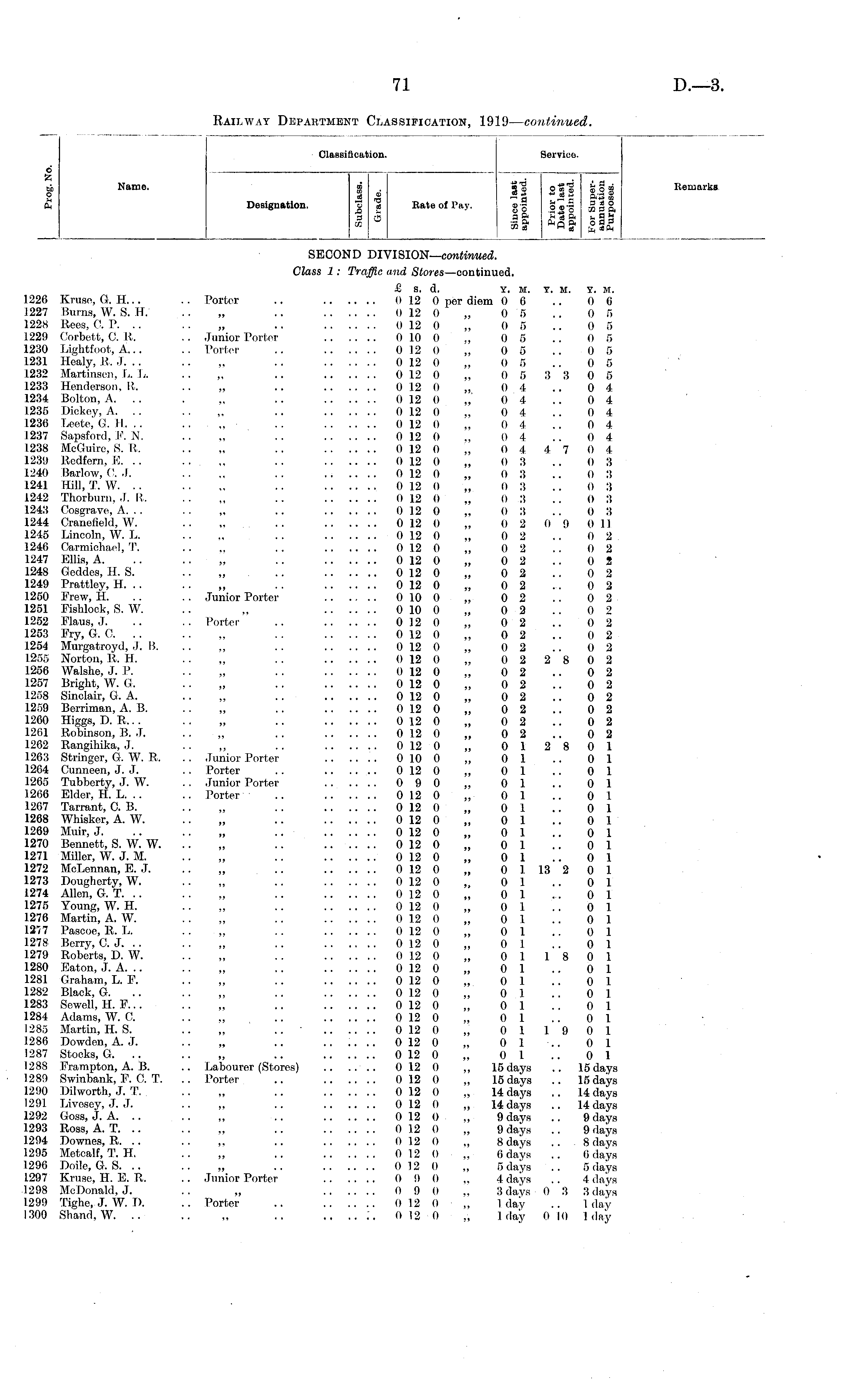 Classi: ication. Service. o A t& o Name. m £ -g 2 S I « Bate of Pay. 11 alt |J| _, fi) -r H D j3 O So ojg'S aipp, ■ - g. Ph a a oss Remarks Designation. SECOl ND DIVISION— continued. Class 1 : Traffic and Stores —continued. 1226 Kruse, G. H... 1227 Burns, W. S. H. 1228 Rees, 0. P. 1229 Corbett, C R. 1230 Lightfoot, A... 1231 Healy, R, J. .. 1232 Martinson, L. L. 1233 Henderson, R. 1234 Bolton, A. . . 1235 Dickey, A. .. 1236 Leete, G. II. .. 1237 Sapsford, F. N. 1.238 McGuire, S. R. 1239 Redfern, E. .. 1240 Barlow, C. .1. 1241 Hill, T. W. .. 1242 Thorburn, J. R. 1243 Cosgrave, A. . . 1244 Cranefield, W. 1245 Lincoln, W. L. 1246 Oarmionael, T. 1247 Ellis, A. 1248 Geddes, H. S. 1249 Prattley, H. . . 1250 Frew, H. 1251 Fishlock, S. W. 1252 Flaus, J. 1253 Fry, GO. 1254 Murgatroyd, J. B. 1255 Norton, R. H. 1256 Walshe, J. P. 1257 Bright, W. G. 1258 Sinclair, G. A. 1259 Berriman, A. B. 1260 Higgs, D. R.. . 1261 Robinson, B. J. 1262 Rangihika, J. 1263 Stringer, G. W. R. 1264 Cunneen, J. J. 1265 Tubberty, J. W. 1266 Elder, H. L. .. 1267 Tarrant, C B. 1268 Whisker, A. W. 1269 Muir, J. 1270 Bennett, S. W. W. 1271 Miller, W. J. M. 1272 McLennan, E. J. 1273 Dougherty, W. 1274 Allen, G. T. 1275 Young, W. H. 1276 Martin, A. W. 1277 Pascoe, R. L. 1278 Borry, C.J. 1279 Roberts, D. W. 1280 Eaton, J. A. .. 1281 Graham, L. F. 1282 Black, G. 1283 Sewell, H. F... 1284 Adams, W. 0. 1285 Martin, H. S. 1286 Dowden, A. J. 1287 Stocks, G. .. 1288 Frampton, A. B. 1289 Swinbank, F. C. T. 1290 Dilworth, J. T. 1291 Livesey, J. J. 1292 Goss, j. A. 1293 Ross, A. T. 1294 Downes, R. .. 1295 Metcalf, T. H. 1296 Doile, G. S. 1297 Kruse, H. E. R. 1298 McDonald, J. 1299 Tighe, J. W. T). 1300 Shand, W. .. Porter ,, Junior Porter Porter ,, ,, ,, Junior Porter Porter ,, . . . • .Tunior Porter Porter Junior Porter Porter ,, .... ,, .. Labourer (Stores) Porter ,, . . . . ,, Junior Porter ,, • • Porter £ S. d. Y. M. Y. M. .... 0 12 0 per diem 06 .... 0 12 0 „ 0 5 .... 0 12 0 ,", 0 5 .... 0 10 0 ., 0 5 .... 0 12 0 „ 0 5 .... 0 12 0 „ 0 5 .... 0 12 0 „ 0 5 3 3 .... 0 12 0 „ 04 .... 0120 „' 04 .... 0 12 0 „ 0 4 .... 0 12 0 „ 0 4 .... 0 12 0 „ 0 4 .... 0 12 0 „ 04 47 .... 0 12 0 „ 0 3 .... 0 12 0 „ 0 3 .... 0 12 0 „ 0 3 .... 0 12 0 „ 0 3 .... 0 12 0 „ 0 3 .... 0 12 0 „ 0 2 0 9 .... 0 12 0 „ 02 .... 0 12 0 „ 0 2 .... 0 12 0 „ 0 2 .... 0 12 0 „ 0 2 .... 0 12 0 „ 0 2 .... 0 10 0 „ 0 2 .... 0 10 0 „ 02 .... 0 12 0 „ 0 2 .... 0 12 0 „ 02 .... 0 12 0 „ 02 .... 0 12 0 „ 0 2 2 8 .... 0 12 0 „ 0 2 .... 0 12 0 „ 0 2 .... 0 12 0 „ 0 2 .... 0 12 0 „ 0 2 .... 0 12 0 „ 0 2 .... 0 12 0 „ 0 2 .... 0 12 0 „ 0 1 2 8 .... 0 10 0 „ 0 1 .... 0 12 0 „ 0 1 .... 090 „ 01 .... 0 12 0 „ 0 1 .... 0 12 0 „ 0 1 .... 0 12 0 „ 0 1 .... 0 12 0 „ 0 1 .... 0 12 0 „ 01 .... 0 12 0 „ 0 1 .... 0 12 0 „ 0 1 13 2 .... 0 12 0 „ 0 1 .... 0 12 0 „ 0 1 .... 0 12 0 „ 01 .... 0 12 0 „ 0 1 .... 0 12 0 „ 0 1 .... 0 12 0 „ 0 1 .... 0 12 0 „ 0 1 18 .... 0 12 0 „ 0 1 .... 0 12 0 „ 0 1 .... 0 12 0 „ 0 1. .... 0 12 0 „ 0 1 .... 0 12 0 „ 0 1 .... 0 12 0 „ 0 1 19 .... 0120 „ 01 .... 0 12 0 „ 01 .... 0 12 0 ,, 15 days .... 0 12 0 „ 15 days .. .... 0 12 0 „ 14 days .. .... 0 12 0 „ 14 days .... 0120 „ 9 days .... 0 12 0 „ 9 days .... 0 12 0 „ 8 days .. - .... 0 12 0 „ 6 days .. .... 0 12 0 „ 5 days .... 090 „ 4 days .. .. .. 0 9 0 „ 3 days 0 3 .... 0 12 0 ,, I day .. .". 0 12 0 „ Iday 0 10 Y. M. 0 6 0 5 0 5 0 5 0 5 0 5 0 5 0 4 0 4 0 4 0 4 0 4 0 4 0 3 0 3 0 3 0 3 0 3 0 11 0 2 0 2 o a 0 2 0 2 0 2 0 2 0 2 0 2 0 2 0 2 0 2 0 2 0 2 0 2 0 2 0 2 0 1 0 1 0 1 0 1 0 1 0 1 0 1 0 1 0 1 0 1 0 1 0 1 0 1 0 1 0 1 0 1 0 1 0 1 0 1 0 1 0 1 0 1 0 1 0 1 0 1 0 1 15 days 15 days 14 days 14 days 9 days 9 days 8 days 6 days 5 (lays 4 days 3 days 1 clay I day