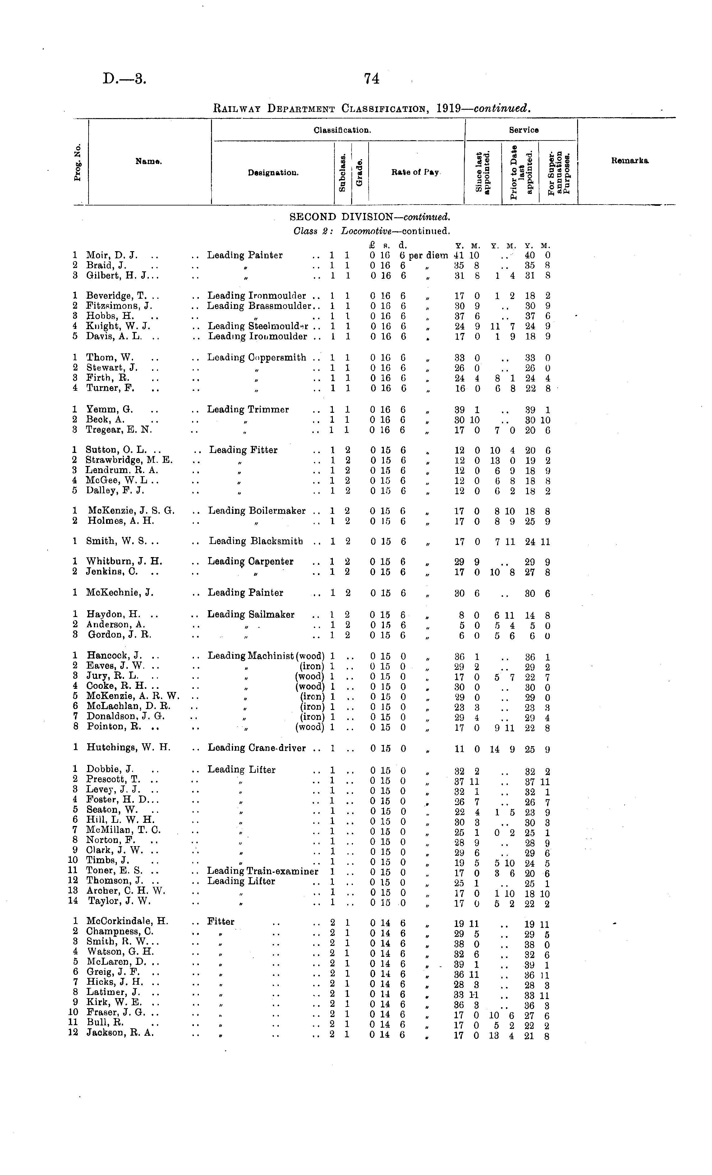 Classification. Service 6 A u o u £ & Namo. o fc ft Namo. 3'- £S o.s ys Designation. f 1 Rate of I'ay g-3 2 %■% Jgf » a aa g"a fc2i DefliKU&tion. ■ _ | & \ « o at fi >■> a 0 02 Rate of I'ay 11 o.3 « O a a $3 o "3 *o fc S m O® ® 2 S O cc a 3 a. 0 ■*-* * o cd n At .2 a Sos »-t tf ft, sOPh Ph Kemarks. Ss ° 5 .2 S 5 * SECOND DIVISION— continued. Class 2: Locomotive— continued. 1 Moir, D. J. .. 2 Braid, J. 3 Gilbert, H.J... £ 8. d. Y. M. Y. M. Y. M. .. Leading Painter ..11 0 16 6 per diem 41 10 .. 40 0 ..11 0166 35 8 35 8 .. 1 1 0 16 6 „ 31 8 1 4 31 8 1 Beveridge, T. .. 2 Fitzsimons, J. 3 Hobbs, H. .. 4 Knight, W. J. 5 Davis, A. L. .; .. Leading Ironmoulder ..11 0 16 6 „ 17 0 1 2 18 2 .. Leading Brassmoulder.. 1 1 0 16 6 „ 30 9 .. 30 9 .. 1 1 0 10 6 37 6 .. 37 6 .. Leading Steelmould-r .. 11 0 10 0 „ 24 9 11 7 24 9 .. Leading Ironmoulder ..11 0 16 6 . 17 0 1 9 18 9 1 Thorn, W. 2 Stewart, J. 3 Firth, R. 4 Turner, F. .. Leading Oopporsmith ..11 0 16 6 „ 33 0 .. 33 0 ..110 16 6 „ 26 0 .. 20 0 .. 1 1 0 16 6 „ 24 4 8 1 24 4 ..11 0 10 0 „ 16 0 6 8 22 8 1 yemm, G. 2 Beck, A. 3 Tregear, E. N. .. Leading Trimmer ..11 0 10 0 „ 39 1 .. 39 1 ..11 0 16 6 „ 30 10 30 10 .. 1 1 0 10 6 „ 17 0 7 0 20 0 1 Sutton, 0. L. 2 Strawbridge, M. E. 3 Lendrum. R. A. 4 McGee, W. L .. 5 Dalley, F. J. .. Leading Fitter ..12 0 15 6 „ 12 0 10 4 20 6 .. 1 2 0 15 6 „ 12 0 18 0 19 2 .. 1 2 0 15 6 12 0 6 9 18 9 .. 1 2 0 15 6 „ 12 0 0 8 18 8 .. 1 2 0 15 6 12 0 6 2 18 2 1 MoKenzie, J. S. G. 2 Holmes, A. H. .. Leading Boilermaker ..12 0 15 0 „ 17 0 8 10 18 8 ..12 0 15 6 „ 17 0 8 9 25 9 1 Smith, W. S. .. .. Leading Blacksmith ..12 0 15 6 „ 17 0 7 11 24 11 1 Whitburn, J. H. 2 Jenkins, C. .. Leading Oarponter ..12 0 15 6 „ 29 9 .. 29 9 ..12 0 15 6 „ 17 0 10 8 27 8 1 McKechnie, J. .. Leading Painter ..12 0 15 6 „ 30 0 .. 30 6 1 Haydon, H. .. 2 Anderson, A. 3 Gordon, J. R. .. Leading Sailmaker ..12 0 15 6 „ 8 0 6 11 14 8 .. 1 2 0 15 6 5 0 5 4 5 0 ...12 0 15 6 „ 6 0 5 6 6 0 1 Hanoock, J. 2 Eaves, J. W. 3 Jury, R. L. 4 Cooke, R. H. .. 5 McKenzie, A, R. W. 6 McLachlan, D. R. 7 Donaldson, J. G. 8 Pointon, R. .. .. Leading Machinist (wood) 1 .. 0 15 0 „ 36 1 .. 86 1 (iron) 1 .. 0 15 0 , 29 2 29 2 (wood) 1 .. 0 15 0 „ 17 0 5 7 22 7 (wood) 1 .. 0 15 0 „ 30 0 .. 30 0 (iron) 1 .. 0 15 0 „ 29 0 .. 29 0 (iron) 1 .. 0 15 0 „ 23 3 .. 23 3 (iron) 1 .. 0 15 0 „ 29 4 .. 29 4 (wood) 1 .. 0 15 0 „ 17 0 9 11 2-2 8 1 Hutchings, W. H. .. Leading Crane-drivor .. 1 .. 0 15 0 „ 11 0 14 9 25 9 1 Dobbie, J. 2 Prescott, T. .. 3 Levey, J. J. 4 Foster, H. D... 5 Seaton, W. .. 6 Hill, L. W. H. 7 McMillan, T. 0. 8 Norton, F. .. 9 Clark, J. W. .. LO Timbs, J. LI Toner, E. S. 12 Thomson, J. .. L3 Aroher, C. H. W. 14 Taylor, J. W. .. Leading Lifter .. 1 .. 0 15 0 „ 32 2 .. 32 2 •• 1 •• 0 15 0 „ 37 11 .. 37 11 • ■ 1 .. 0 15 0 , 32 1 .. 32 1 ■• 1 •• 0 15 0 , 26 7 .. 26 7 •• 1 •• 0 15 0 22 4 1 5 23 9 ■ • 1 • ■ 0 15 0 „ 30 3 .. 30 3 .. 1 .. 0 15 0 25 1 0 2 25 1 • ■ 1 • • 0 15 0 „ 28 9 28 9 •• 1 ■■ 0 15 0 „ 29 6 29 6 •• 1 •• 0 15 0 „ 19 5 5 10 24 5 .. Leading Train-oxamiuer 1 .. 0 15 0 „ 17 0 3 6 20 6 .. Leading Lifter .. 1 .. 0 15 0 „ 25 1 .. 25 1 ■• 1 •• 0 15 0 „ 17 0 1 1.0 18 10 ■• 1 ■• 0 15 0 „ 17 0 5 2 22 2 1 McCorkindale, H. 2 Champness, C 3 Smith, R. W. .. 4 Watson, G. H. 5 McLaren, D. .. 6 Greig, J. F. 7 Hicks, J. H. 8 Latimer, J. 9 Kirk, W. E. 10 Fraser, J. G. 11 Bull, R. 12 Jackson, R. A. •• Fit 'er .. ..2 1 0 14 6 , 19 11 .. 19 11 • •2 1 0 14 6 „ 29 5 29 5 • •2 1 0 14 6 „ 38 0 38 0 ■•2 1 0 14 6 „ 32 6 .. 32 6 • •2 1 0 14 6 , .39 1 .. 39 1 ••2 1 0 14 6 „ 36 11 36 11 ••2 1 0 14 0 „ 28 3 28 3 ••2 1 0 11 6 , 33 11 .. 33 11 ••21 0 14 6 „ 36 3 .. 36 3 ■ •21 0 14 6 „ 17 0 10 6 27 6 • •2 1 0 1.4 6 „ 17 0 5 2 22 2 • •2 1 0 14 6 , 17 0 13 4 21 8