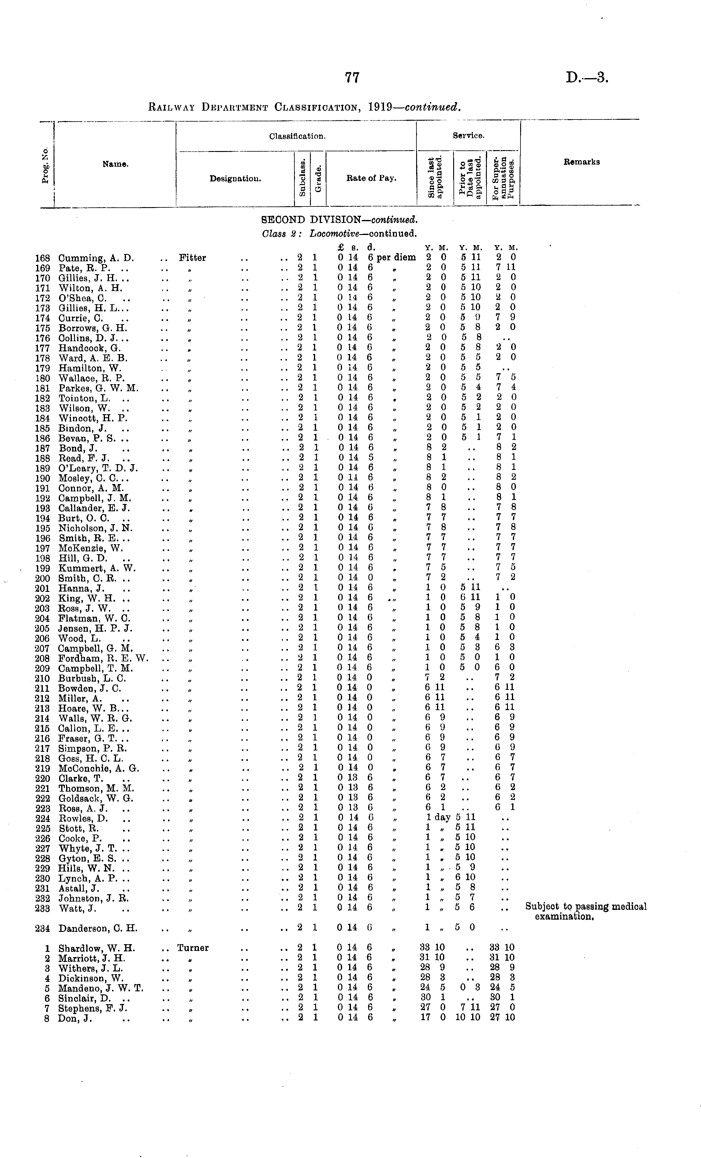 6 tj, Name. o fi ft Classification. s 4 2 $ 3 O on 12 Si? |.2S ■-I — J£ % cq fi,-2 i: B 3 <c o So .253 m a a aft -fccagi m & D a ° 9 3 02 eg M ci £q <£ft Service. Remarks Designation. Rate of Fay. SECOND DIVISION— continued. Class 2 : Locomotive —continued. 168 Cumming, A. D. 169 Pate, R. P. 170 Gillies, J. H. .. 171 Wilton, A. H. 172 O'Shea, 0. 173 Gillies, H. L... 174 Currie, 0. 175 Borrows, G. H. 170 Collins, D. J. .. 177 Handcock, G. 178 Ward, A. E. B. 179 Hamilton. W. 180 Wallace, R. P. 181 Parkes, G. W. M. 182 Tointon,L. .. 183 Wilson, W. .. 184 Winoott, H. P. 185 Bindon, J. .. 186 Bevan, P. S. 187 Bond, J. 188 Read, F. J. 189 O'Leary, T. D. J. 190 Mosley, 0. 0. .. 191 Connor, A. M. 192 Campbell, J. M. 193 Callander, E. J. 194 Burt, O. O. 195 Nicholson, J. N. 196 Smith, R. E. .. 197 McKenzie, W. 198 Hill, G. D. 199 Kummert, A. W. 200 Smith, C. R. 201 Hanna, J. 202 King, W. H. 203 Ross, J. W. 204 Flatman, W. 0. 205 Jensen, H. P. J. 206 Wood, L. 207 Campbell, G. M. 208 Fordham, R. E. W. 209 Campbell, T. M. 210 Burbush, L. 0. 211 Bowden, J. C. 212 Miller, A. 213 Hoare, W. B... 214 Walls, W. R. G. 215 Callon, L. E. .. 216 Fraser, G. T. .. 217 Simpson, P. R. 218 Goss, H. C. L. 219 McConohie, A. G. 220 Clarke, T. 221 Thomson, M. M. 222 Goldsack, W. G. 223 Ross, A. J. 224 Rowles, D. 225 Stott, R. 226 Cooke, P. 227 Whyte, J. T. 228 Gyton, E. S. .. 229 Hills, W. N. 230 Lynch, A. P. .. 231 Astall, J. 232 Johnston, J. R. 233 Watt, J. .. Fitter • • H £ s. d. Y. M. Y. II. Y. M. ..2 1 0 14 0 per diem 2 0 5 11 2 0 ..2 1 0 14 6 „ 2 0 5 11 7 11 ..21 0 14 6 „ 2 0 5 11 2 0 ..2 1 0 14 6 „ 2 0 5 10 2 0 ..2 1 0 14 6 „ 2 0 5 10 2 0 ..2 1 0 14 6 „ 2 0 5 10 2 0 ..2 1 0 14 6 „ 2 0 5 9 7 9 ..21 0 14 0 , 20 58 20 ..2 1 0 14 6 „ 2 0 5 8 ..2 1 0 14 6 „ 2 0 5 8 2 0 ..21 0 14 6 „ 20 55 20 ..21 0 14 6 „ 20 55 ..2 1 0 14 6 , 2 0 5 5 7 5 ..2 1 0 14 6 , 20 54 74 ..21 0 14 6 , 20 52 20 ..2 1 0 14 6 „ 2 0 5 2 2 0 ..21 0 14 6 „ 20 5120 ..2 1 0 14 6 „ 2 0 5 12 0 ..210 14 6 „ 20 51 71 ..2 1 0 14 6 „ 8 2 .. 8 2 ..21 0 14 6 „ 81 .. 81 ..2 1 0 14 6 „ 8 1 .. 8 1 ..21 0 116 „ 82 .. 82 ..21 0 14 6 „ 80 .. 80 ..2 1 0 14 6 „ 8 1 .. 8 1 ..2 1 0 14 6 „ 7 8 .. 7 8 ..21 0146 „ 77 .. 77 ..21 0 14 0 , 78 .. 78 ..2 1 0 14 0 „ 7 7 .. 7 7 ..2 1 0 14 6 „ 7 7 .. 7 7 ..2 1 0 14 6 „ 7 7 .. 7 7 ..21 0 14 0 , 75 .. 75 ..21 0 14 0 „ 72 .. 72 ..2 1 0 14 6 „ 1 0 5 11 ..2 1 0 14 6 .„ 10 0 11 10 ..21 0 14 6 „ 10 59 10 ..21 0 14 0 „ 10 58 10 ..21 0 14 6 „ 10 58 10 ..21 0 14 6 „ 10 54 10 ..2 1 0 14 6 „ 10 5 3 6 3 ..21 0 14 6 „ 105010 ..21 0 14 6 „ 10 50 60 ..2 1 0 14 0 „ 7 2 .. 7 2 ..2 1 0 14 0 „ 6 11 .. 6 11 ..2 1 0 14 0 „ 6 11 .. 6 11 ..2 1 0 14 0 „ 6 11 .. 6 11 ..2 1 0 14 0 „ 6 9 .. 6 9 ..21 0 14 0 „ 69 .. 69 ..2 1 0 14 0 „ 6 9 .. 6 9 ..2 1 0 14 0 „ 6 9 .. 6 9 ..2 1 0 14 0 „ 6 7 .. 6 7 ..2 1 0 14 0 , 6 7 .. 6 7 ..21 0 13 6 „ 67.. 67 ..2 1 0 13 6 „ 6 2.. 6 2 ..21 0 13 6 , 62.. 62 ..2 1 0 13 0 „ 6 1.. 6 1 ..21 0 14 (i „ 1 day 5 11 ..2 1 0 1.4 6 „ 1 , 5 11 ..2 1 0 14 6 „ 1 „ 5 10 ..2 1 0 14 6 „ 1 „ 5 10 ..2 1 0 14 6 „ 1 „ 5 10 ..21 0 14 6 „ 1 „ ■ 5 9 ..2 1 0 14 6 „ 1 „ 6 10 ..2 1 0 14 6 „ 1 „ 5 8 ..2 1 0 14 0 „ 1 „ 5 7 ..2 1 0 14 6 „ 1 „ 5 6 Subjoot to passing medical examination. 234 Danderson, 0. H. ..2 1 0 14 0 „ 1 „ 5 0 1 Shardlow, W. H. 2 Marriott, J. H. 3 Withers, J. L. 4 Dickinson, W. 5 Mandeno, J. W. T. 6 Sinclair, D. .. 7 Stephens, F. J. 8 Don, J. .. Turner ..2 1 0 14 6 , 33 10 .. 33 10 ..2 1 0 14 6 „ 31 10 .. 31 10 ..2 1 0 14 6 „ 28 9 .. 28 9 ..2 1 0 14 6 , 28 3 .. 28 3 ..2 1 0 14 6 , 24 5 0 3 24 5 ..2 1 0 14 6 „ 30 1 .. 30 1 ..2 1 0 14 6 » 27 0 7 11 27 0 ..21 0 14 0 „ 17 0 10 10 27 10