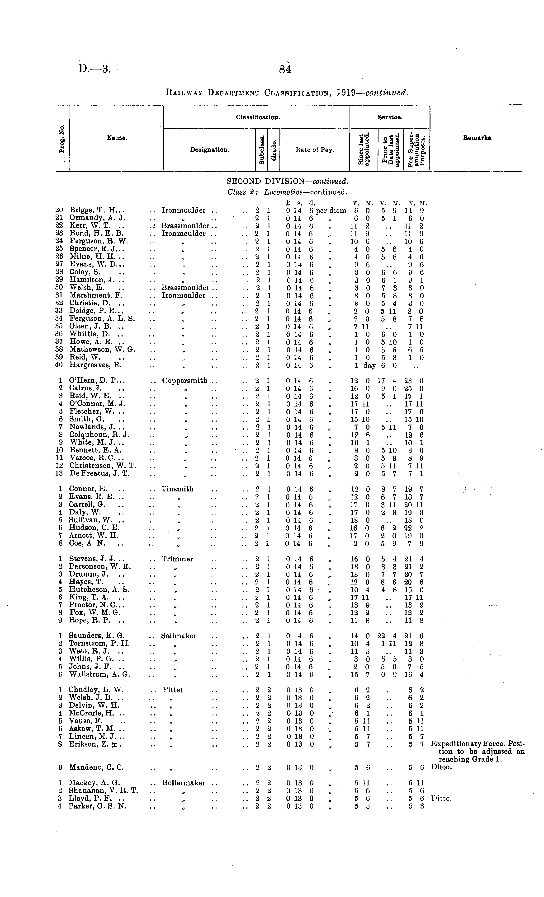 Classification. Service. 6 A oo o fc ft Name. <8 a u fi 0 82 81 ° S fl s.7 a alt in -1 a .2 2'S >• ca a fc a . 9 o as a-i- 9 313 S "2 a a. fc a fc o fl 3 ffc«ft Remarks. Designation 0 ■ 5 Kale of Pay. SECOND DIVISION— continued. Class 2: Locomotive —continued. 20 Briggs, T. H... 21 Ormandy, A. J. 22 Kerr, W. T. 23 Bond, H. E. B. 24 Ferguson, R. W. 25 Spencer, E. J... 26 Milne, H. H. .. 27 Evans, W. D... 28 Coley, S. 29 Hamilton, J. .. 30 Welsh, E. 31 Marshment, F. 32 Christie, D. .. 33 Doidge, P. E... 34 Ferguson, A. L. S. 35 Otten, J. B. 36 Whittle, D. .. 37 Howe, A. E. .. 38 Mathewson, W. G. 39 Reid, W. 40 Hargreaves, R. .. Ironmoulder .. .: Brassmoulder .. .. Ironmoulder .. . . Brassmoulder .. .. Ironmoulder .. £ g. d. Y. M. Y. M. Y. M. ..21 0 14 6 per diem 60 59119 2 1 0 14 6 „ 6 0 5 16 0 ..2 1 0 14 6 „ 11 2 .. 11 2 ..2 1 0 14 6 „ 119 .. 11 9 ..21 0 14 6 „ 10 6 .. 10 6 ..21 0 1.4 6 „ 405040 ..21 Oil Ii „ 405840 ..2 1 0 14 6 „ 9 6 .. 9 6 ..2 1 0 14 6 „ 3 0 0 6 9 6 ..21 014 6 „ 300 1 9 1 ..21 0 14 0 „ 307330 ..2 1 0 14 6 „ 3 0 5 8 3 0 ..2 1 0 14 6 „ 3 0 5 4 3 0 ..2 1 0 14 6 „ 2 0 5 11 2 0 ..2 1 0 14 6 „ 2 0 5 8 7 8 ..21 0 14 0 „ 711 .. 711 ..2 1 0 14 0 „ 10 6 0 10 ..21 0 14 6 „ 1 0 5 10 1 0 ..2 1 0 14 6 „ 10 5 5 6 5 ..2 1 0 14 6 „ 10 5 3 10 ..21 0146 „ 1 day 60 1 O'Hern.D. P... 2 Cairns, J. 3 Reid.W. E. .. 4 O'Connor, M. J. 5 Fletcher, W. .. 6 Smith, G. 7 Newlands, J. .. 8 Colquhoun, R, J. 9 White, M. J. .. 10 Bennett, E. A. 11 Vercoe, R. C .. 12 Christensen, W. T. 13 DeFreatus, J. T. .. Coppersmith .. ..2 1 0 14 6 „ 12 0 17 4 23 0 ..21 0 14 6 „ 16 0 9 0 25 0 ..2 1 0 14 0 „ 12 0 5 1 17 1 ..2 1 0 14 6 „ 17 11 .. 17 11 ..21 0 14 0 „ 17 0 .. 17 0 ..2 1 0 14 6 , 15 10 .. 15 10 ..2 1 0 14 6 „ 7 0 5 11 7 0 ..21 0 14 6 „ 12 6 .. 12 6 ..2 1 0 14 6 „ 10 1 10 1 -..21 0 14 6 „ 3 0 5 10 3 0 ..2 1 0 14 6 „ 3 0 5 9 8 9 ..2 1 0 14 6 „ 2 0 5 11 7 11 .. 2 1 0 14 6 „ 2 0 5 7 7 1 1 Connor, E. 2 Evans, E. E. 3 Carrel], G. 4 Daly, W. 5 Sullivan, W. .. 6 Hudson, 0. E. 7 Arnott, W. H. 8 Coe, A. N. .. .. Tinsmith ..2 1 0 14 6 „ 12 0 8 7 19 7 .. 2 I 0 14 6 „ 12 0 6 7 10 7 ..2 1 0 14 6 „ 17 0 3 11 20 11 ..21 0146 „ 17 0 2 3 19 3 ..2 1 0 14 6 „ 18 0 .. 18 0 ..21 0 14 6 „ 16 0 6 2 22 2 ..21 0 14 6 „ 17 0 2 0 19 0 ..2 1 0 14 0 „ 2 0 5 9 7 9 1 Stevens, J. J. .. 2 Parsonson, W. E. 3 Drumm, J. 4 Hayes, T. 5 Hutcheson, A. S. 6 King T. A. .. 7 Proctor, N. 0... 8 Fox, W. M. G. 9 Rope, R. P. .. Trimmer ..2 1 0 14 0 „ 16 0 5 4 21 4 ..2 1 0 14 6 „ 13 0 8 3 21 2 ..2 1 0 1.4 0 „ 13 0 7 7 20 7 ..2 1 0 14 6 „ 12 0 8 6 20 6 ..2 1 0 14 0 „ 10 4 4 8 15 0 ..2 1 0 14 6 „ 17 11 .. 17 11 ..21 0140 „ 13 9 .. 13 9 ..21 0 14 6 „ 12 2 .. 12 2 ..2 1 0 14 0 „ 11 8 .. 11 8 1 Saunders, E. G. 2 Tornstrom, P. H. 3 Watt, R. J. .. 4 Willis, P. G. .. 5 Johns, J. F. 6 Wallstrom, A. G. .. Sailmaker .. 2 1 0 14 6 „ 14 0 22 4 21 6 ..2 1 0 14 6 „ 10 4 1 11 12 3 ..2 1 0 14 6 „ 11 3 .. 11 3 ..2 1 0 14 0 „ 3 0 5 5 3 0 .. 2 1. 0 14 6 „ 2 0 5 0 7 5 ..2 1 0 14 0 „ 15 7 0 9 16 4 1 Ohudley, L. W. 2 Welsh, J. B. .. 3 Delvin, W. H. 4 MoCrorie, H. .. 5 Vause, F. 6 Askew, T. M. 7 Lineen, M. J. .. 8 Erikson, Z. £j . 9 Mandeno, C. 0. .. Fitter ..22 0 13 0 „ 62 .. 62 ..2 2 0 13 0 „ 0 2 .. 6 2 ..2 2 0 13 0 „ 6 2 .. 6 2 ..2 2 0 13 0 „• 6 1 .. 6 1 ..2 2 0 13 0 „ 5 11 .. 5 11 .. 2 2 0 13 0 „ 5 11 .. 5 11 .. 2 2 0 13 0 „ 5 7 .. 5 7 ..2 2 0 13 0 „ 5 7 .. 5 7 ExpeditionaryForoe. Position to be adjusted on reaching Grade 1. ..22 0 13 0 „ 56 .. 56 Ditto. 1 Maokey, A. G. 2 Shanahan, V. R. T. 3 Lloyd, P. F. .. 4 Parker, G. S. N. .. Boilermaker .. ..22 0 13 0 „ 5 11 .. 5 11 ..22 0 13 0 „ 56 .. 50 ..22 0 13 0 „ 56 .. 56 Ditto. ..22 0 13 0 „ 53 .. 53